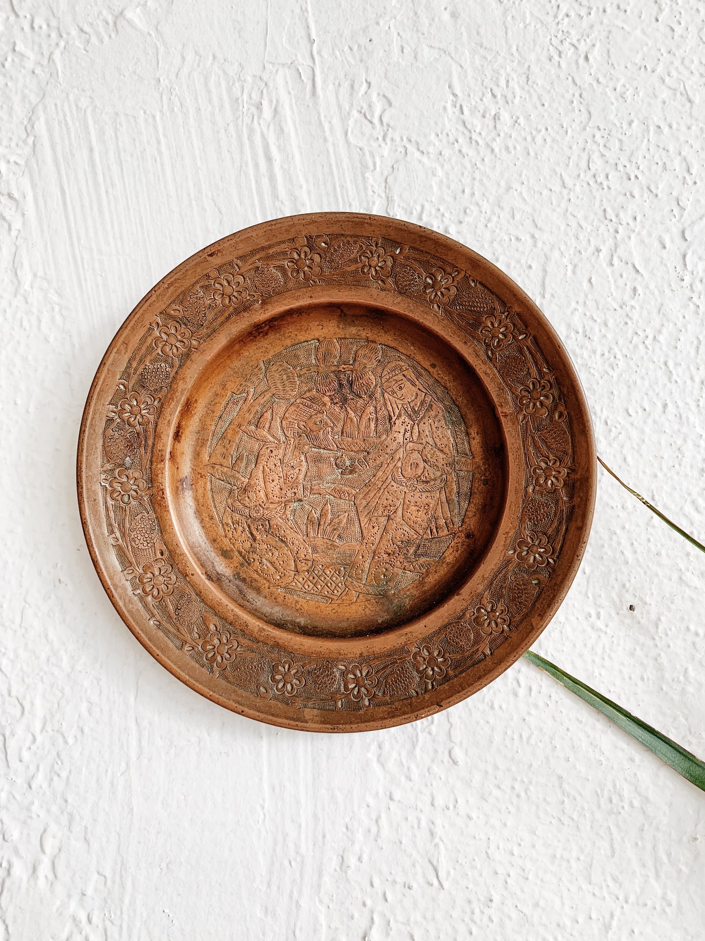 Lovely patina to this vintage copper dish. Has a hanger in back. Pictorial scene looks Persian.