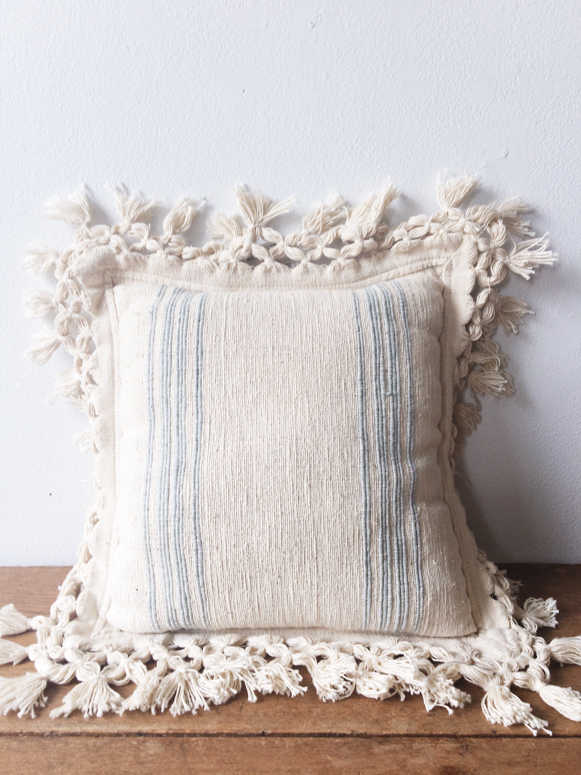 A very pretty vintage Indian cotton pillow with faint blue stripes on one side and solid cream on the other. Excellent condition.