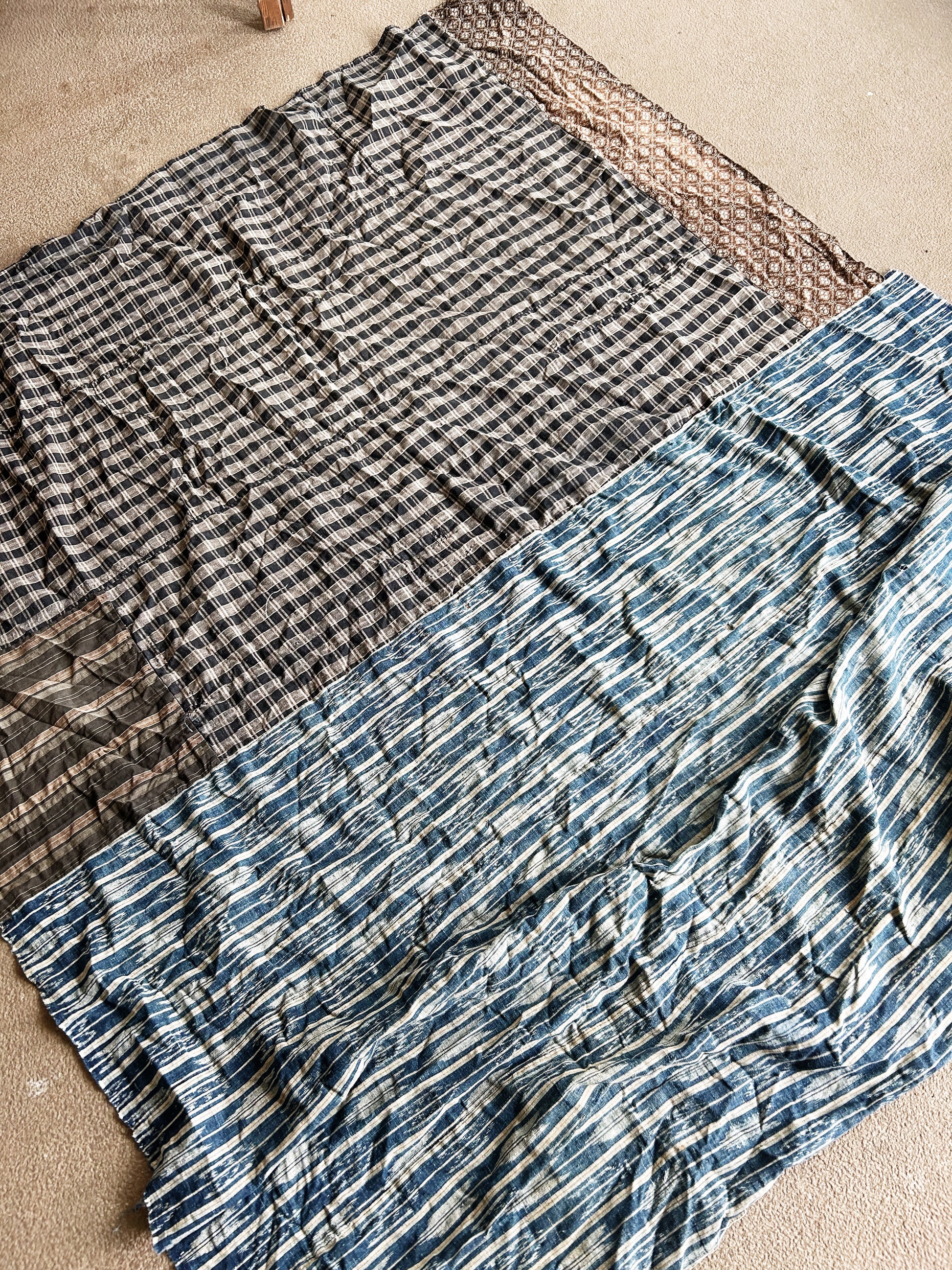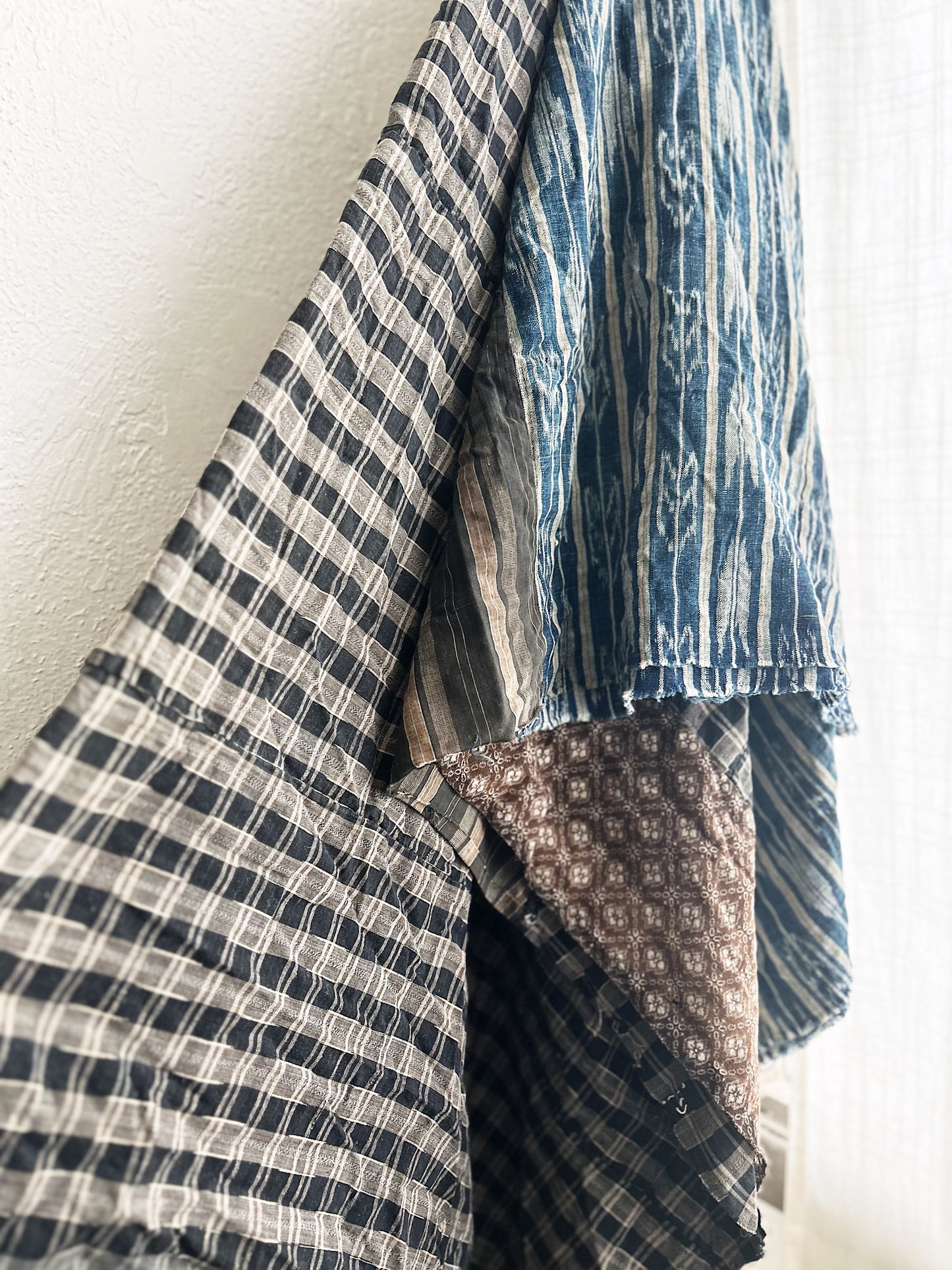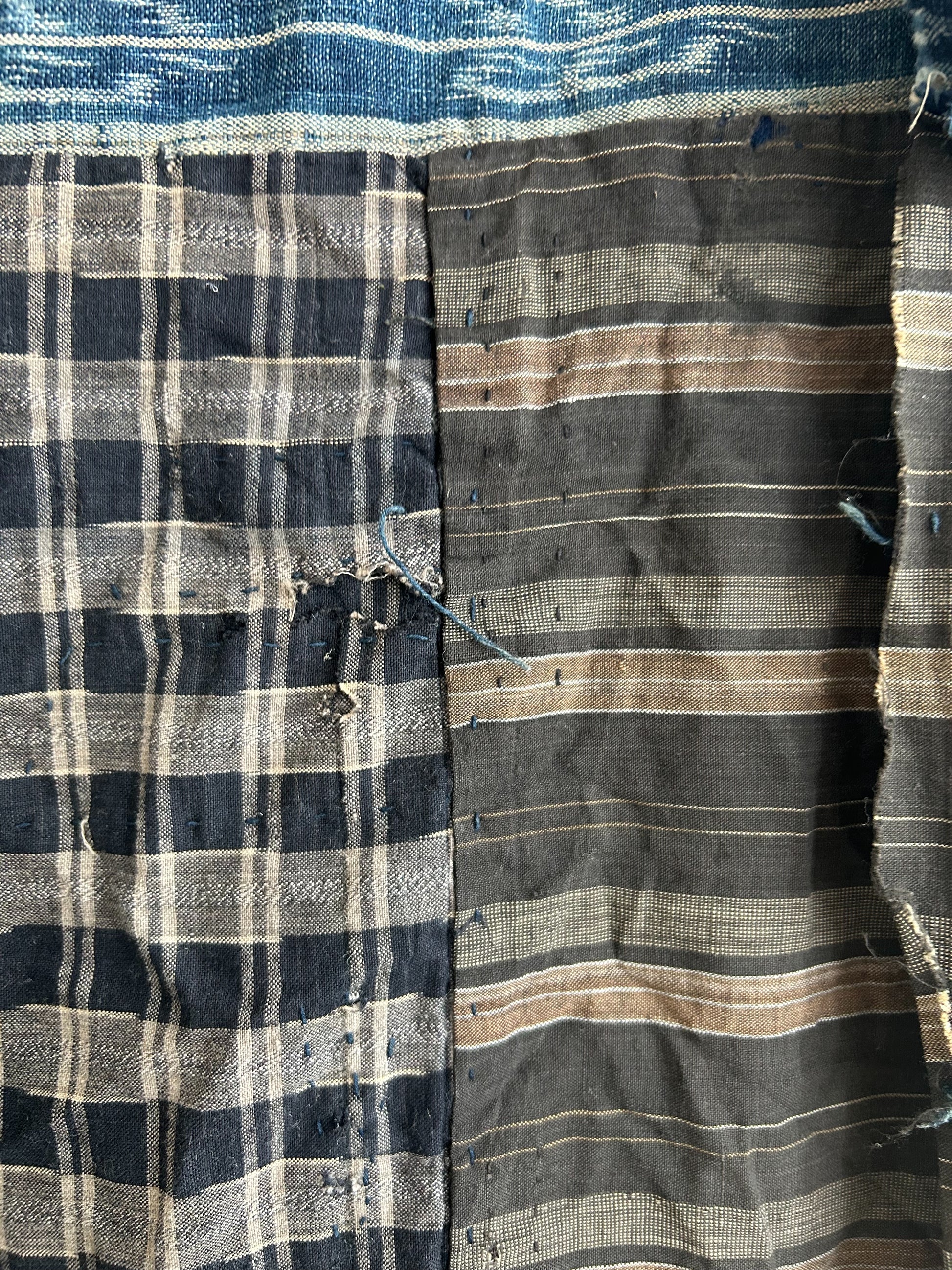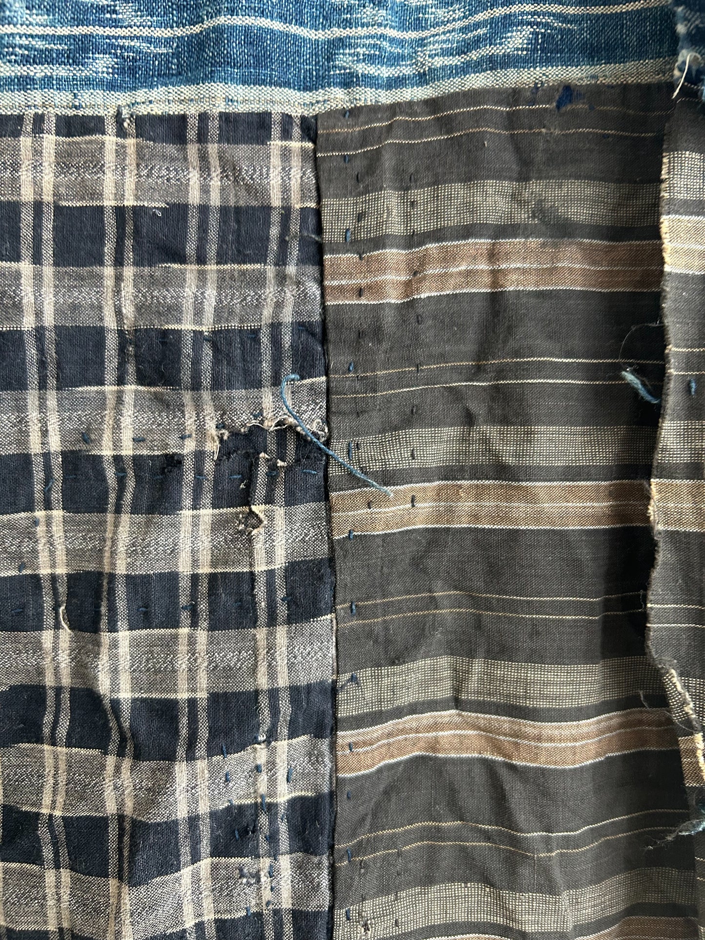 Rally beautiful vintage patchwork quilt top. Indigo Ikat, calicos and stripes. It’s all cotton. So much personality. Use this to complete the quilt of your dreams or simply utilize the fabric as a curtain or hung over a headboard. You can see there’s somewhere in spots. Some of them could be repaired, but this doesn’t bother us at all as is
