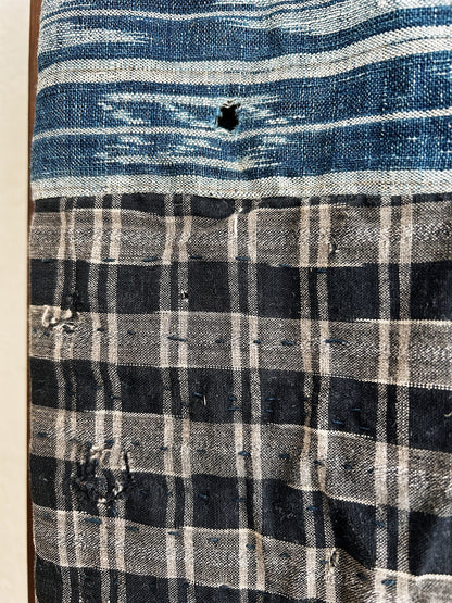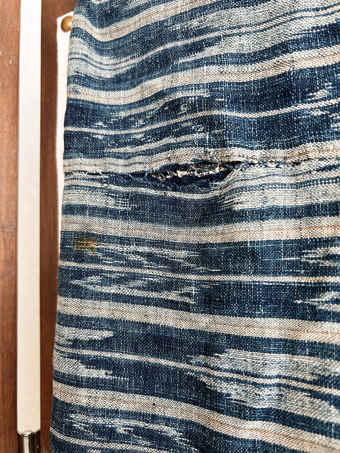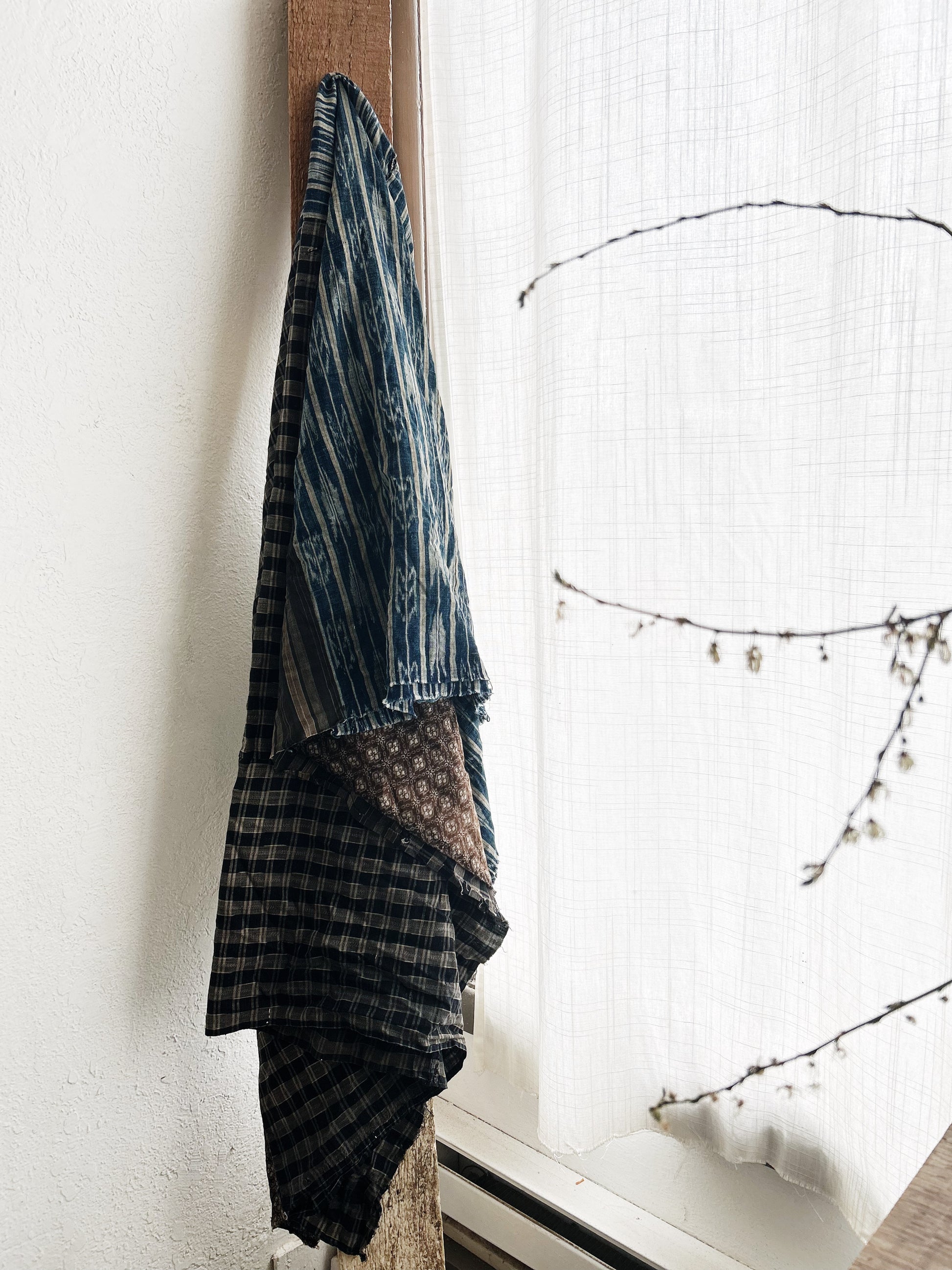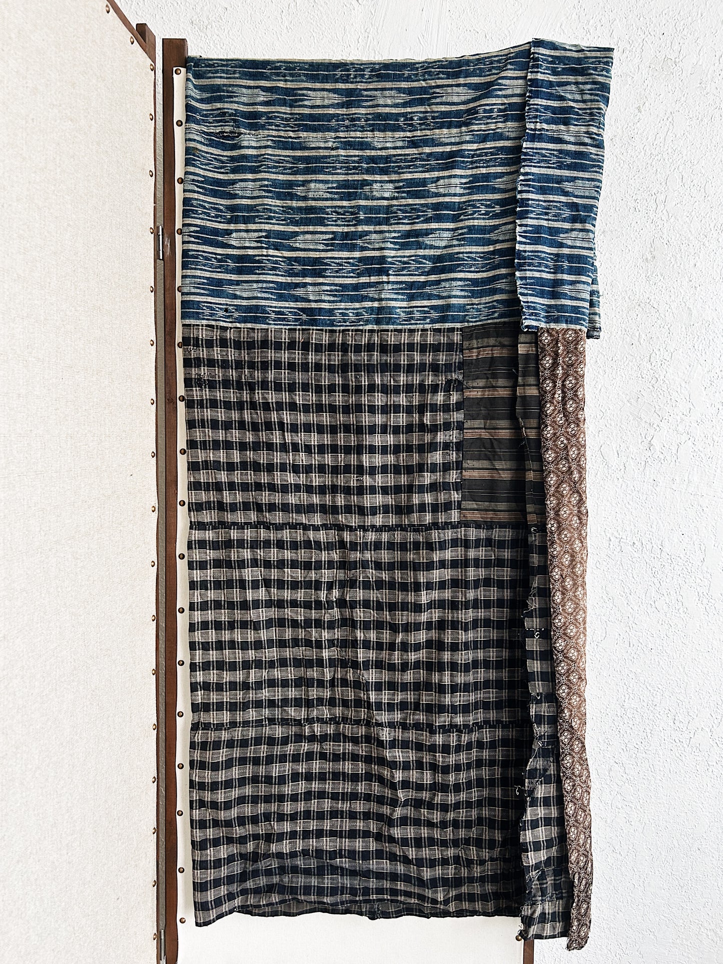 Rally beautiful vintage patchwork quilt top. Indigo Ikat, calicos and stripes. It’s all cotton. So much personality. Use this to complete the quilt of your dreams or simply utilize the fabric as a curtain or hung over a headboard. You can see there’s somewhere in spots. Some of them could be repaired, but this doesn’t bother us at all as is