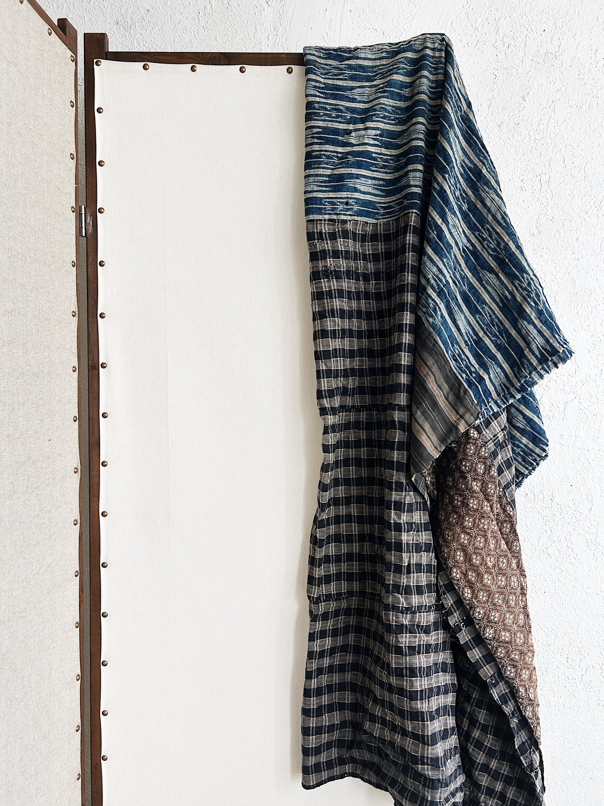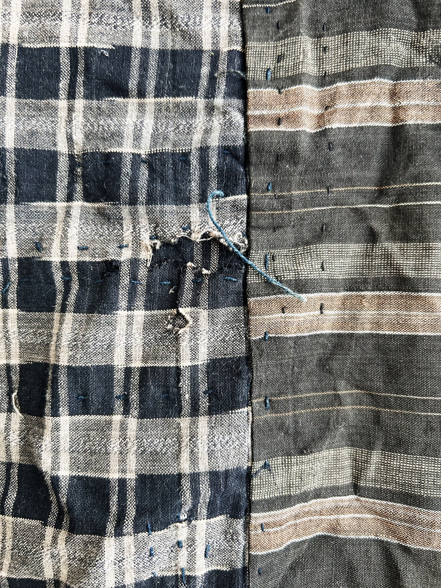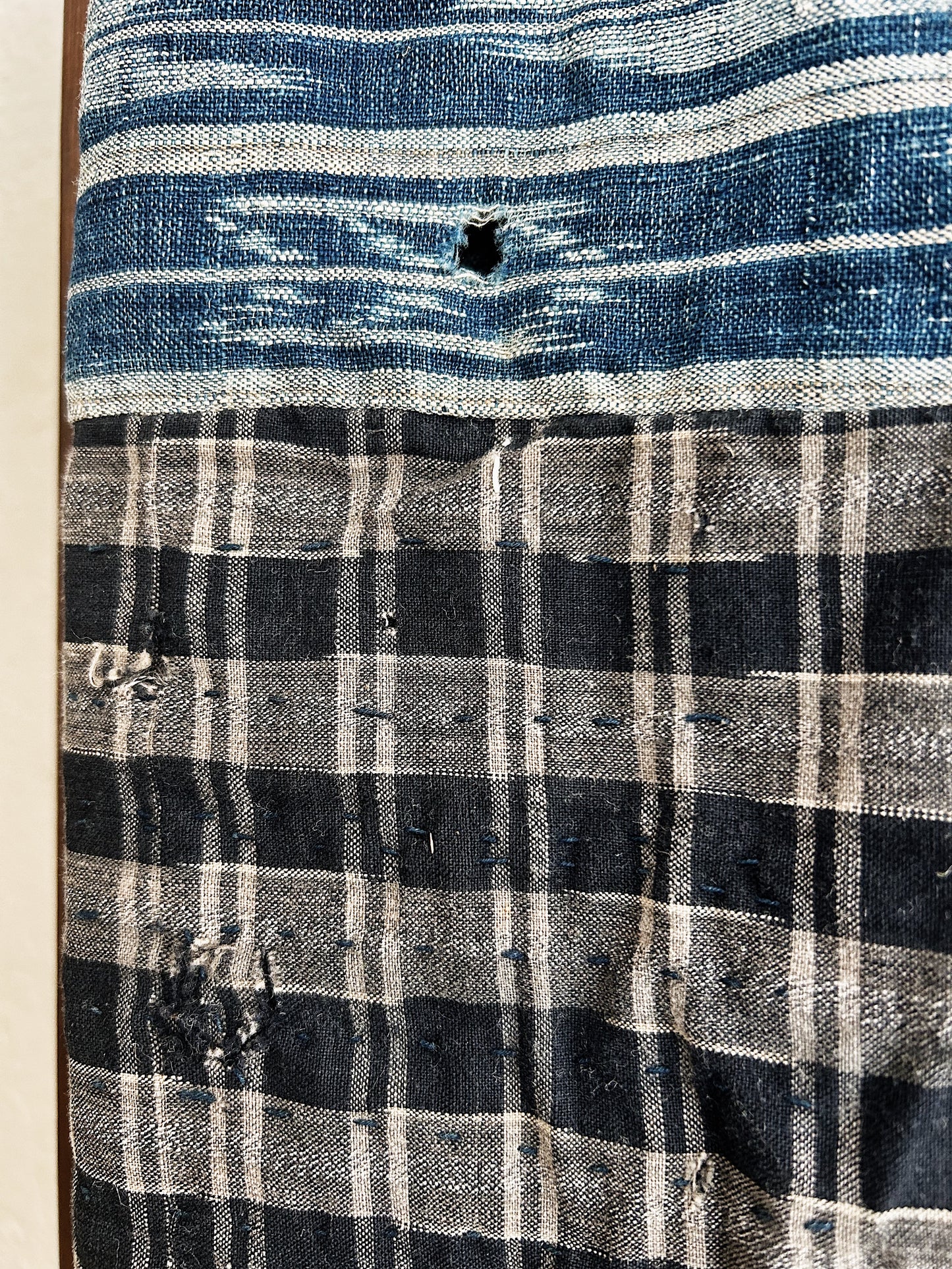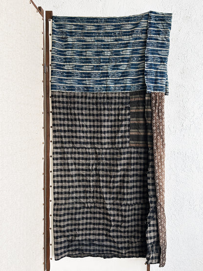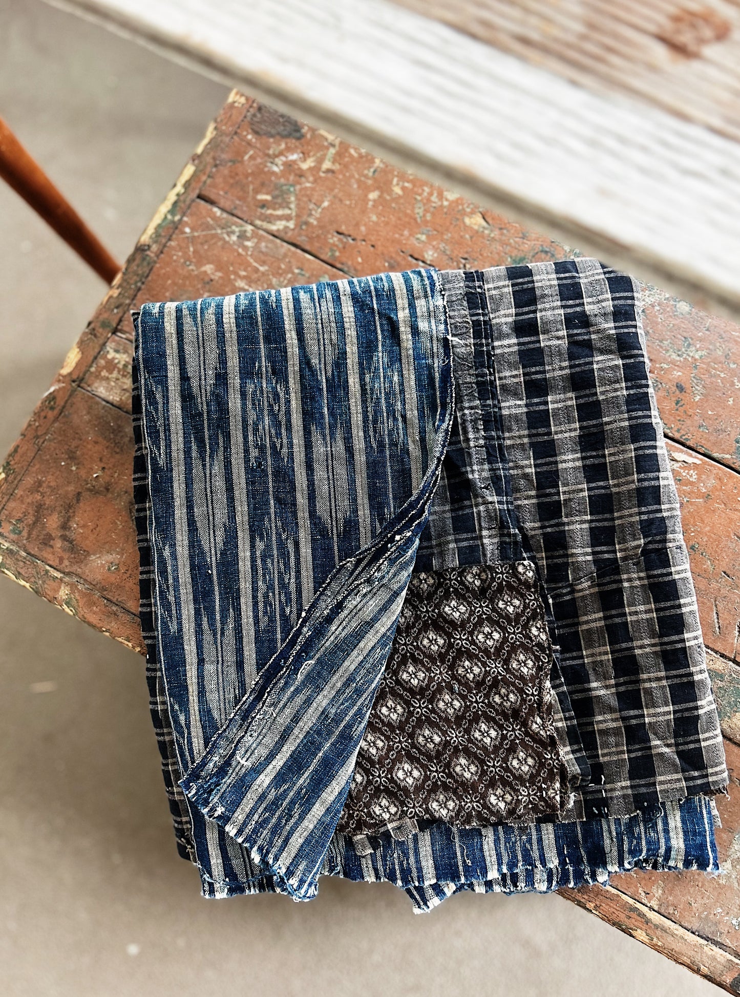 Rally beautiful vintage patchwork quilt top. Indigo Ikat, calicos and stripes. It’s all cotton. So much personality. Use this to complete the quilt of your dreams or simply utilize the fabric as a curtain or hung over a headboard. You can see there’s somewhere in spots. Some of them could be repaired, but this doesn’t bother us at all as is