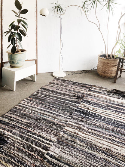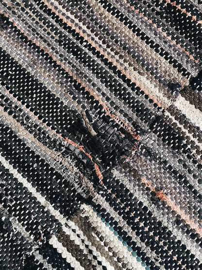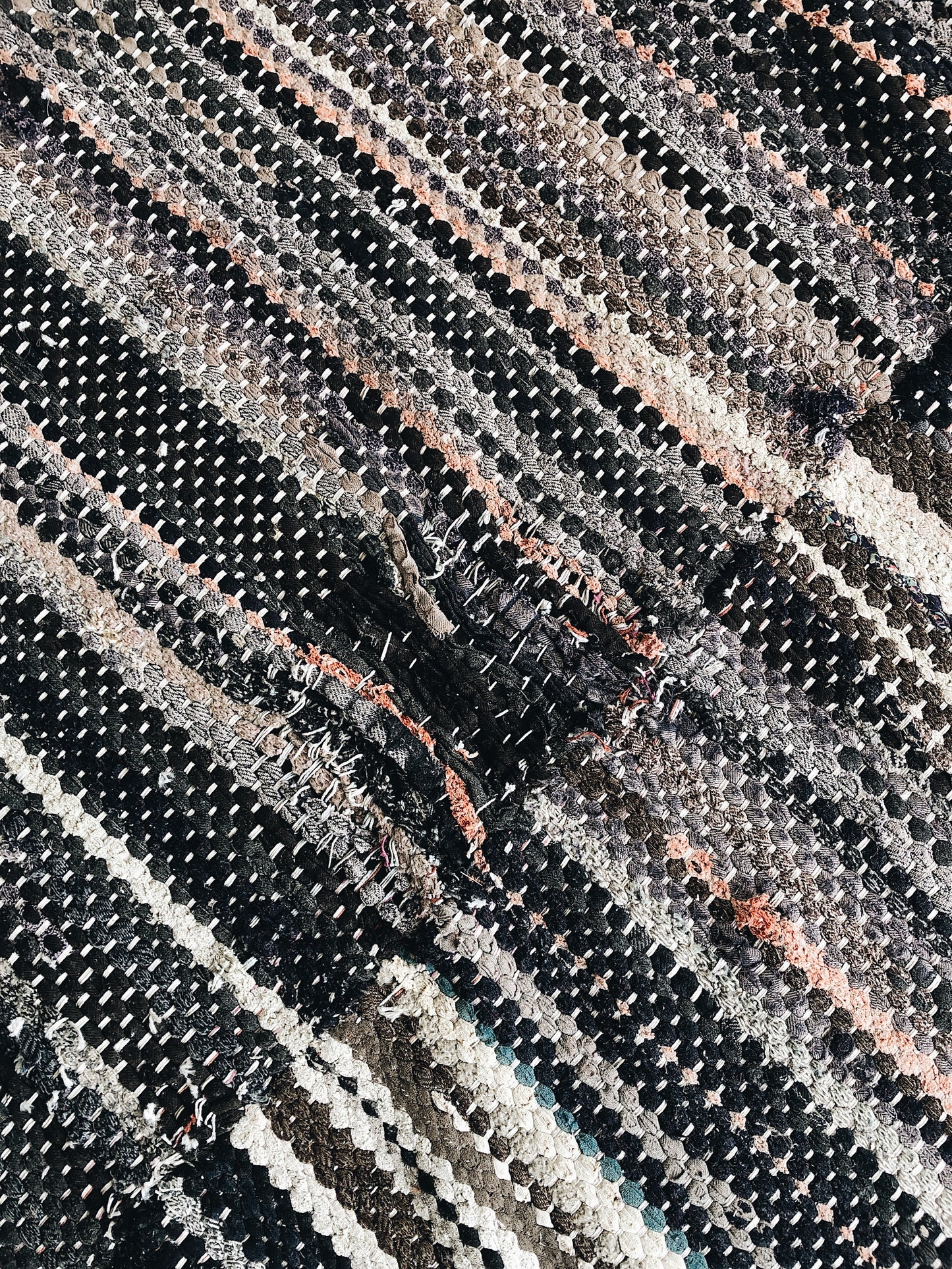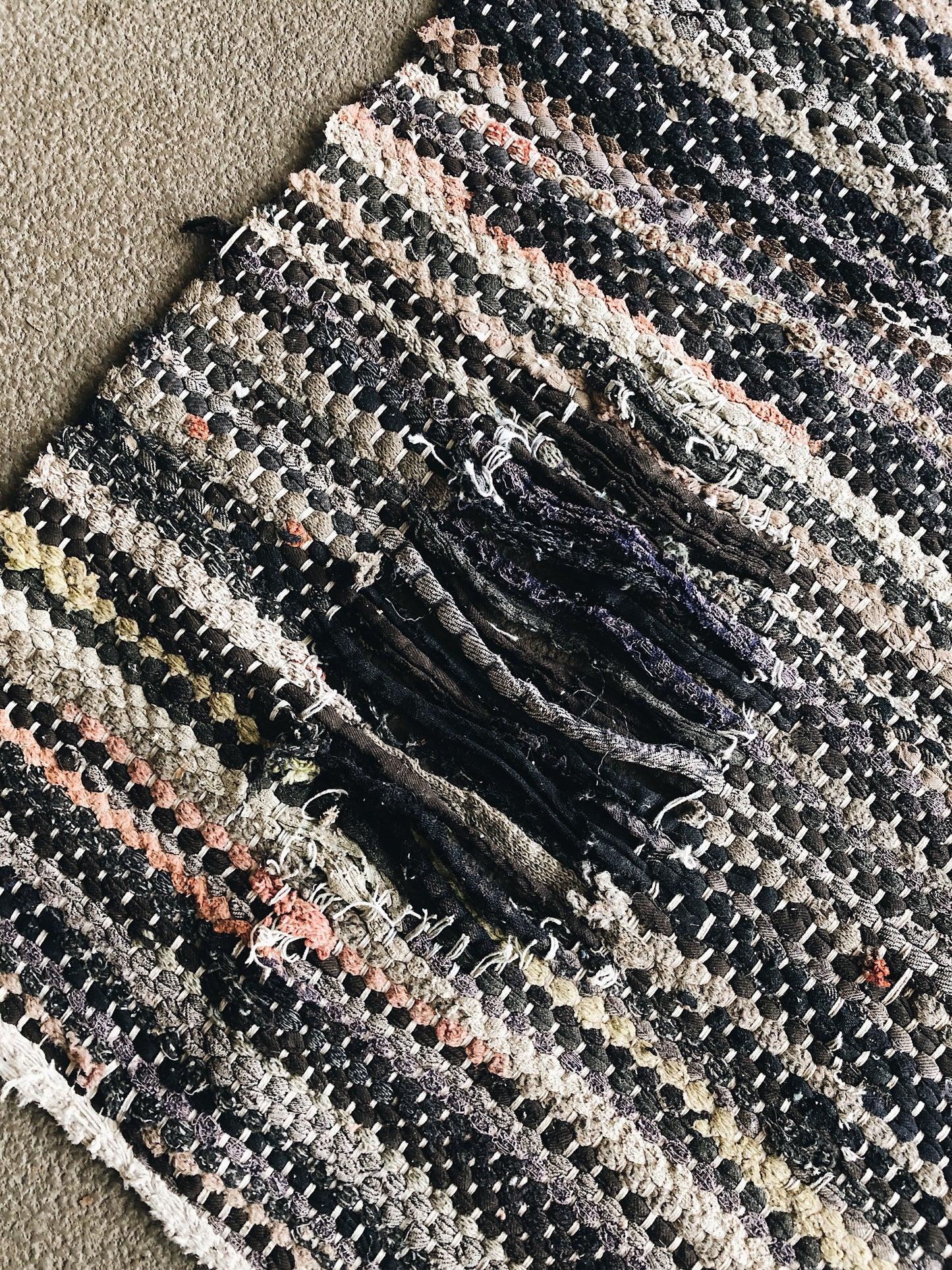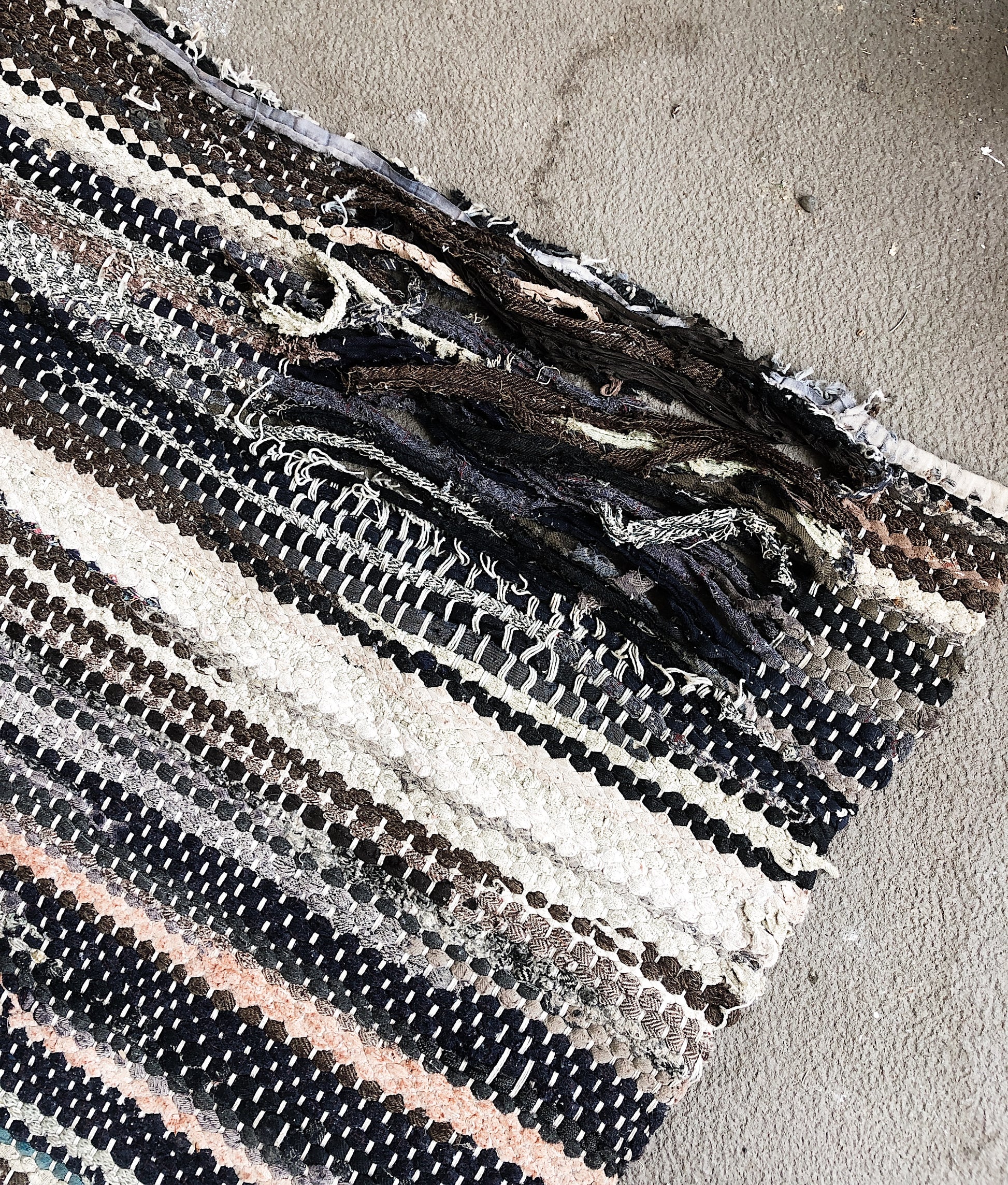 Stunning indigo colors in this old wool rag rug. You can see areas of hand mending and other areas that haven’t been fixed. These areas are in perfect little square patch areas and add to the handmade appeal.