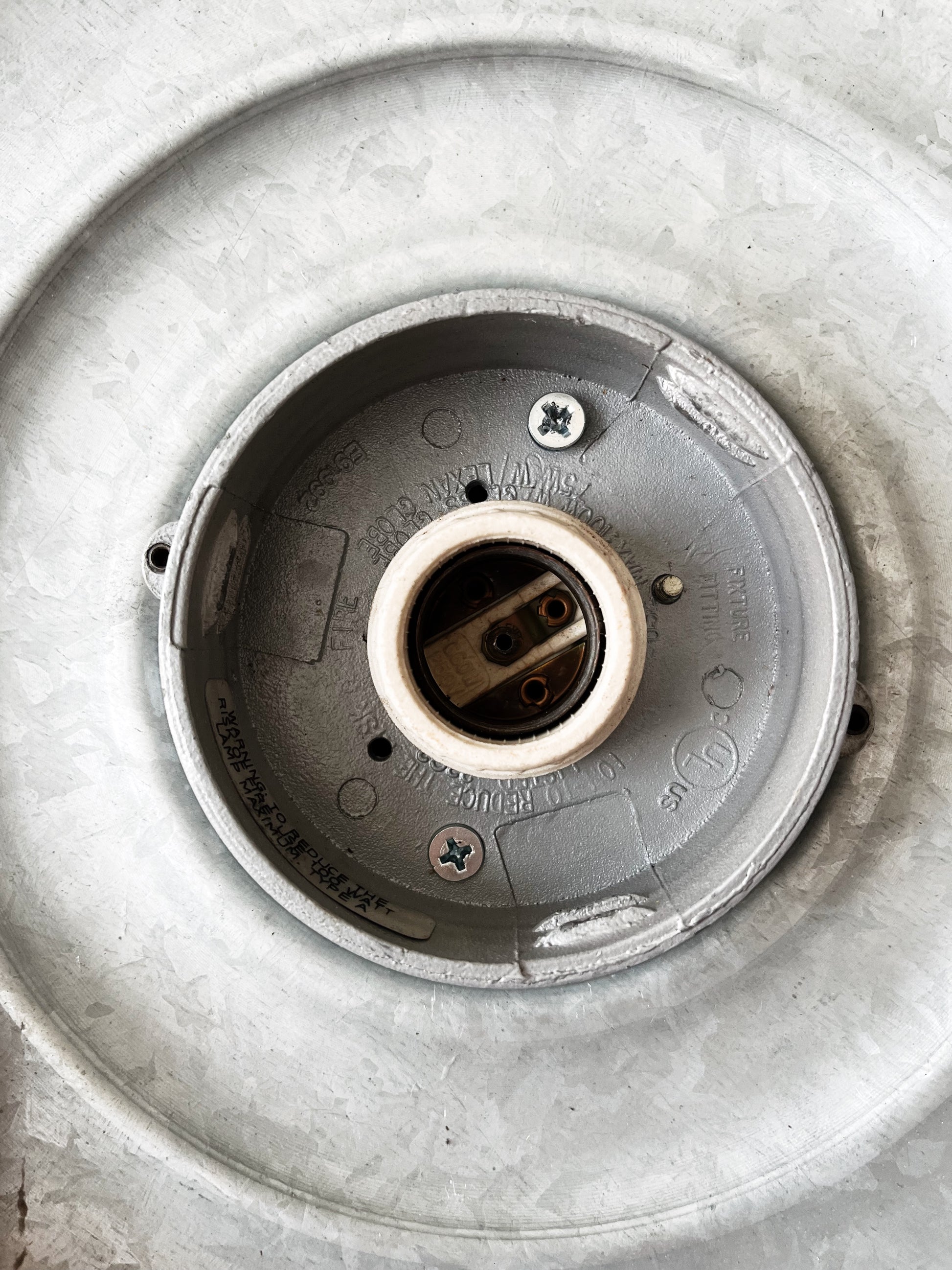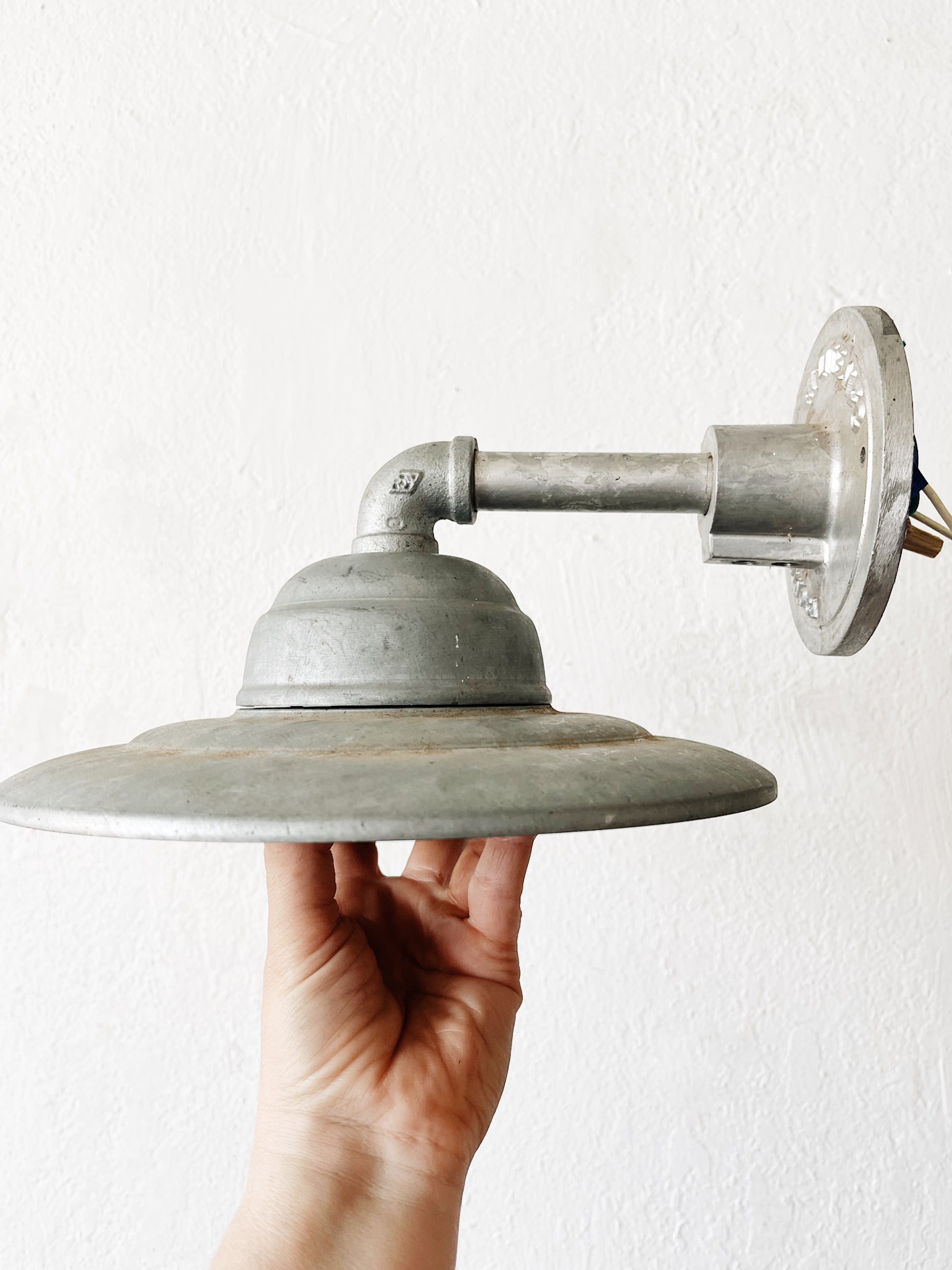 Fab zinc barn light with a modern bent. Could really see this going traditional or more modern. Wiring looks good and the body is in great shape.