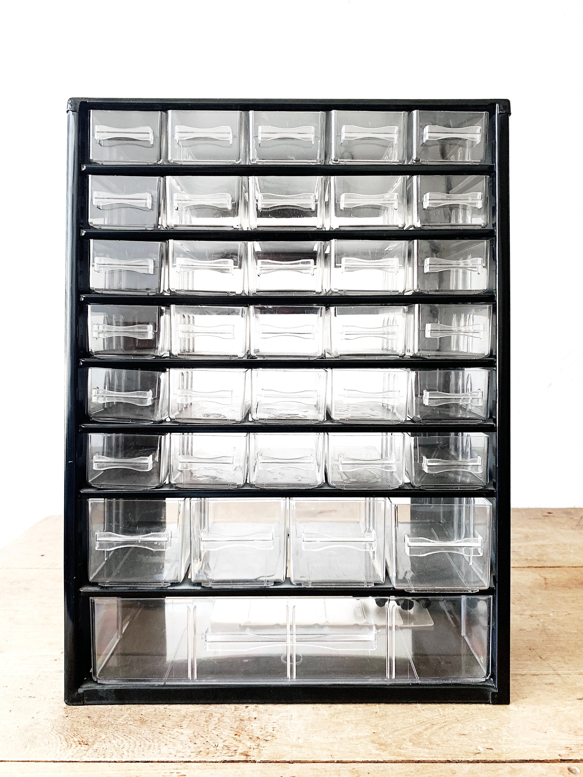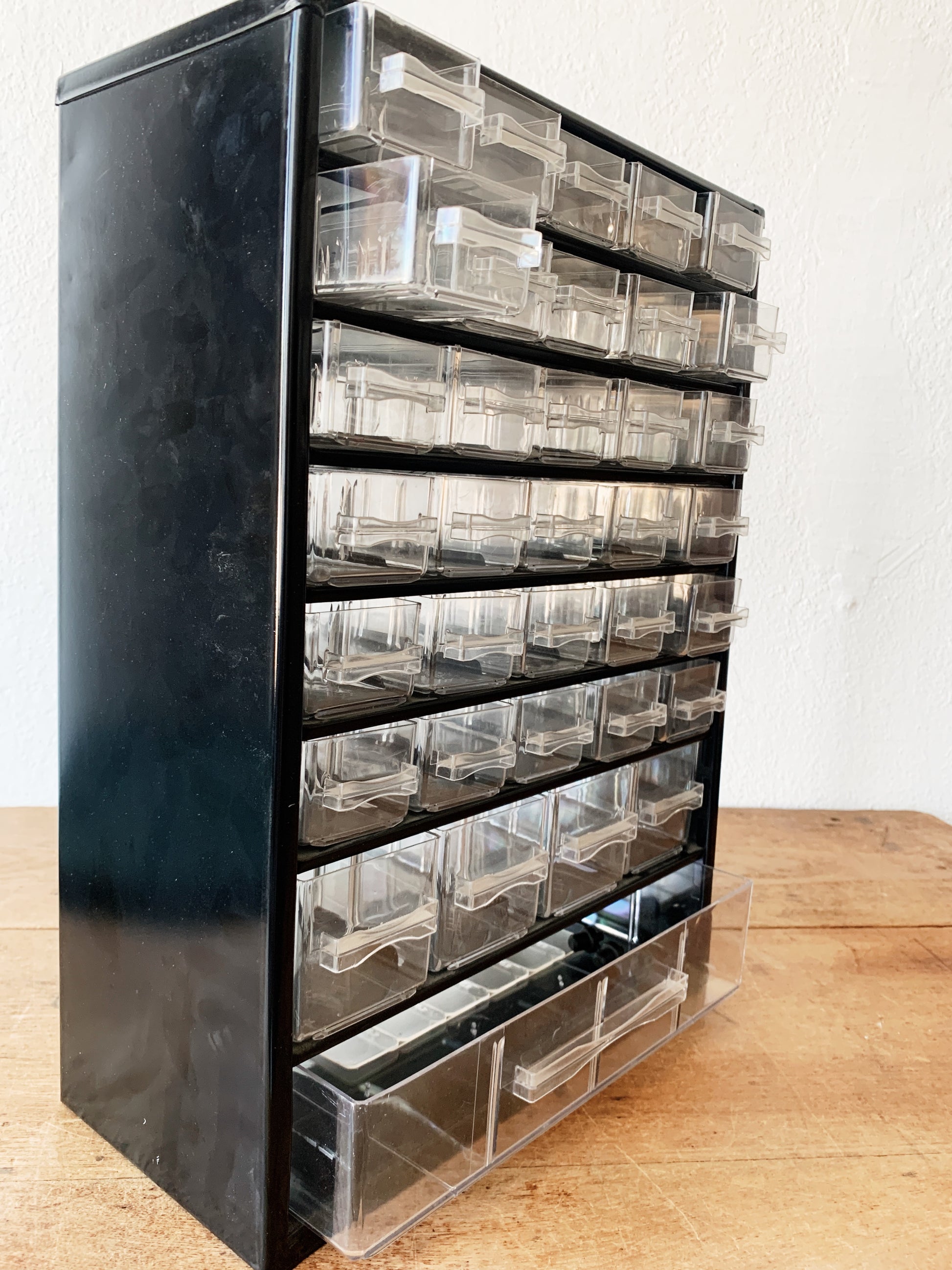 Such a nice one, so clean! Black metal frame that can hang or sit. Has 30 small drawers, 4 medium and one larger on bottom. Useful for many things! And nice looking taboot.