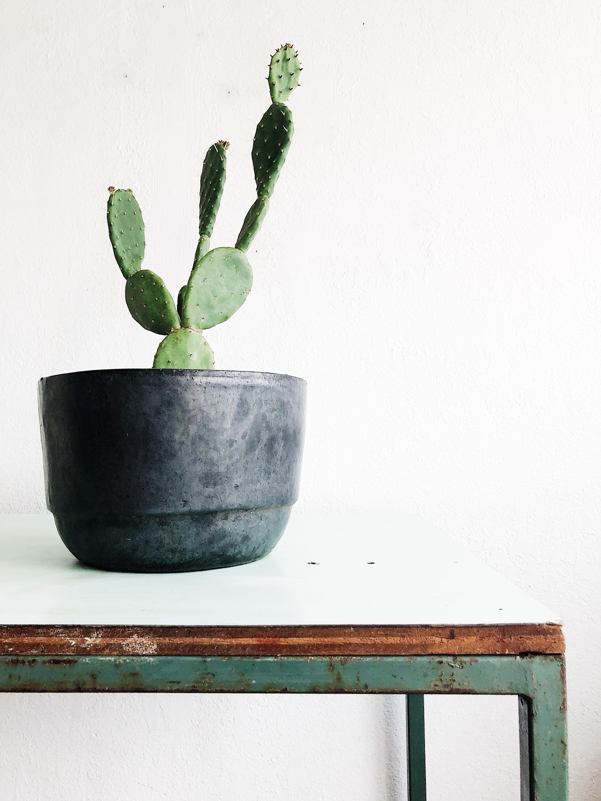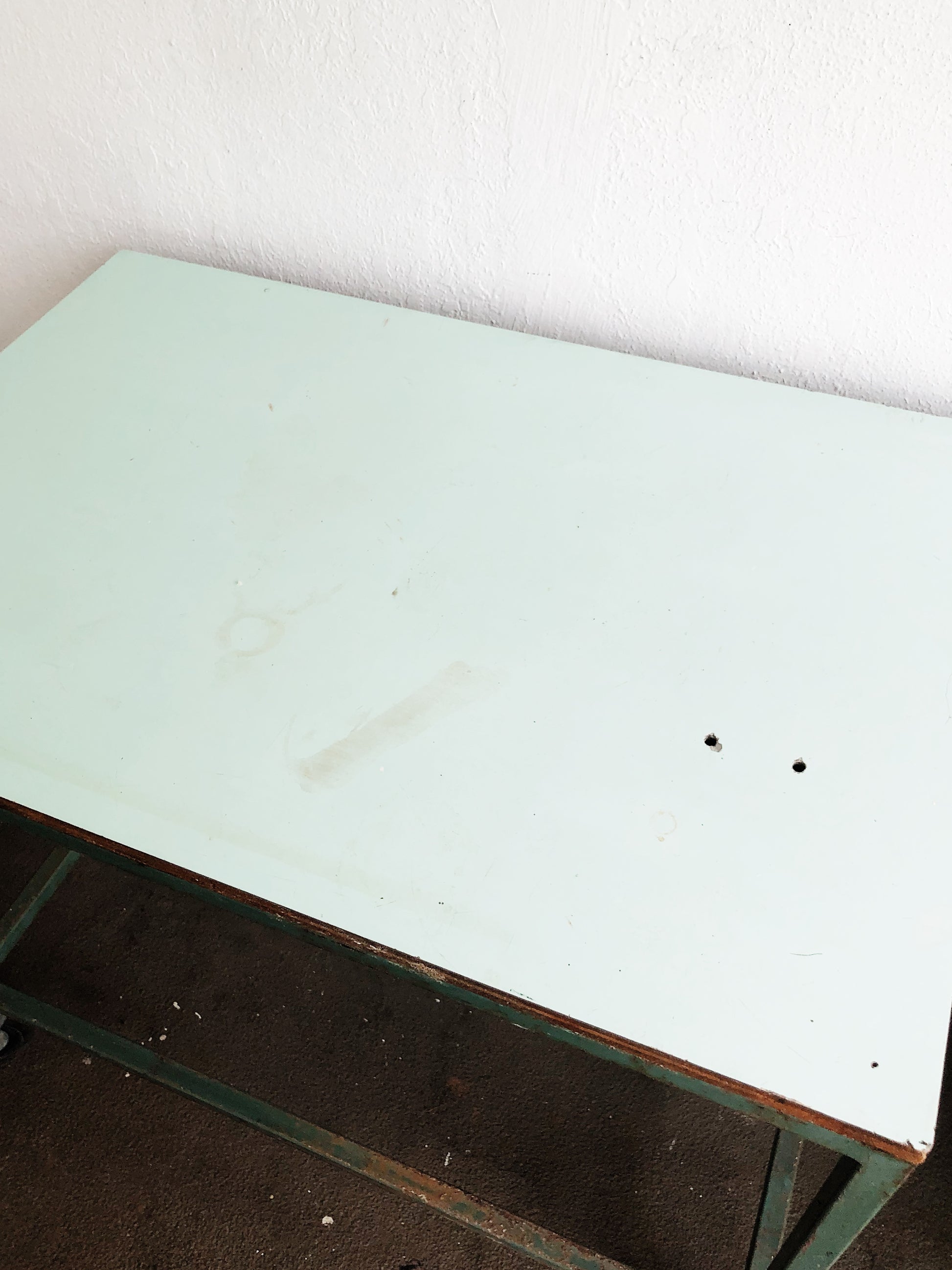 Makes a fantastic portable work station, potting table, bar cart. Pale turquoise metal frame with big casters. Top is laminate over ply. Rolls easily. All around great look