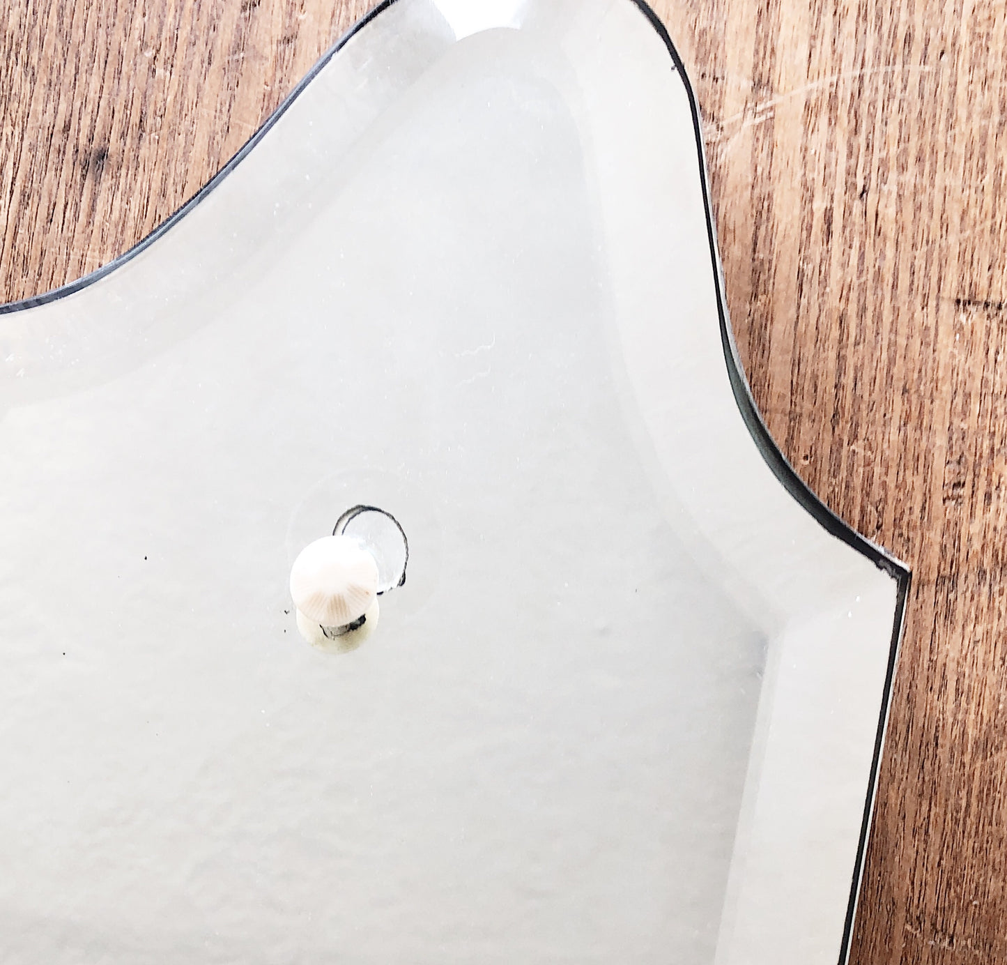 A chunky vintage industrial mirror with beveled edge. Great triangular shape. Little ivory supports. Backed with thick painted wood and a hanger. This one has a slight age to the glass. It’s very weighty for the size.