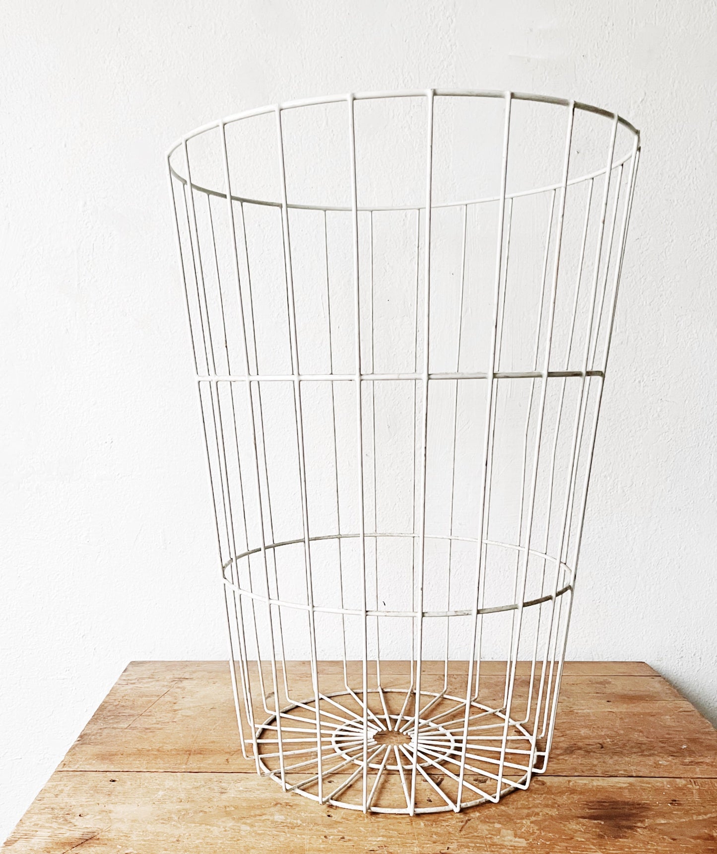 Oversized vintage wire bin, white rubberized enamel over metal. Lightweight. Tons of storage potential. Feel free to turn it upside down and use as a stand.