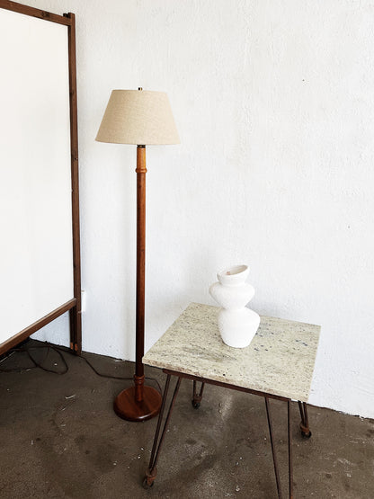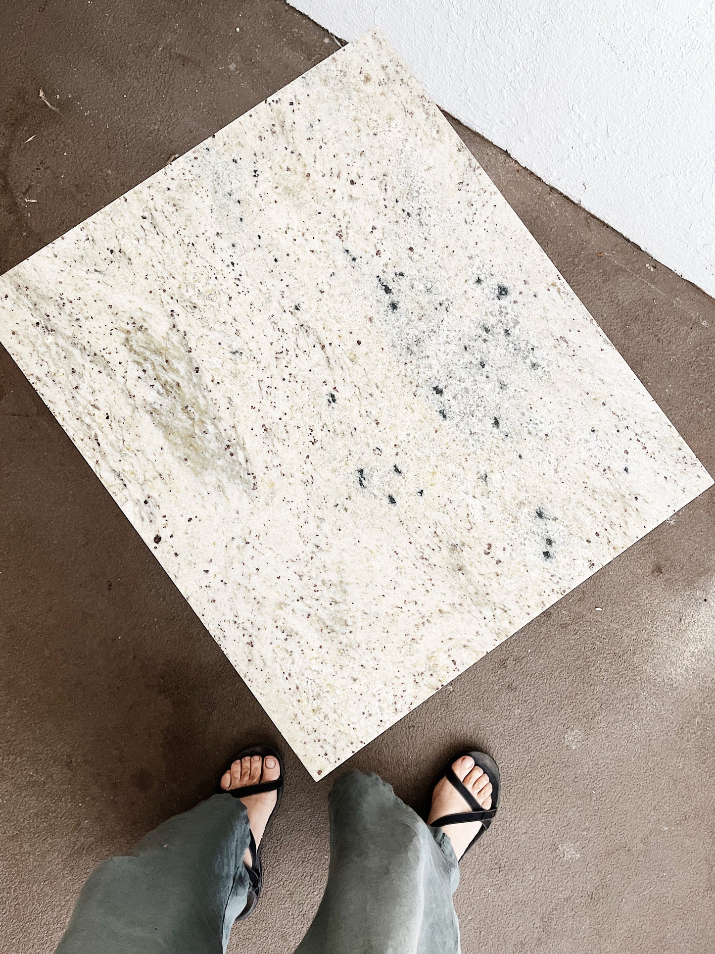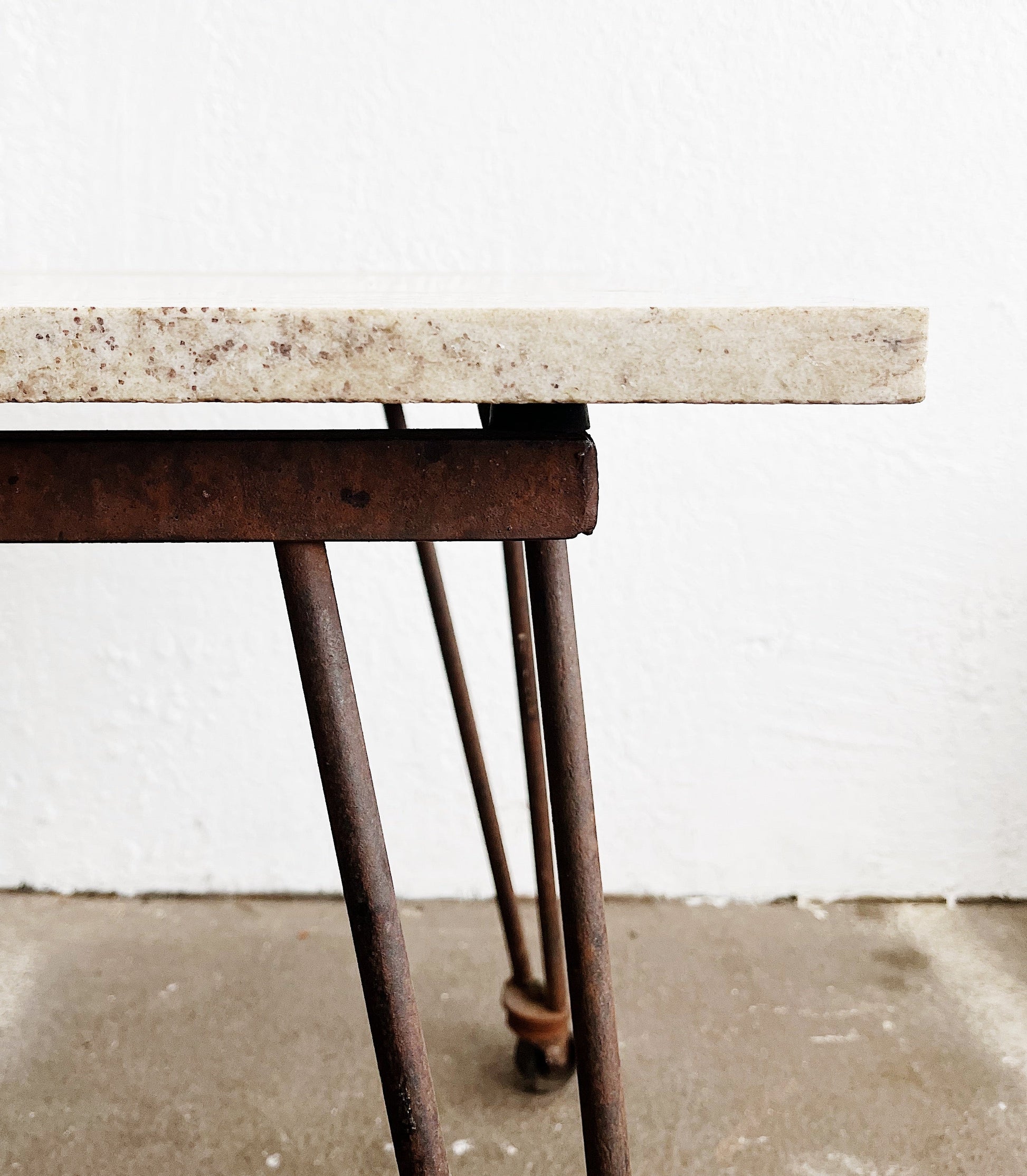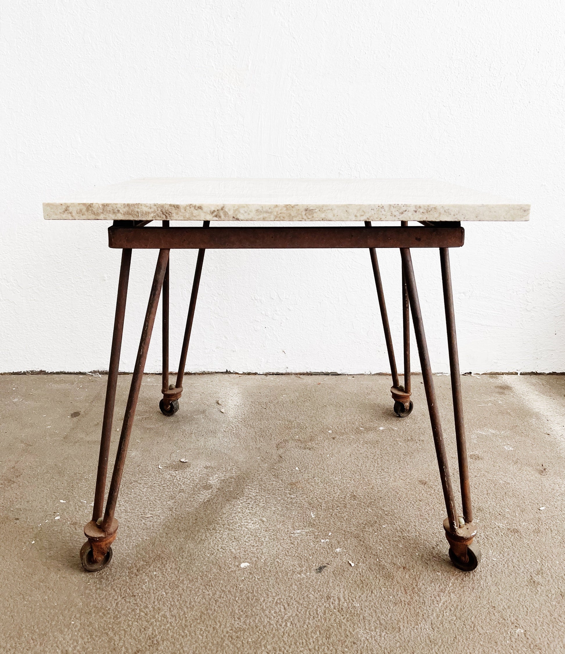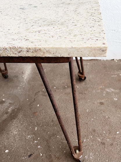 Fabulous iron table with wheels. The granite top is lightly polished and is like a little galaxy with colors of Blue black ochre and olive green. Makes a nice little side table indoors or out
