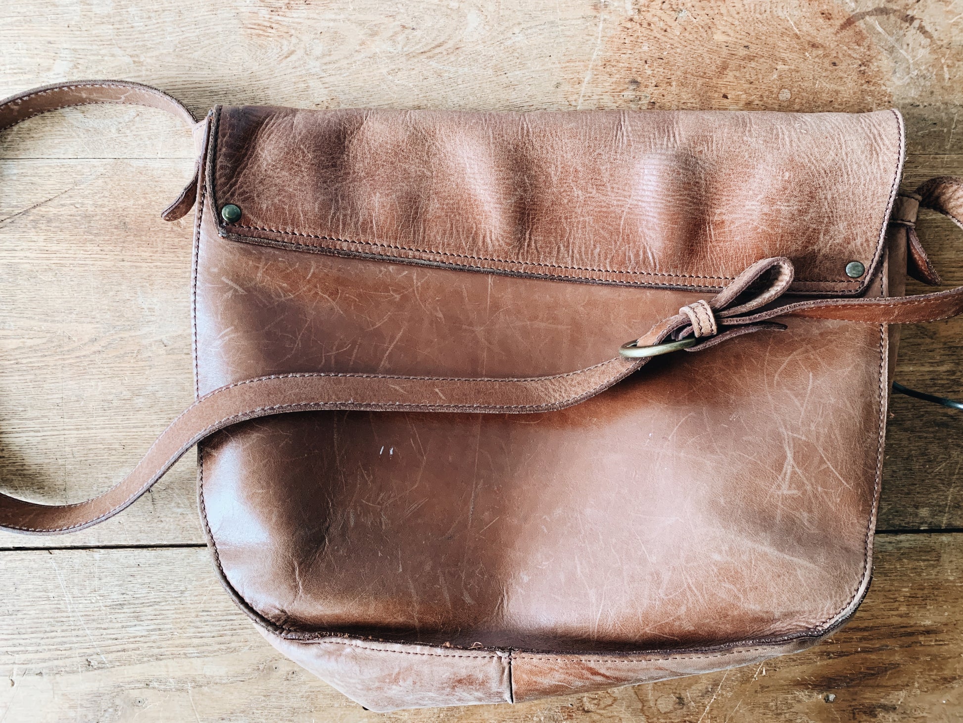 Vintage JCrew leather satchel with adjustable strap. Lined in brown cotton. One internal zip pocket. In great condition. This is a personal item I bought around 20 years ago if memory serves me right. In San Francisco at the JCrew store. I’ve had the strap stitched up professionally by a cobbler about 10 or so years ago. Beautifully made bag. Brass buckle and snap closure.
