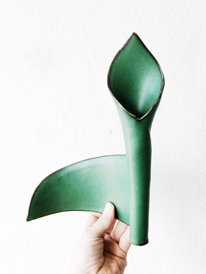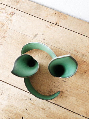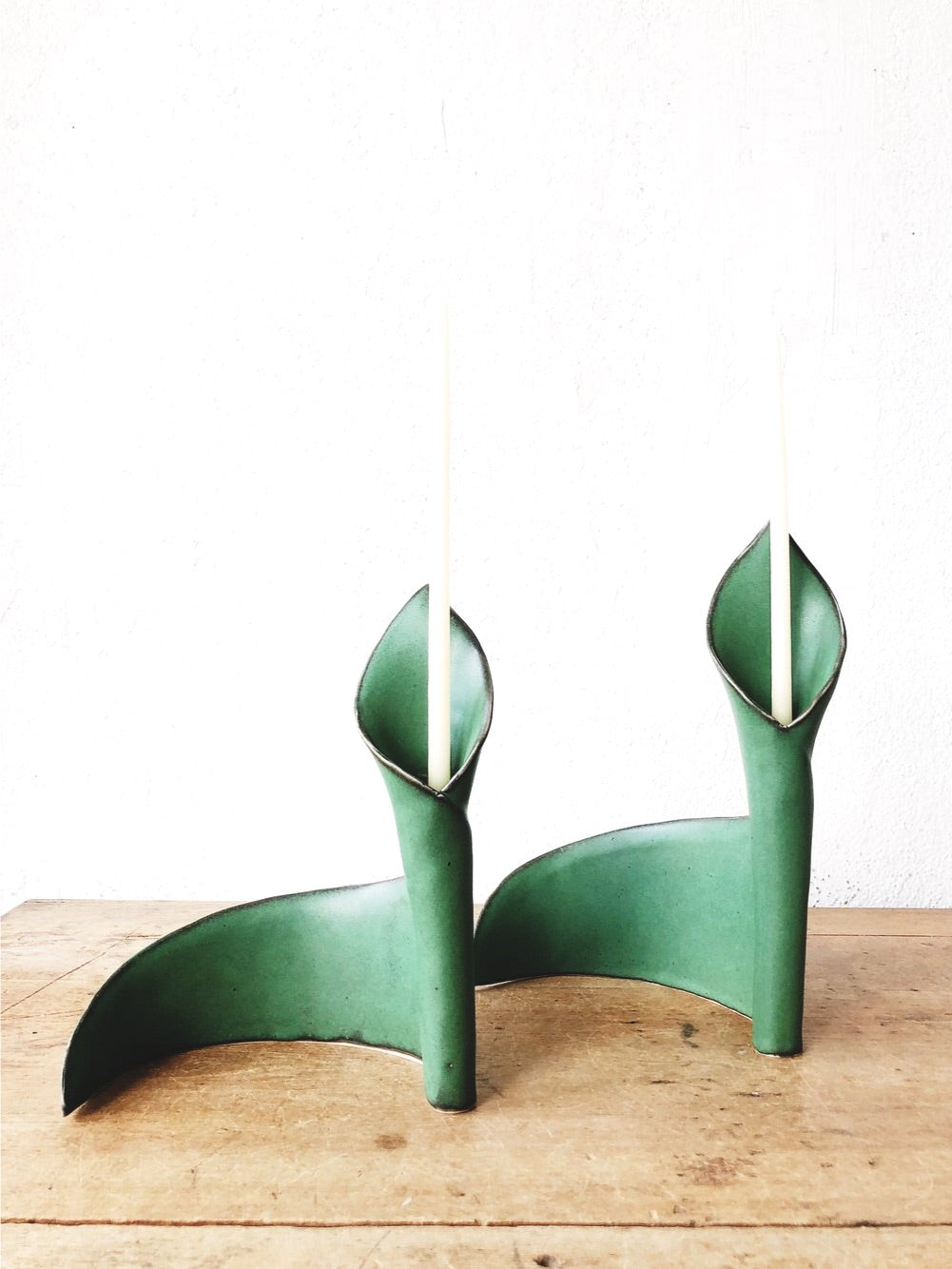 Stunning green calla lily shaped ceramic candlesticks. Could also be used as bud vases