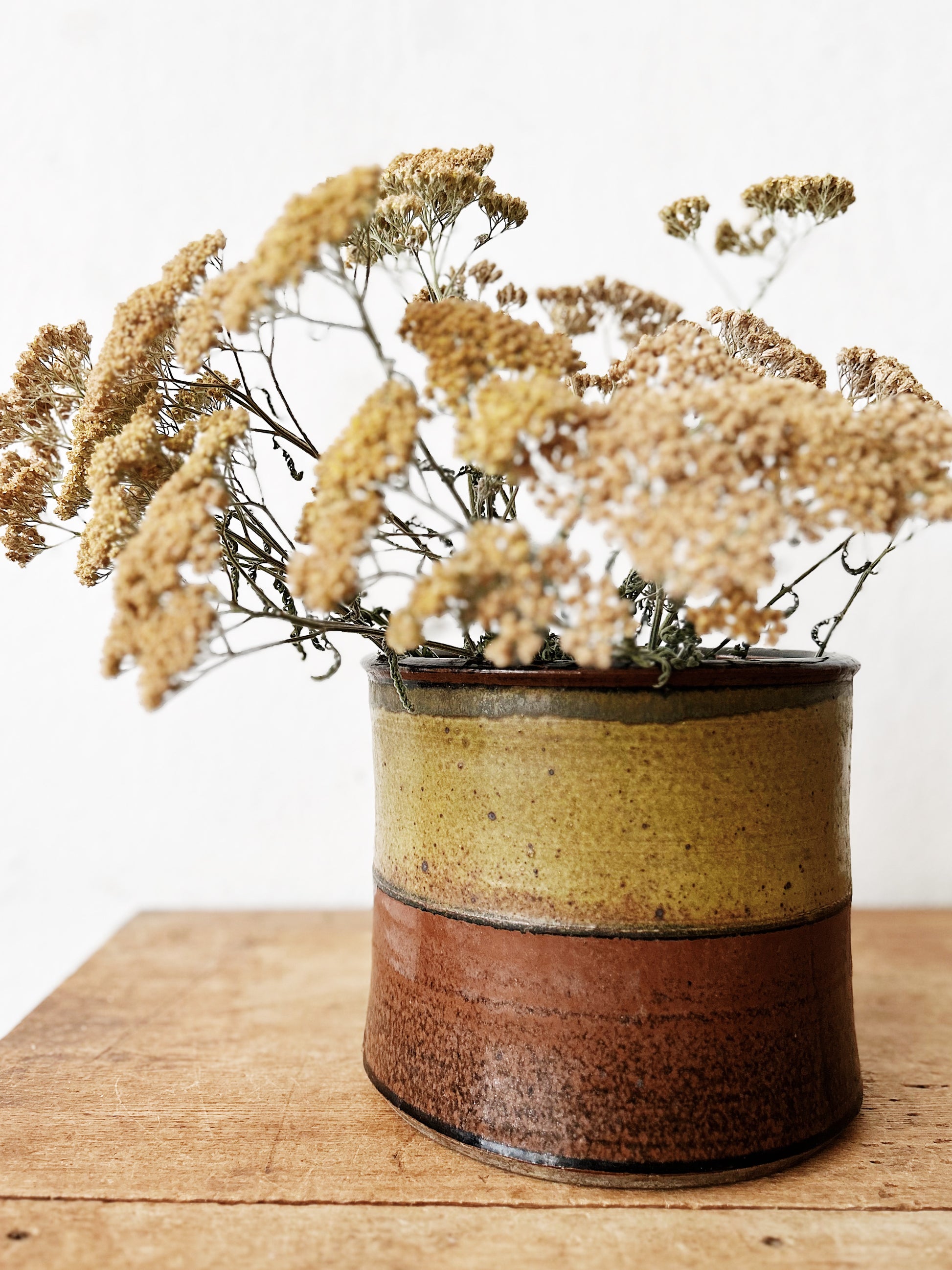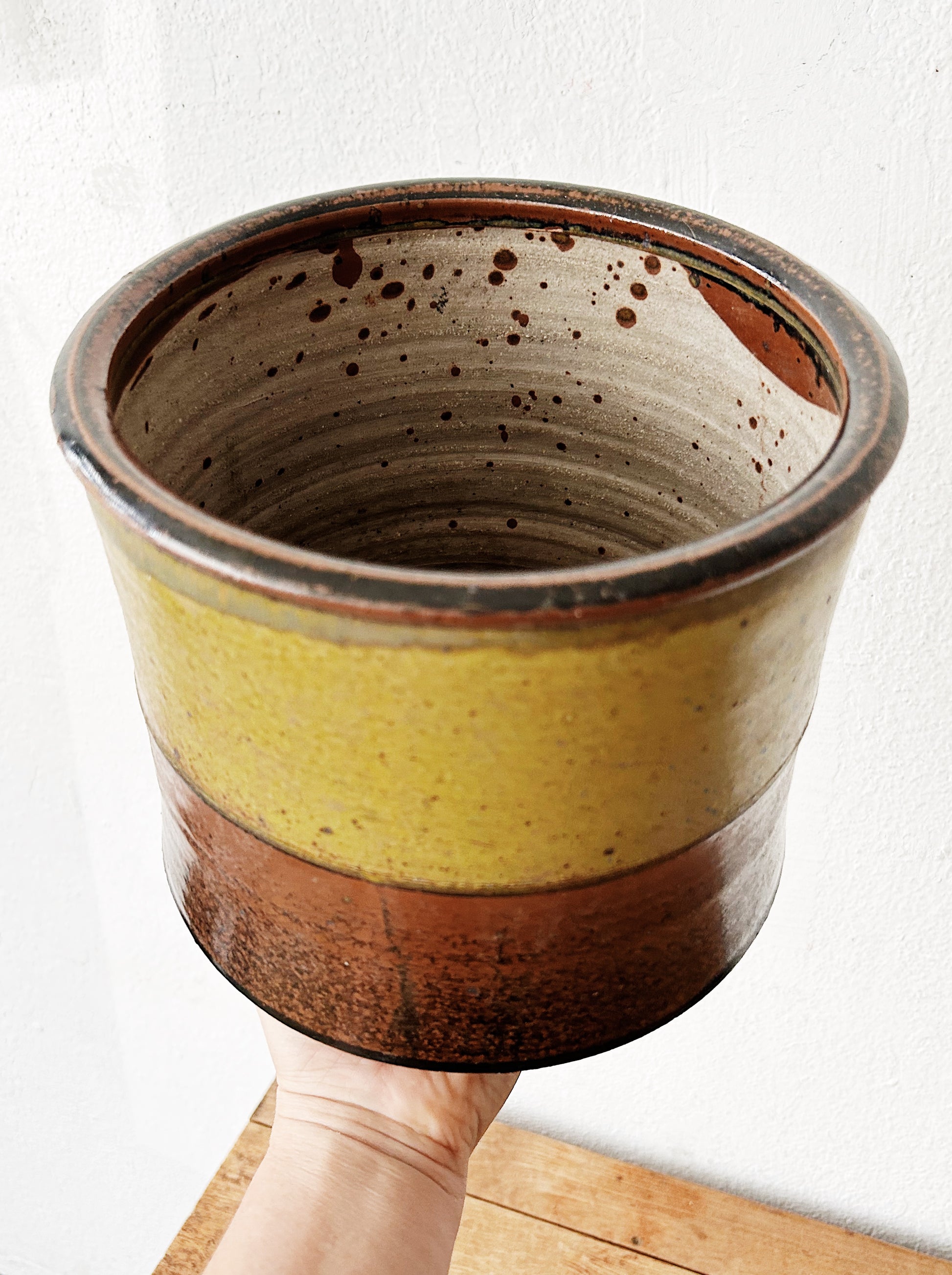 Stunning colors in this vintage northwest artist Jerry Glenn vessel. Love the chartreuse. Dates to 1970s. Marked. Drainage present. The extra cracking at the base happened in the firing stage and is not considered an aftermarket flaw. In addition to potting this up, we think it would be wonderful in the kitchen filled with wooden utensils.