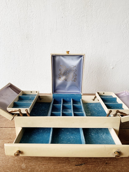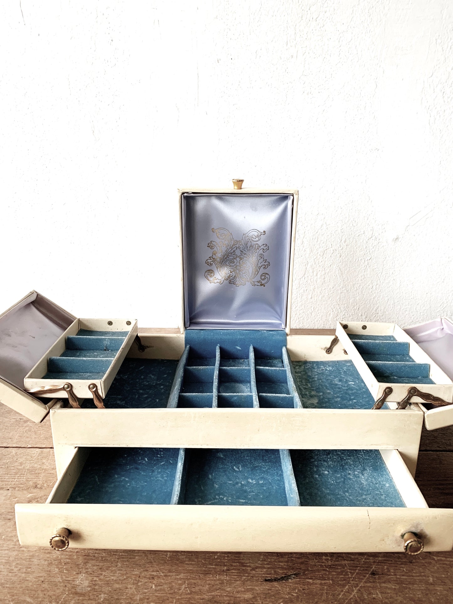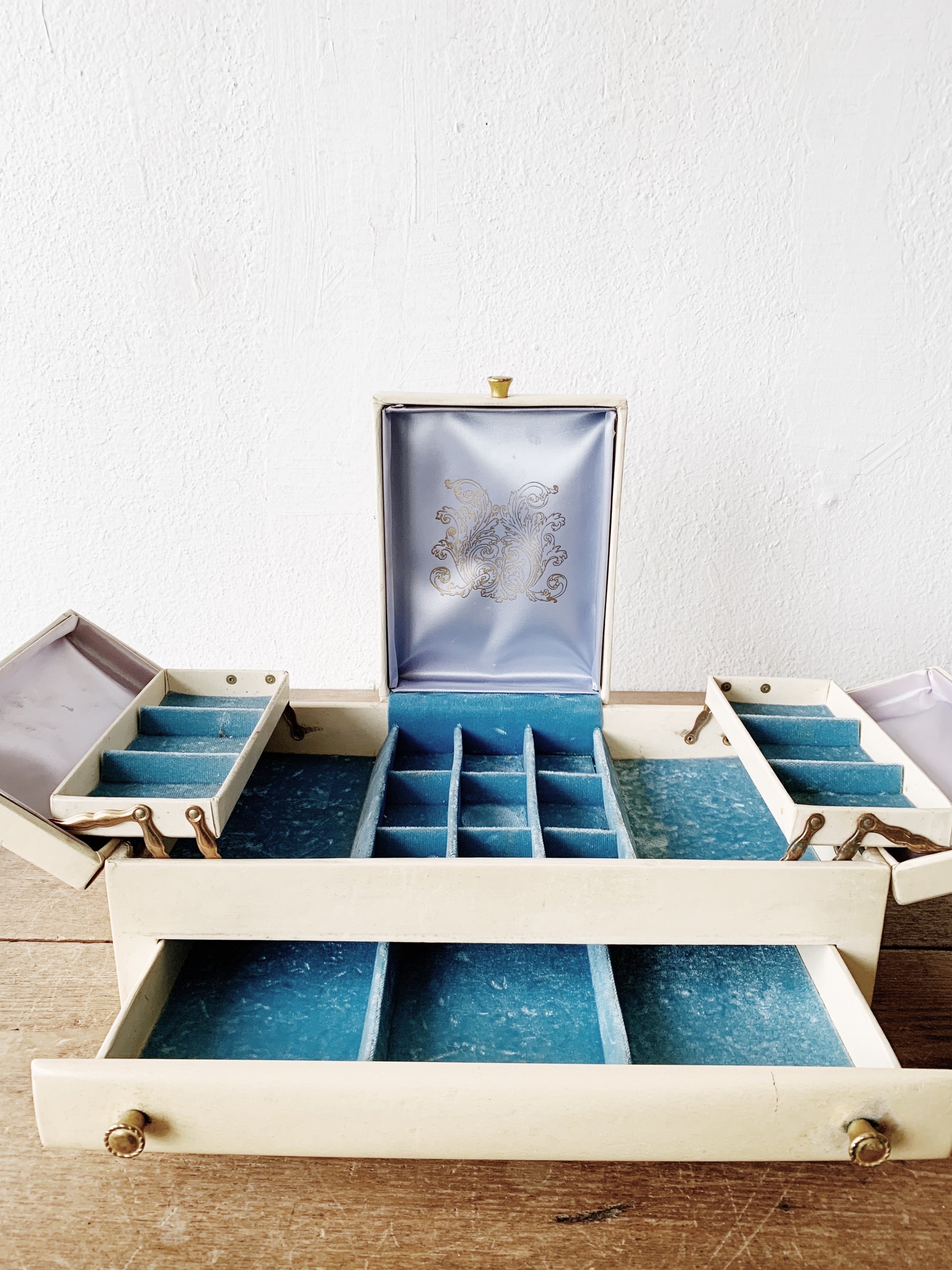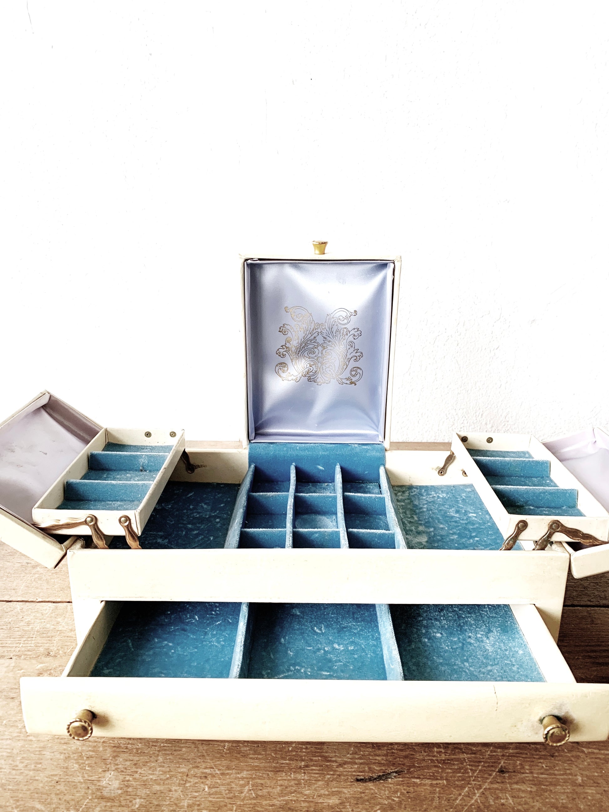 Classic and fancy mid century Lady Buxton leather and velvet jewelry box. She is showing her age with markings, dings, bruises and a little discoloration in spots to the turquoise velvet, but we love her just the same. Please review photos before purchasing. *The exterior is a bit warmer and darker than it’s showing up in these photos. It’s more of a dark cream shade.