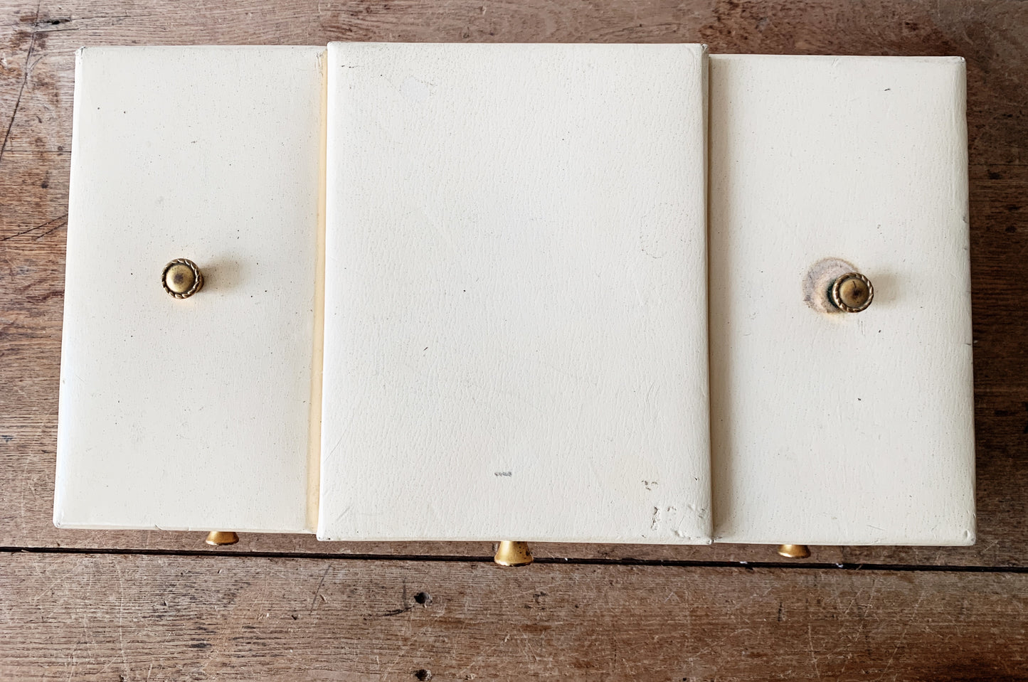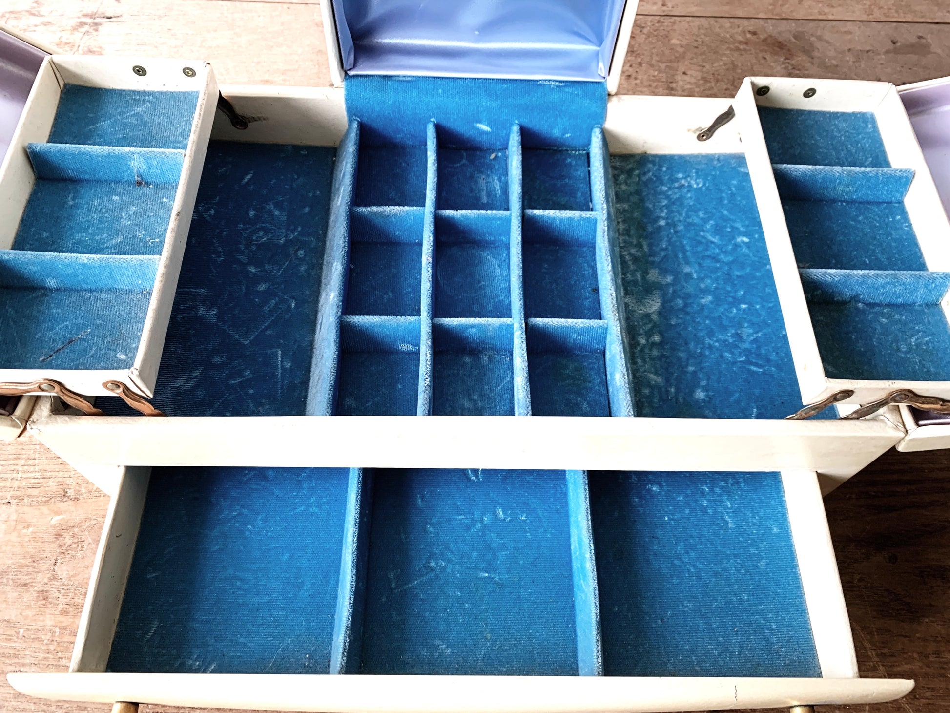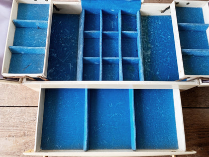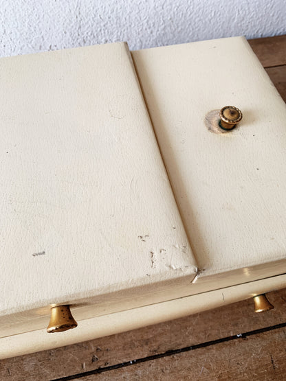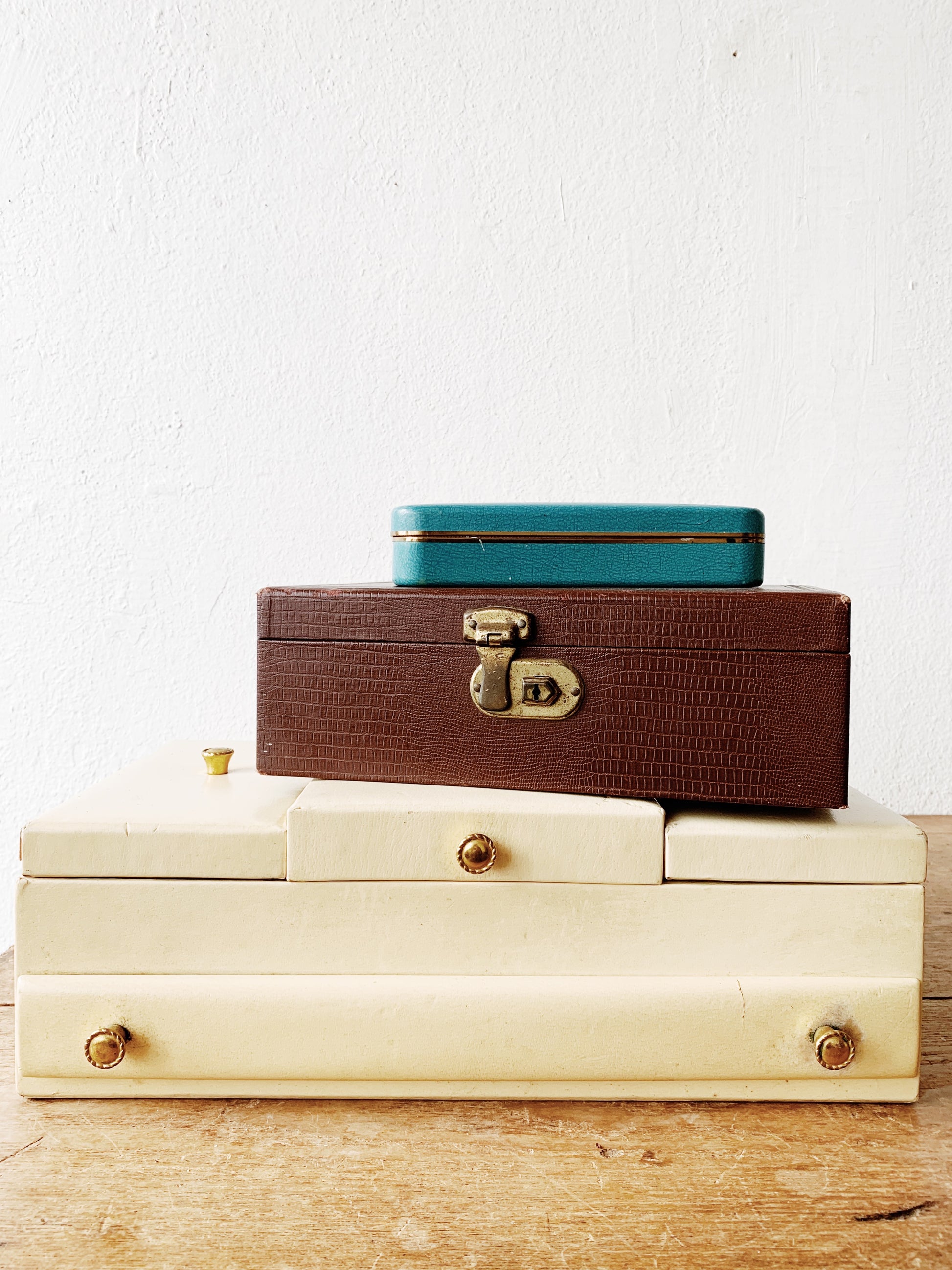 Classic and fancy mid century Lady Buxton leather and velvet jewelry box. She is showing her age with markings, dings, bruises and a little discoloration in spots to the turquoise velvet, but we love her just the same. Please review photos before purchasing. *The exterior is a bit warmer and darker than it’s showing up in these photos. It’s more of a dark cream shade.