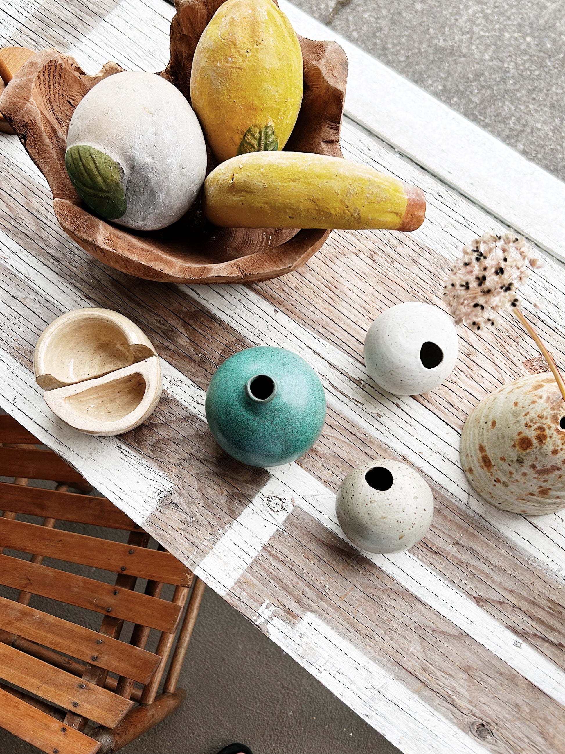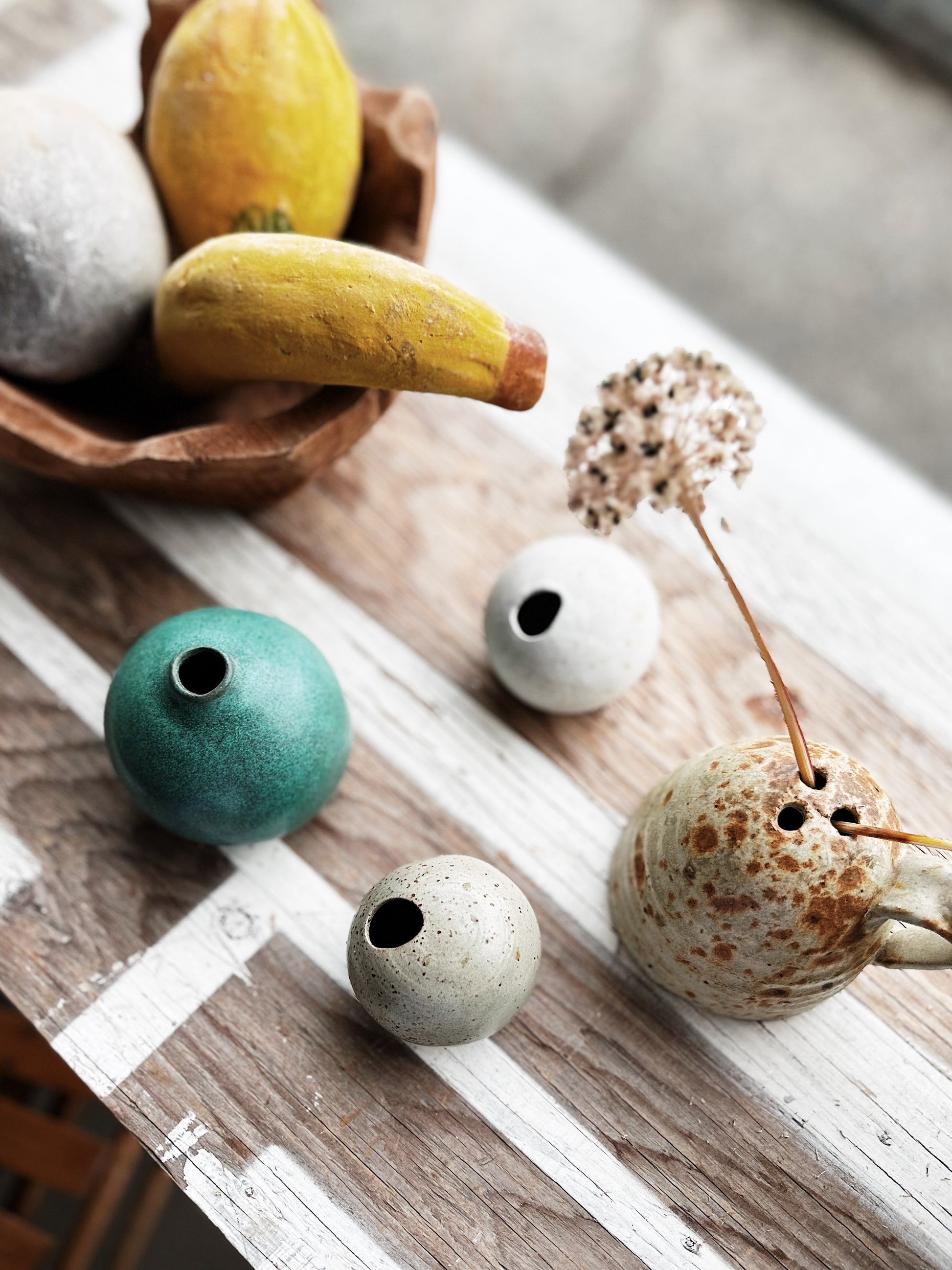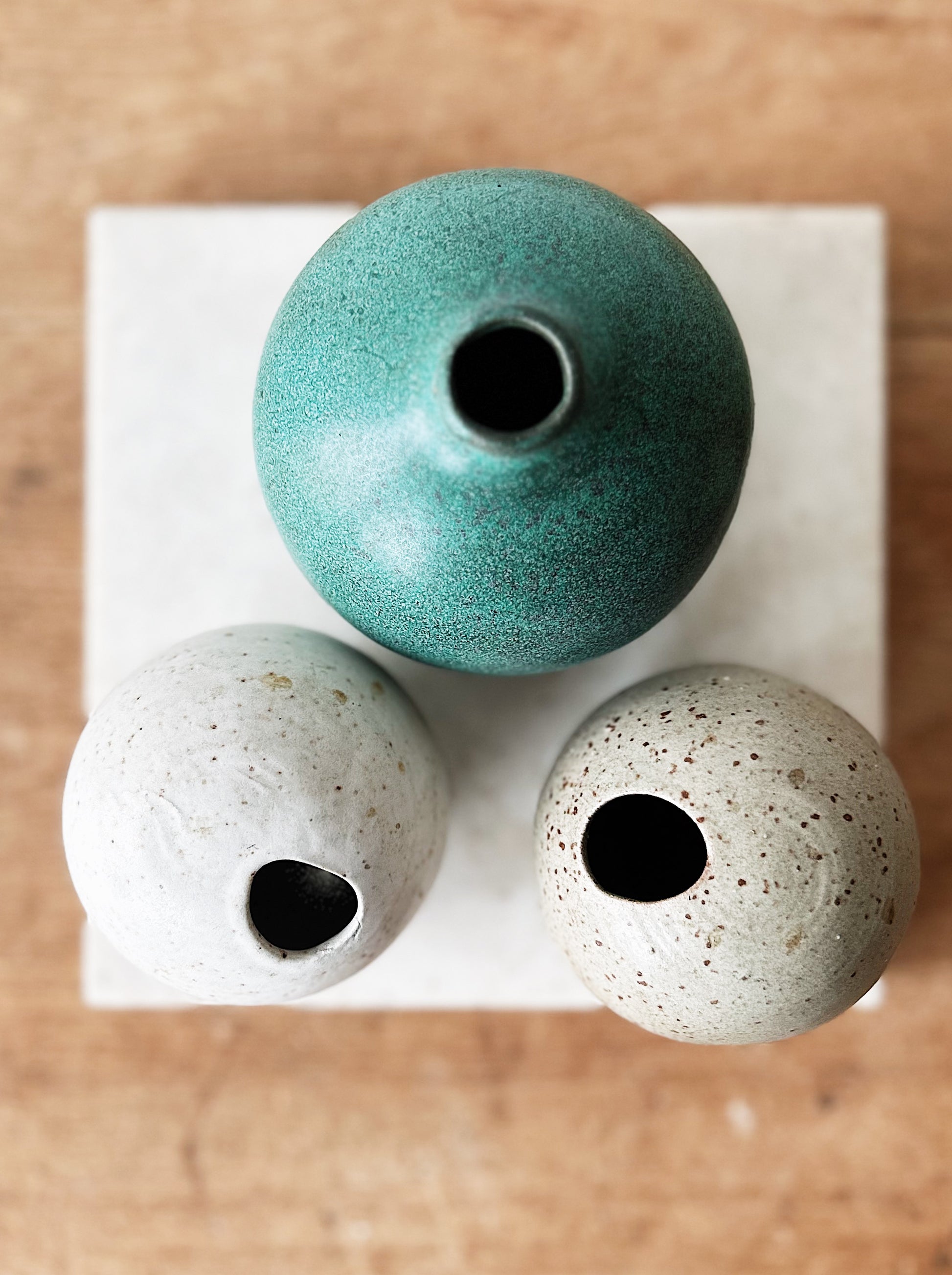 A pretty little ceramic weed pod vase in matte jadeite green. Feels lovely in the hand. Looks even prettier on the shelf. Signed.