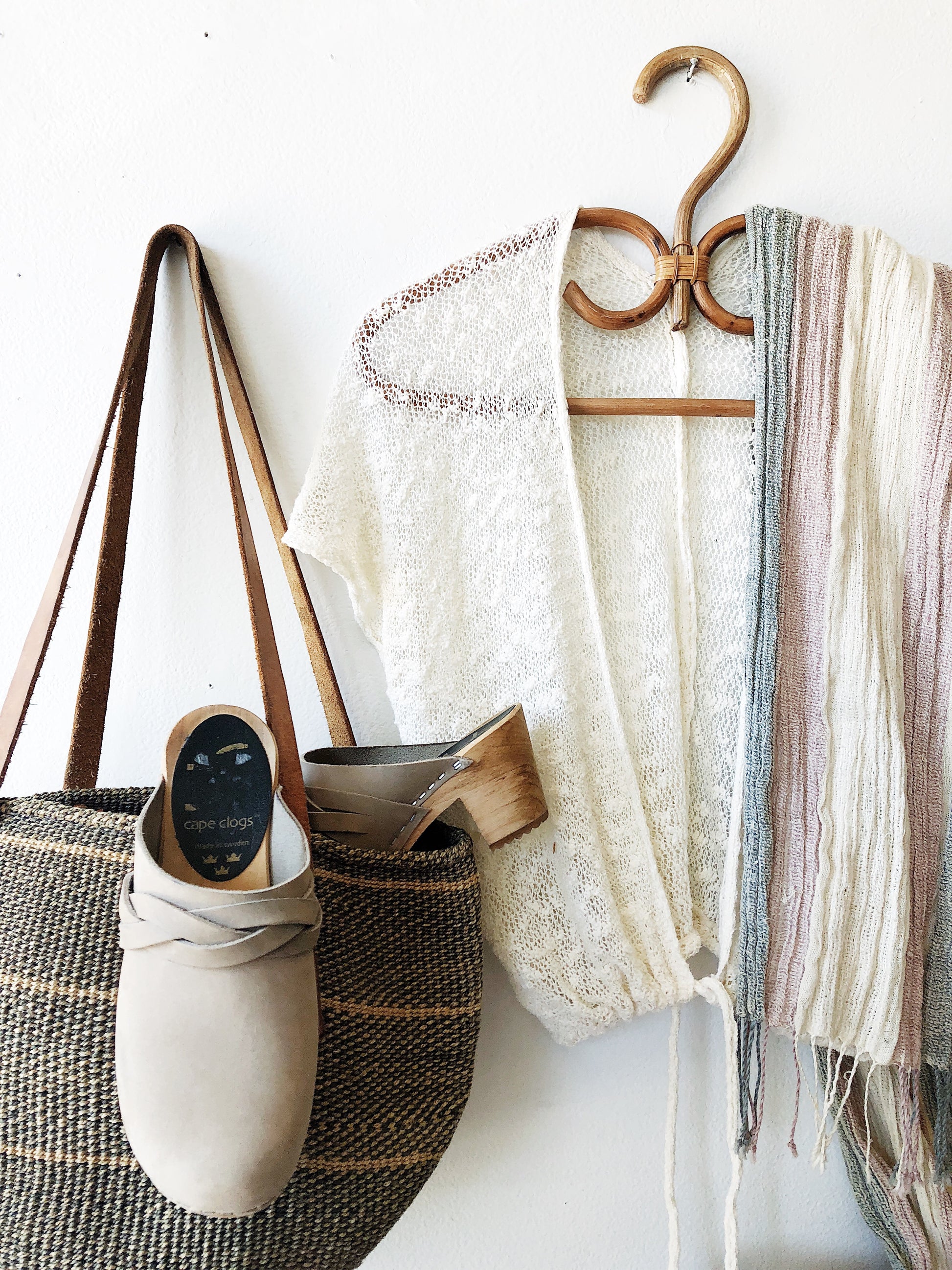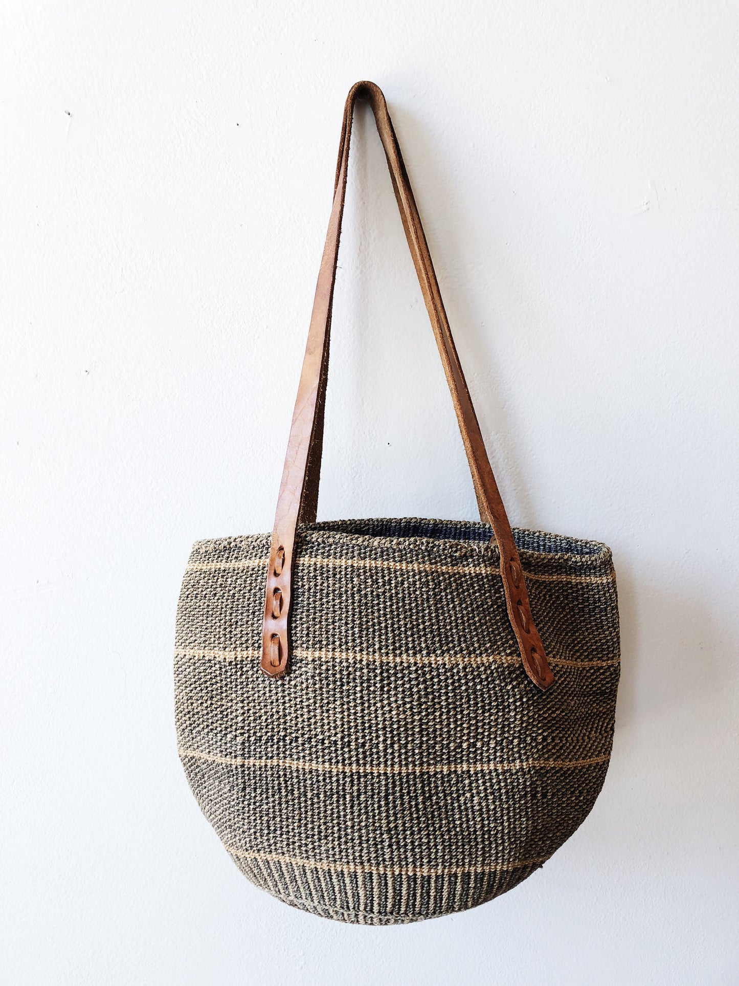 We love these Kenyan bucket bags for their ability to go from beach to farmers market. We use them all year round. This one is particularly nice with its grey blue palette. Leather straps.