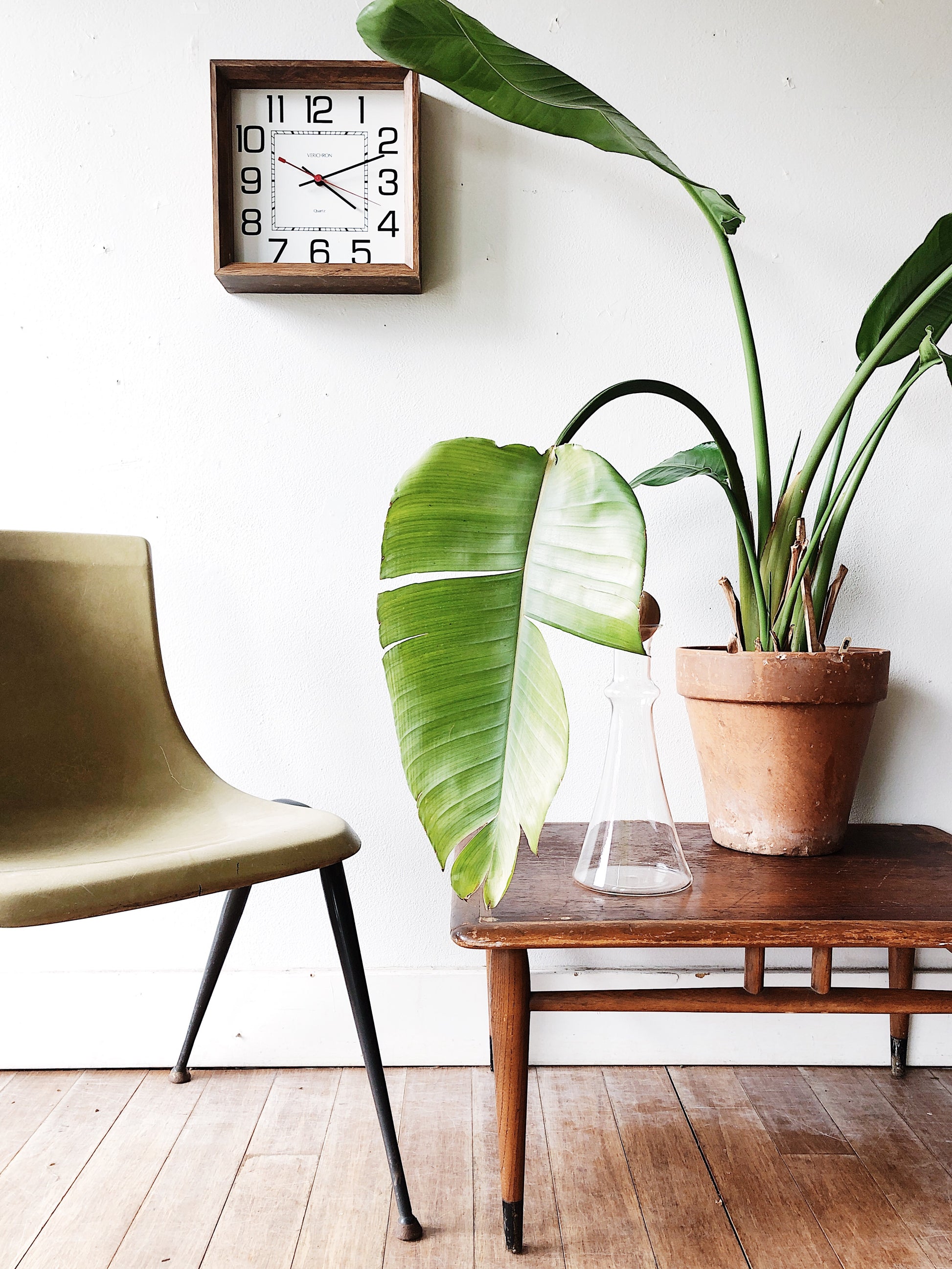 A vintage Verichron kitchen clock. Wood veneer chunky frame. This will sit or hang. Nice graphic face. Battery operated.