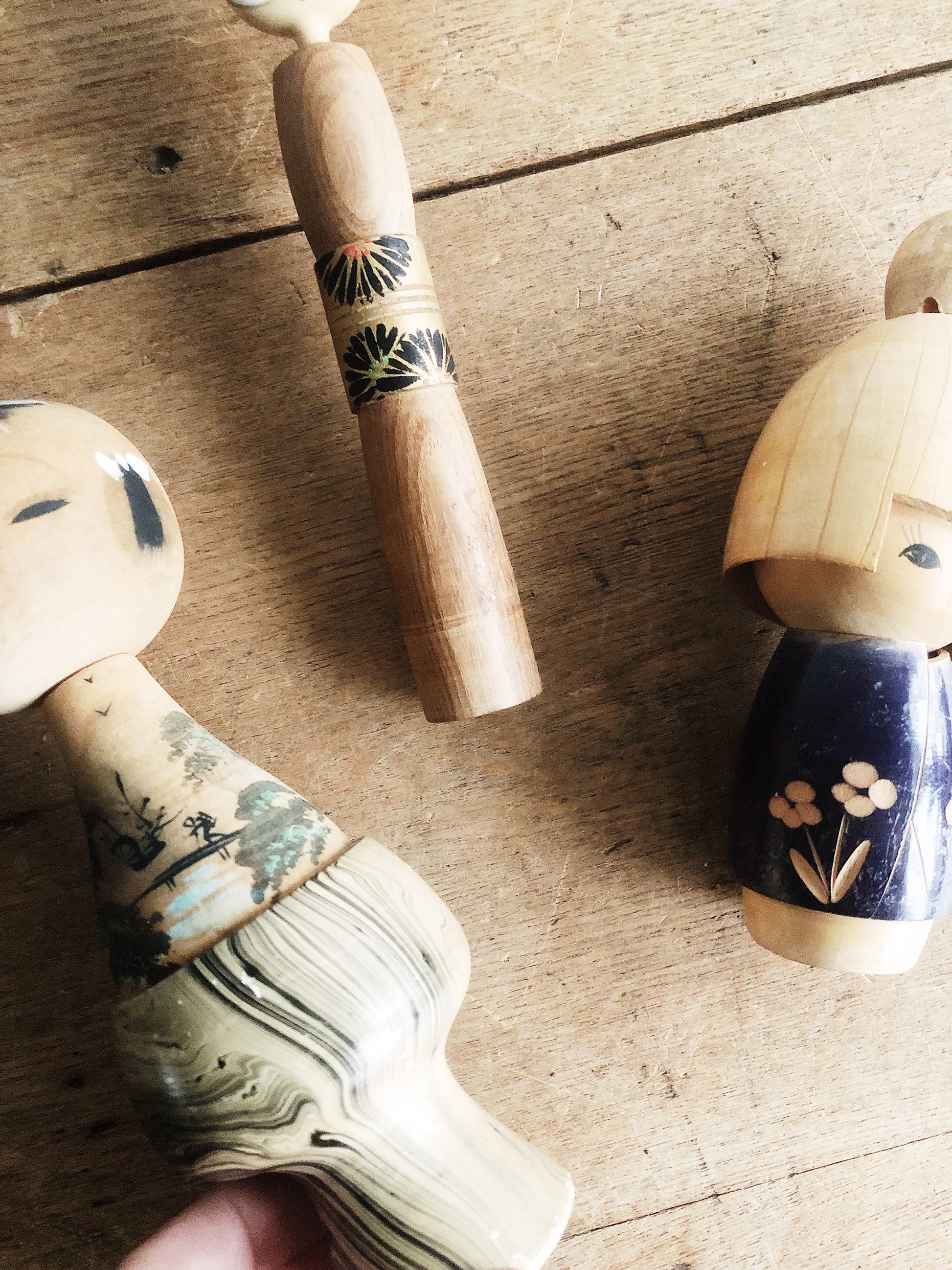 We have a soft spot for vintage kokeshi. The patterns, colors and varying designs make us long to collect them. Hand painted in Japan