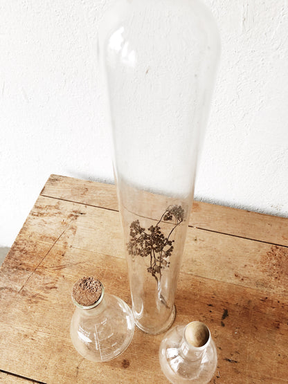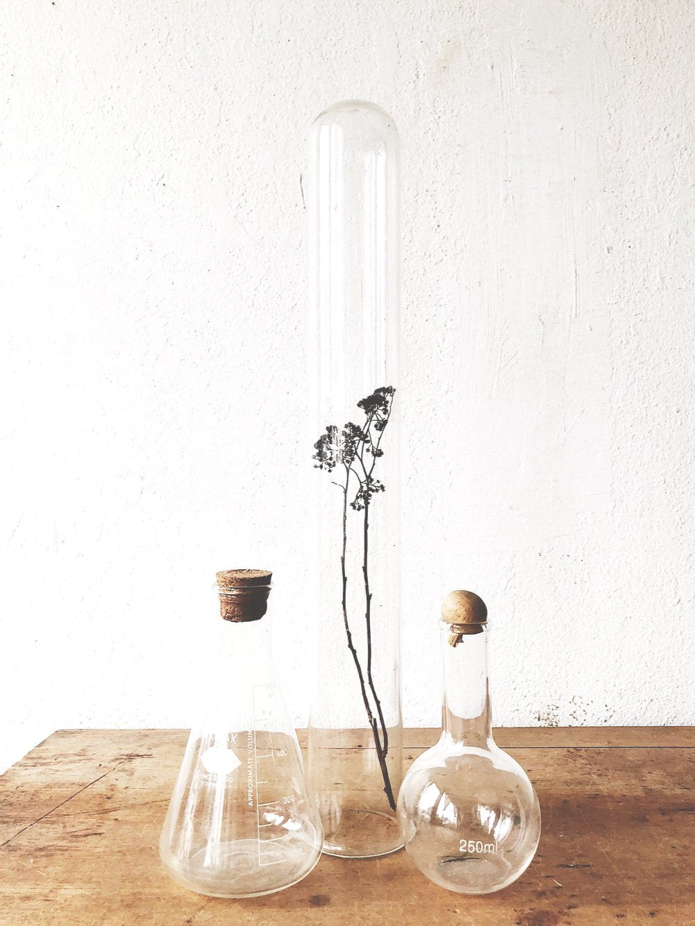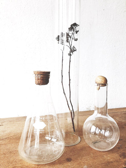 A trio of vintage Pyrex lab glass. A super tall test tube and two beakers. This makes a lovely propagation area for plants
