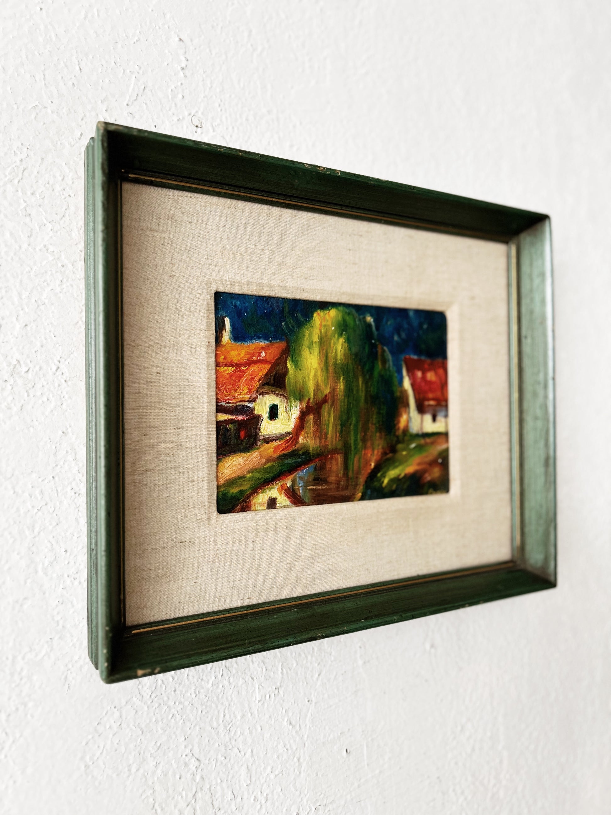 Vintage original oil painting on canvas. Landscape in rich, earthy colors. Presented in a wood frame with raw silk. Signed