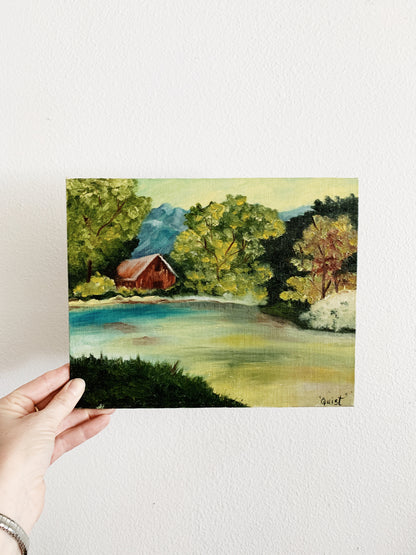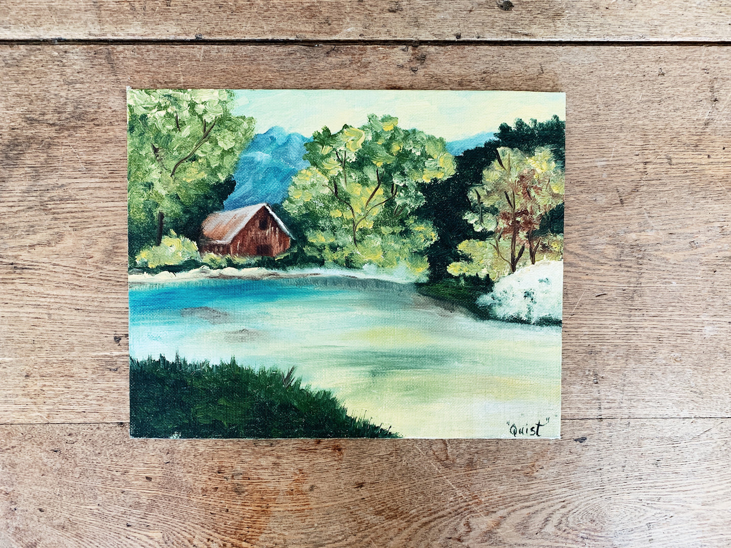 Vintage landscape painting on canvas panel. Love those mountains in the distance.