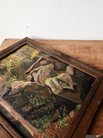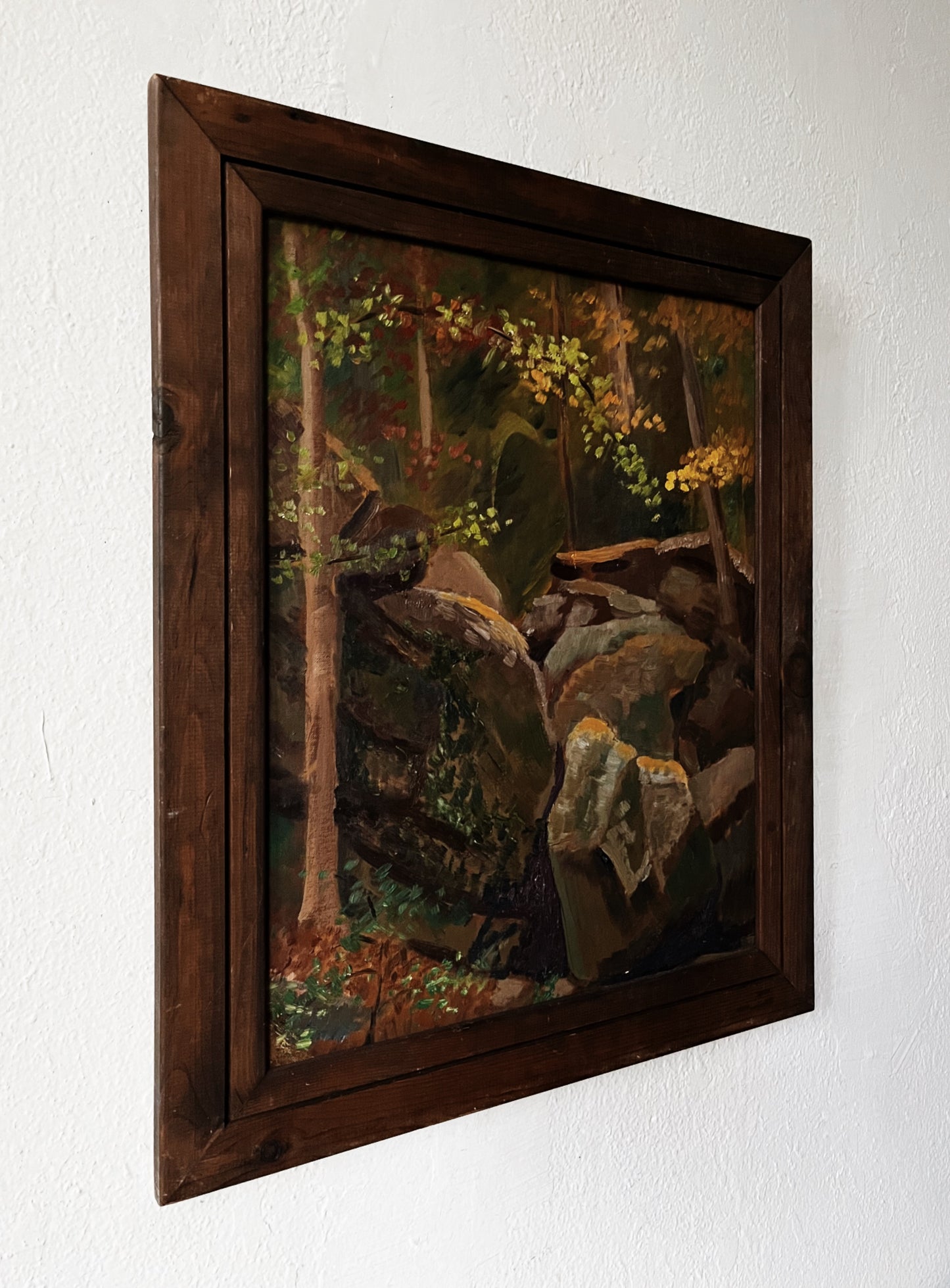 Landscape oil painting on board. Note the unique brush strokes. Beautiful old wood frame. The whole painting reads moody and secretive. The painting bows out a bit so that it’s a bit concave but the overall look isn’t affected once hung