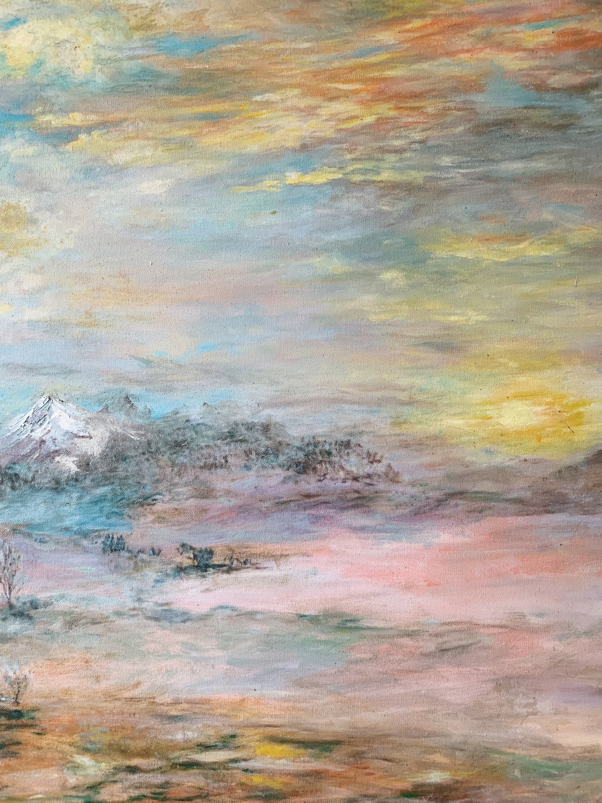 Really beautifully done abstract landscape painting framed in natural wood. The colors and brush strokes are so calming and peaceful.