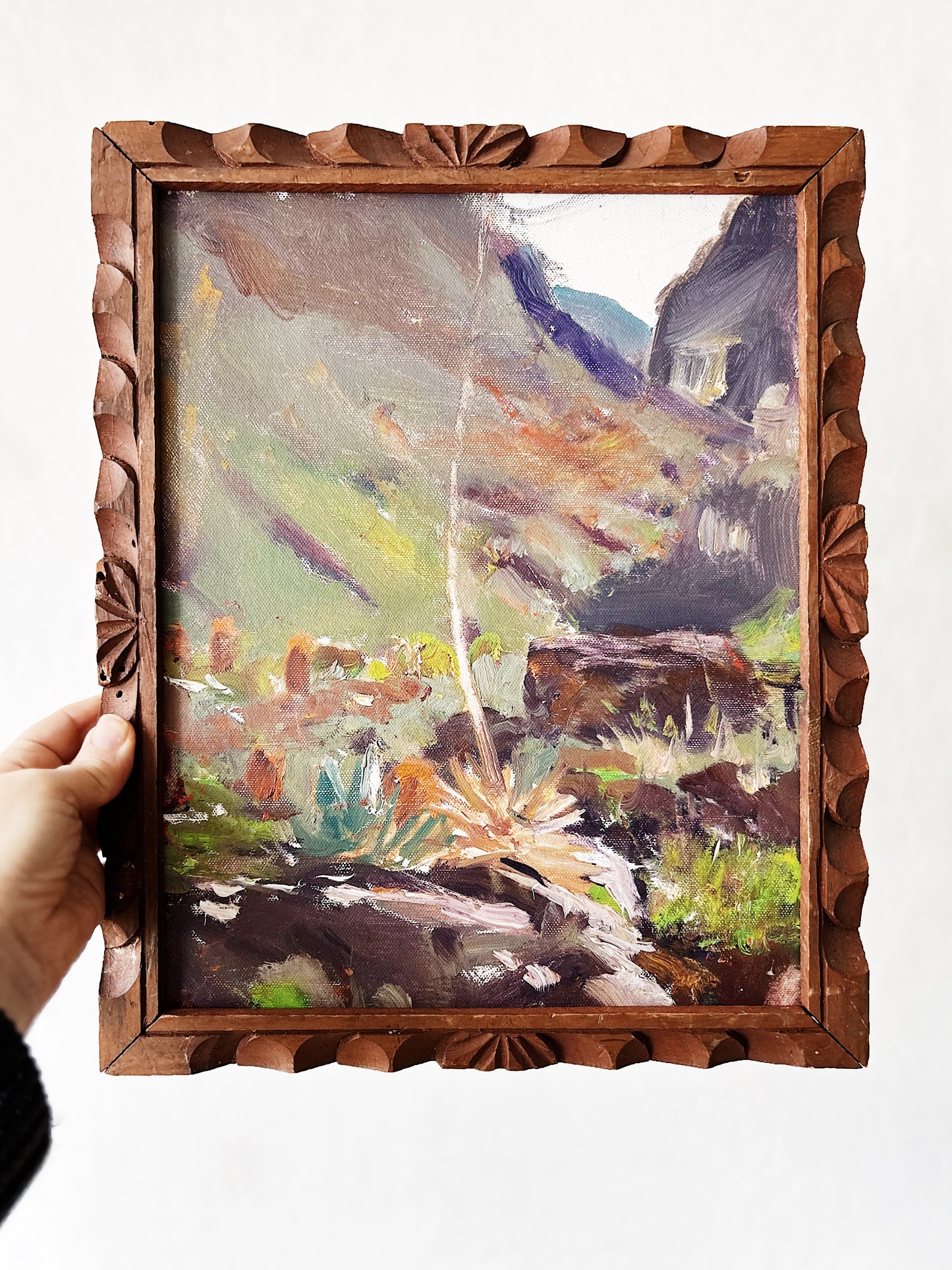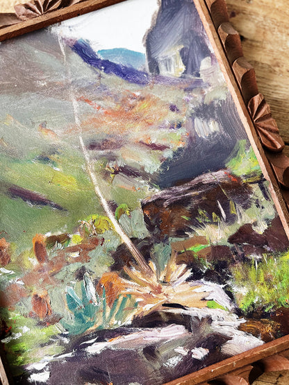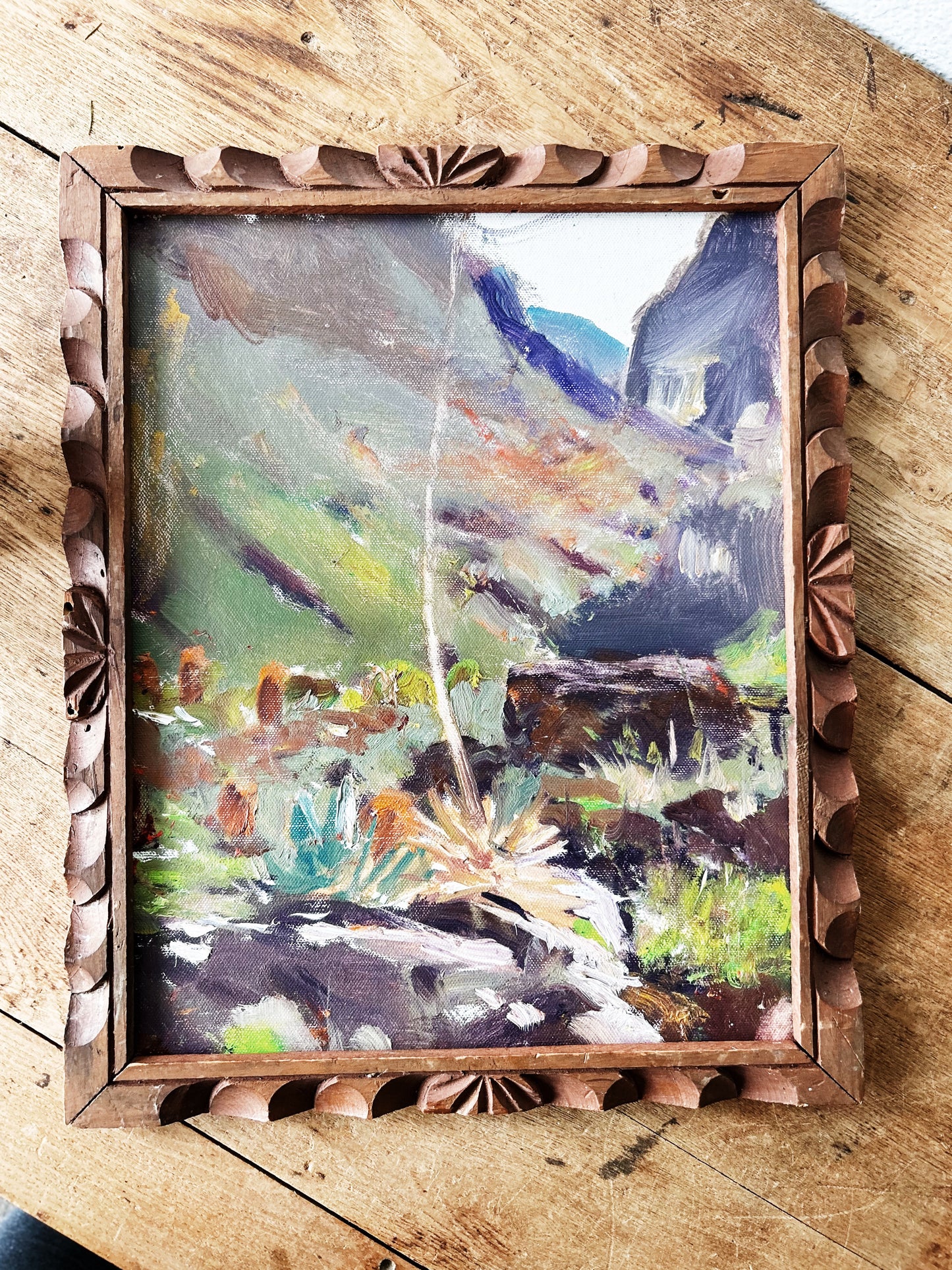Beautiful old oil painting of a blooming agave in the hills. Oil on board. Framed in a Victorian era carved wood frame. From our personal collection