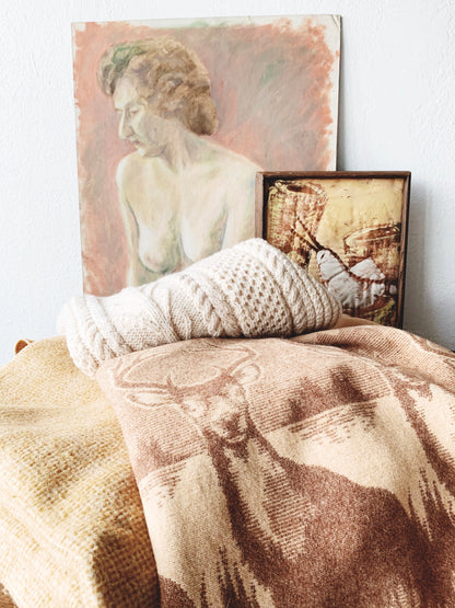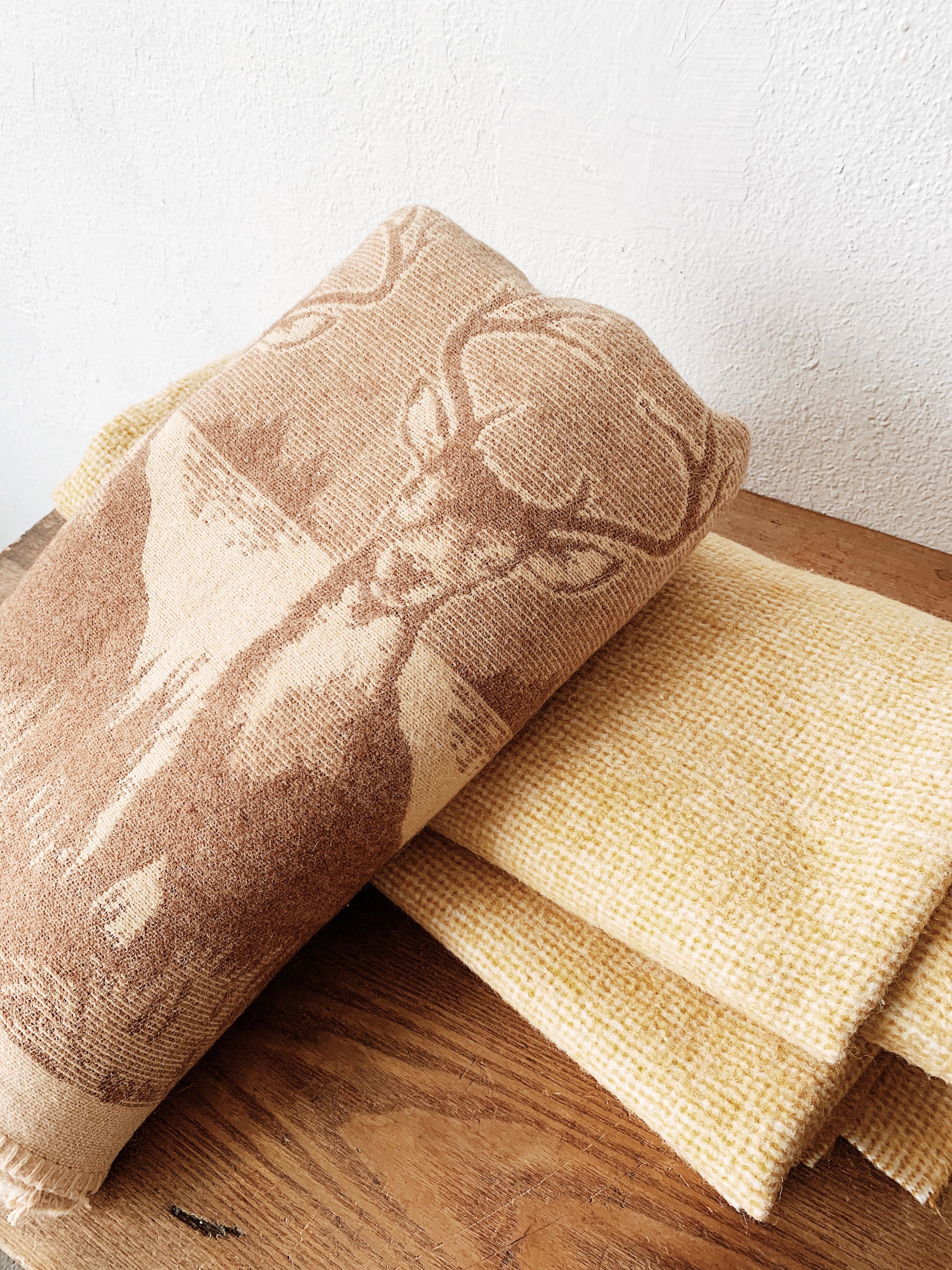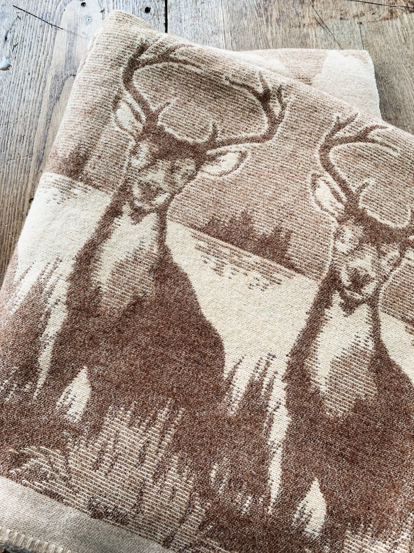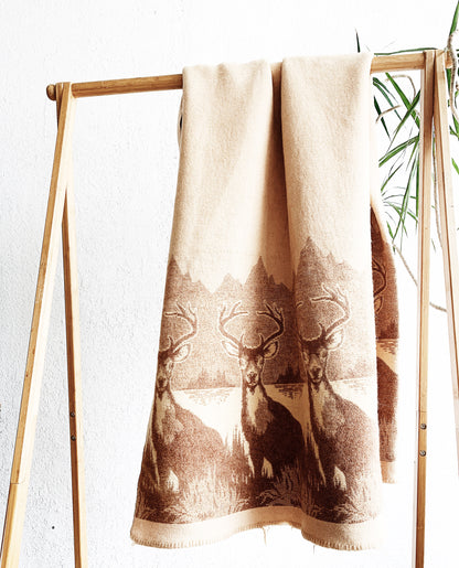 Vintage large wool blanket with bucks and mountains at both ends. This is a good one! No holes or stains. Pretty light sand/ apricot color overall with cocoa colored bucks.