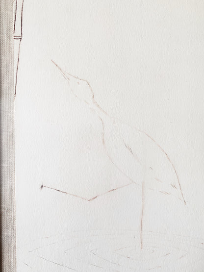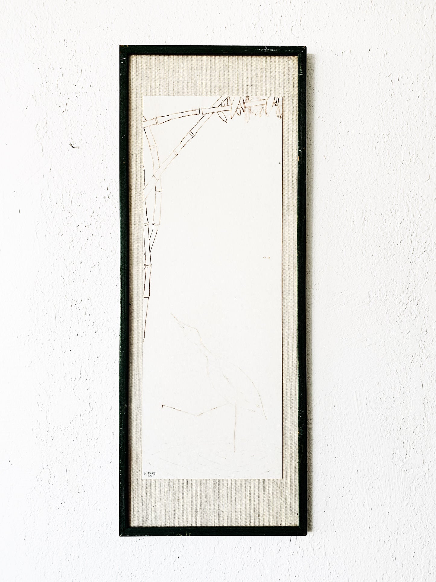 Beautiful and delicate India ink drawing dated 1968. Love the stylized ripples of the water. Completely zen. Framed in dark green wood and glass