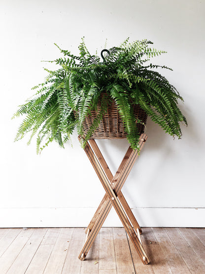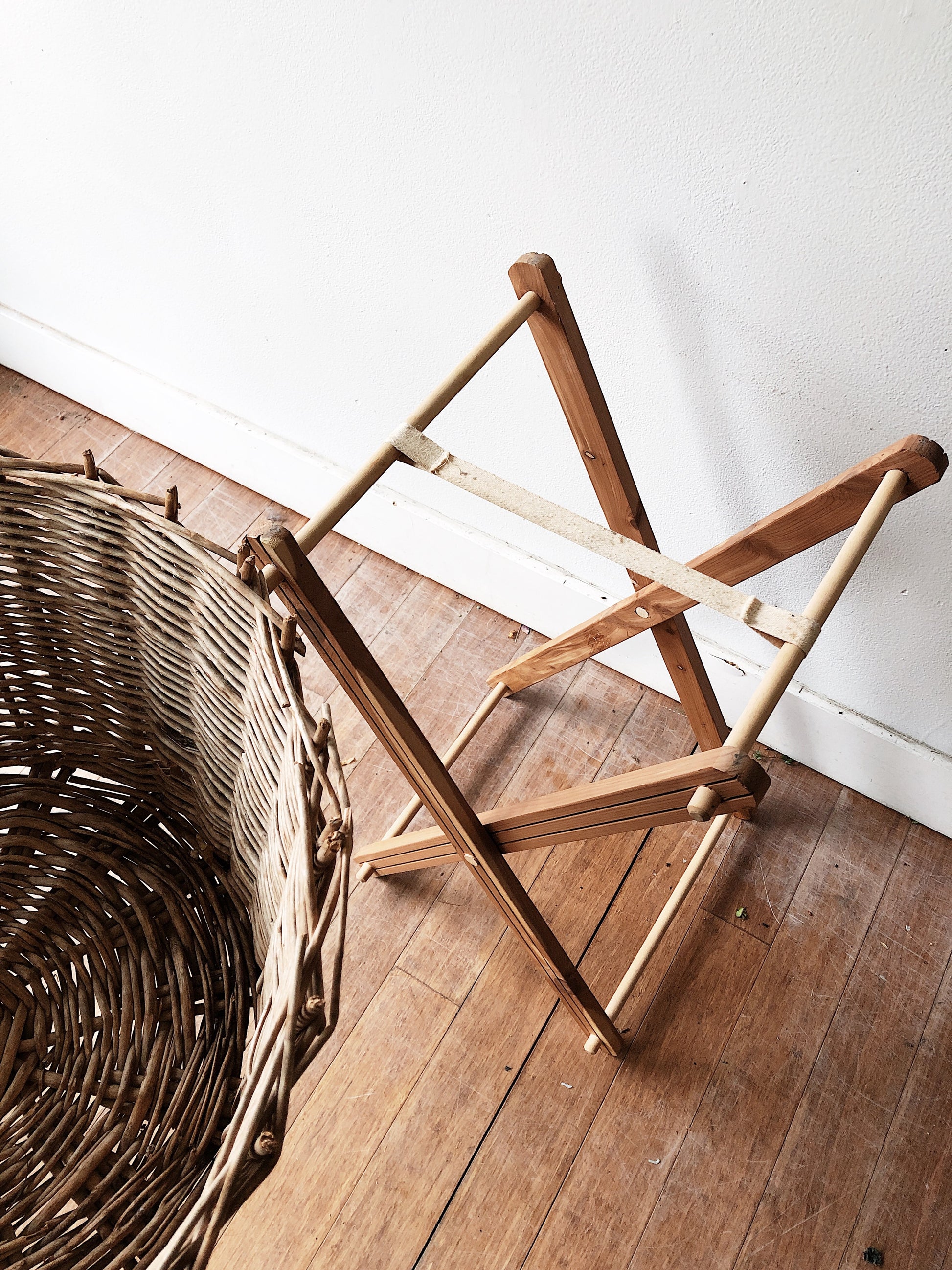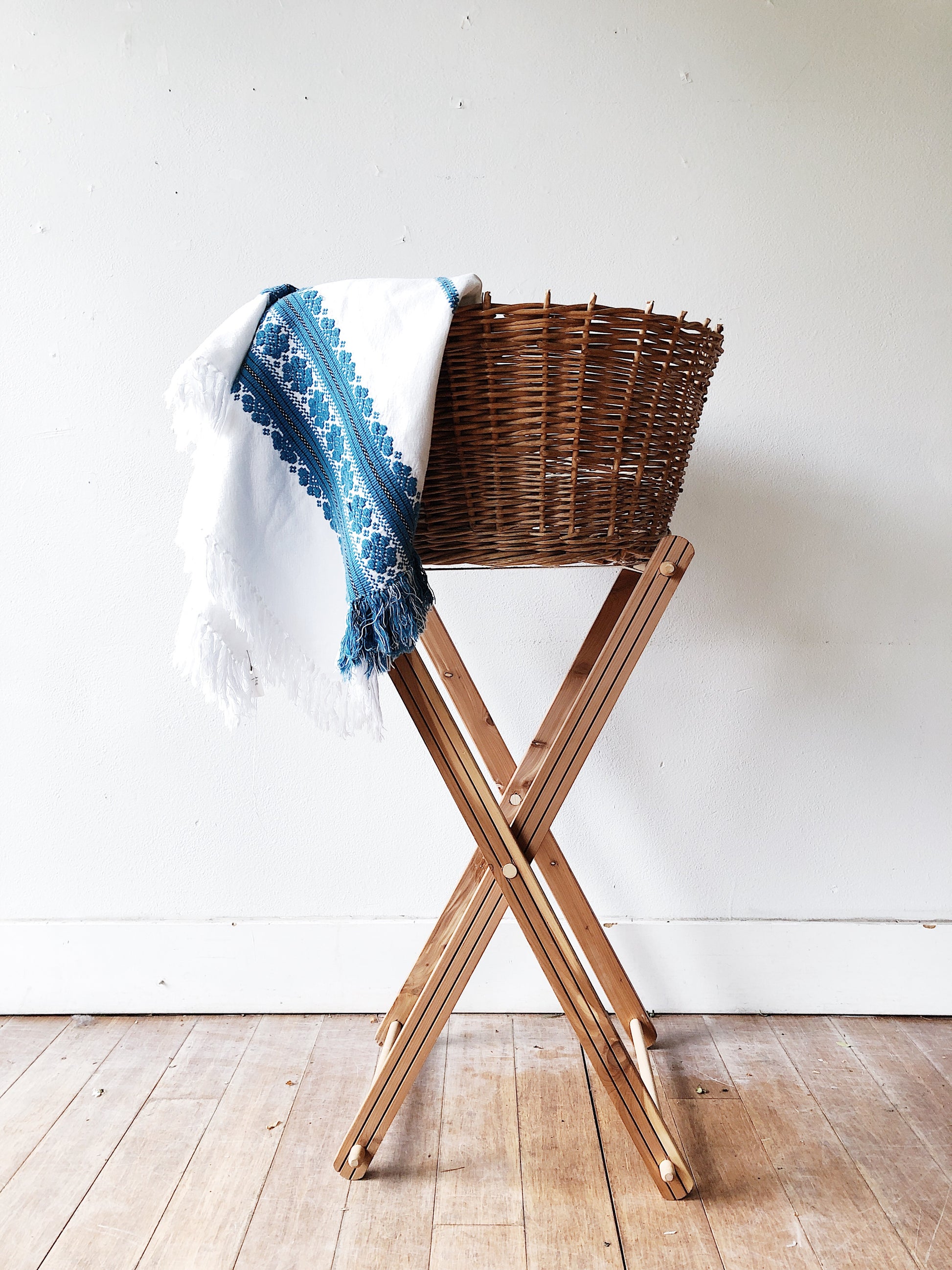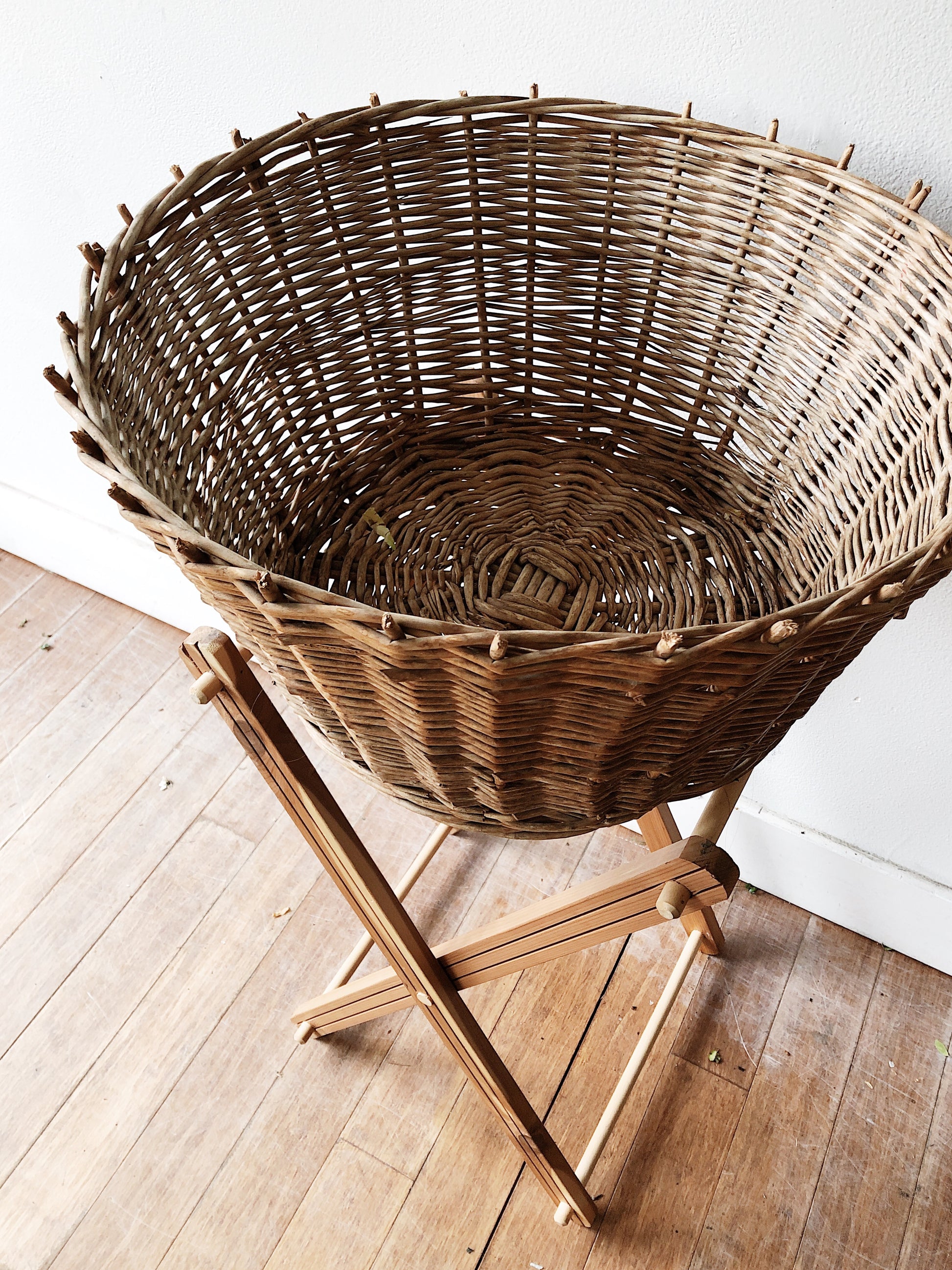 Nice vintage laundry set of basket and stand. The stand is wood and folds up. The basket is older but intact and sturdy.
