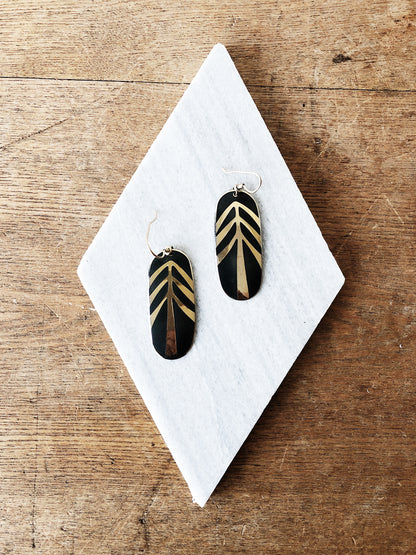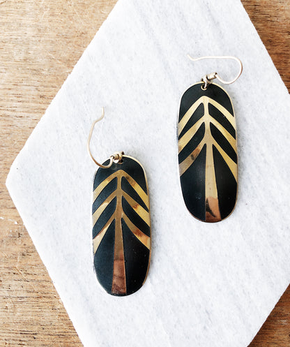 Vintage Laurel Burch drop Earrings. Collectible artist-made jewelry. Stylized tree design. Black enamel and gold tone