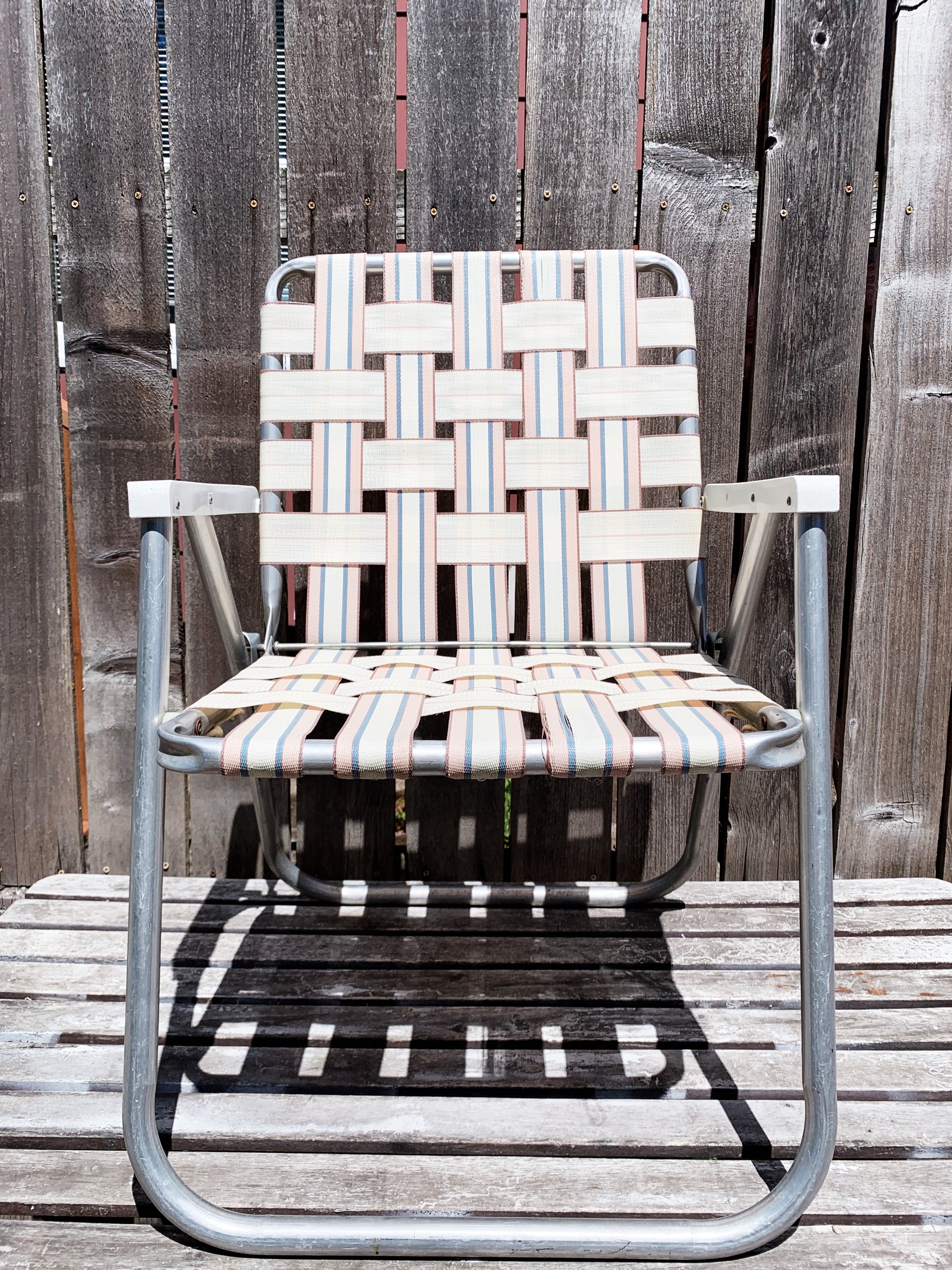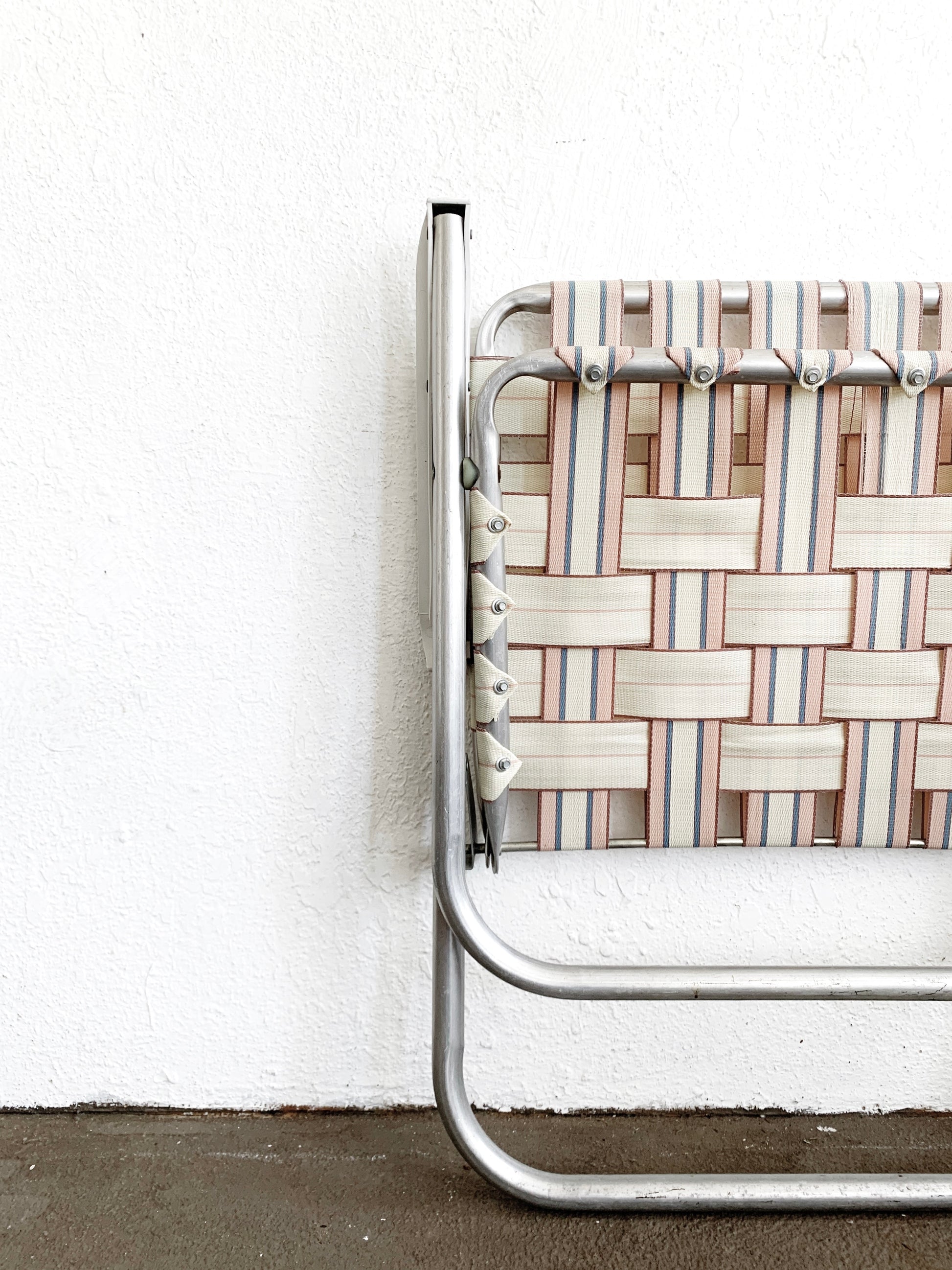 Classic vintage folding aluminum lawn chair with pink, blue snd beige strips. In great condition.