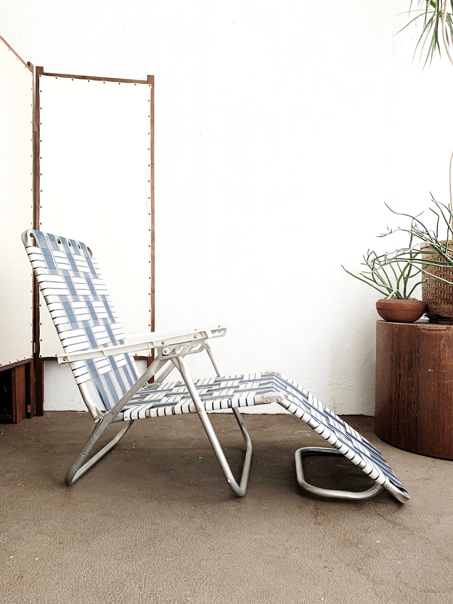 Fantastic folding aluminum lounger. Navy and white webbing. In excellent condition.