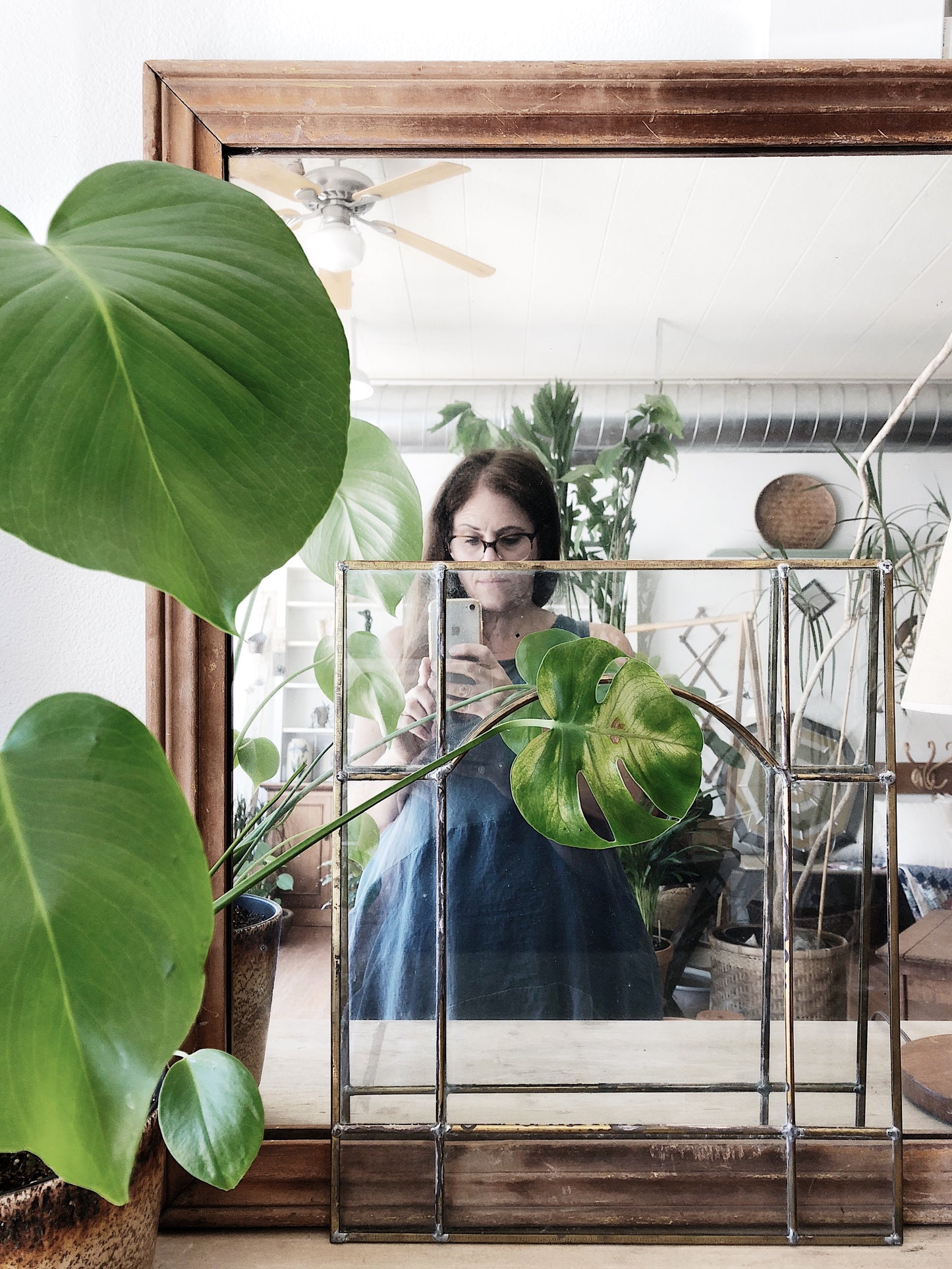 A lovely leaded glass window with aged brass trim. Perfect in front of a mirror or another plain window