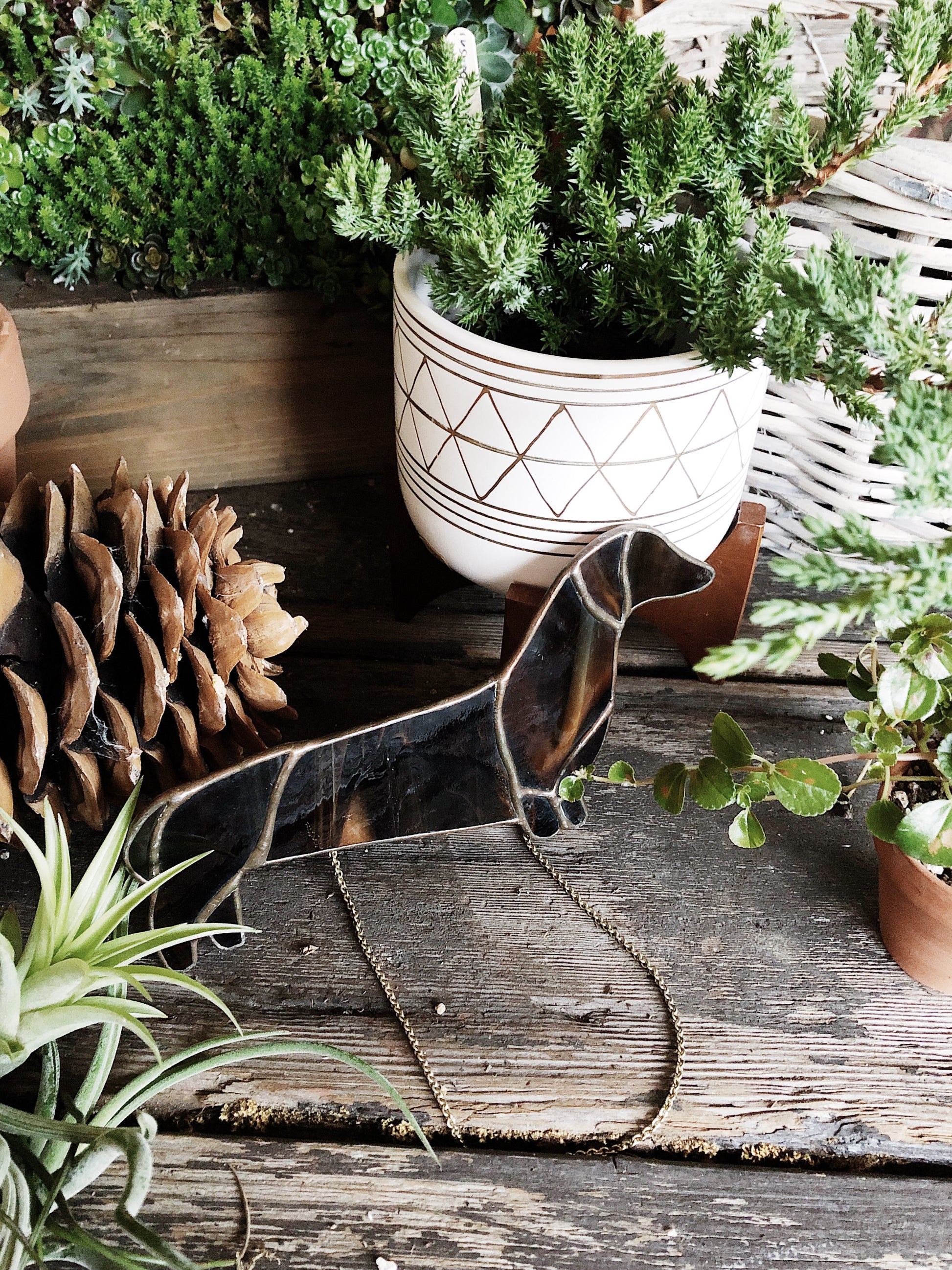 A sweet leaded glass dachshund with a delicate brass chain. Deep brown glass.