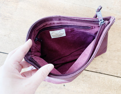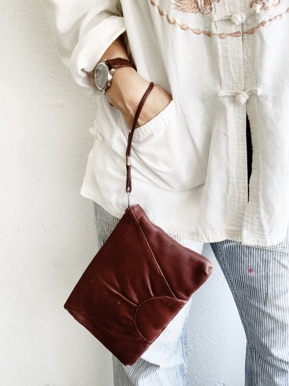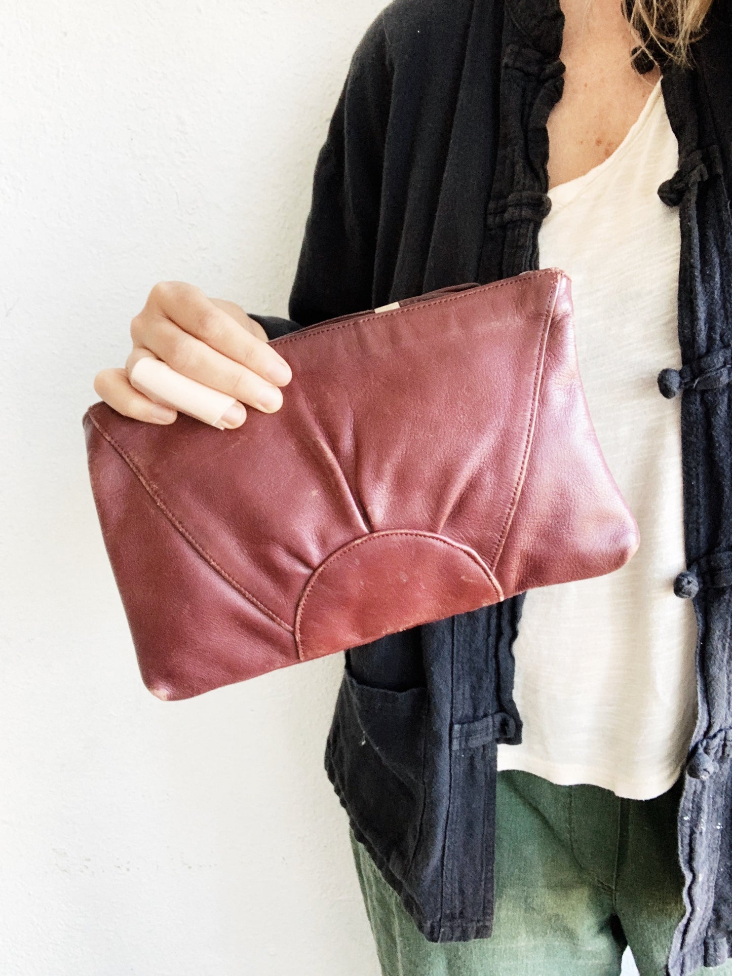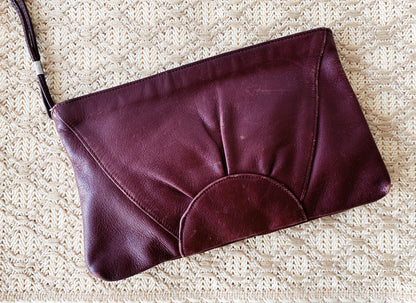Nice vintage burgundy leather clutch with excellent sunrise detail. Clean cotton liner with zip pocket. Love this one. In great shape.