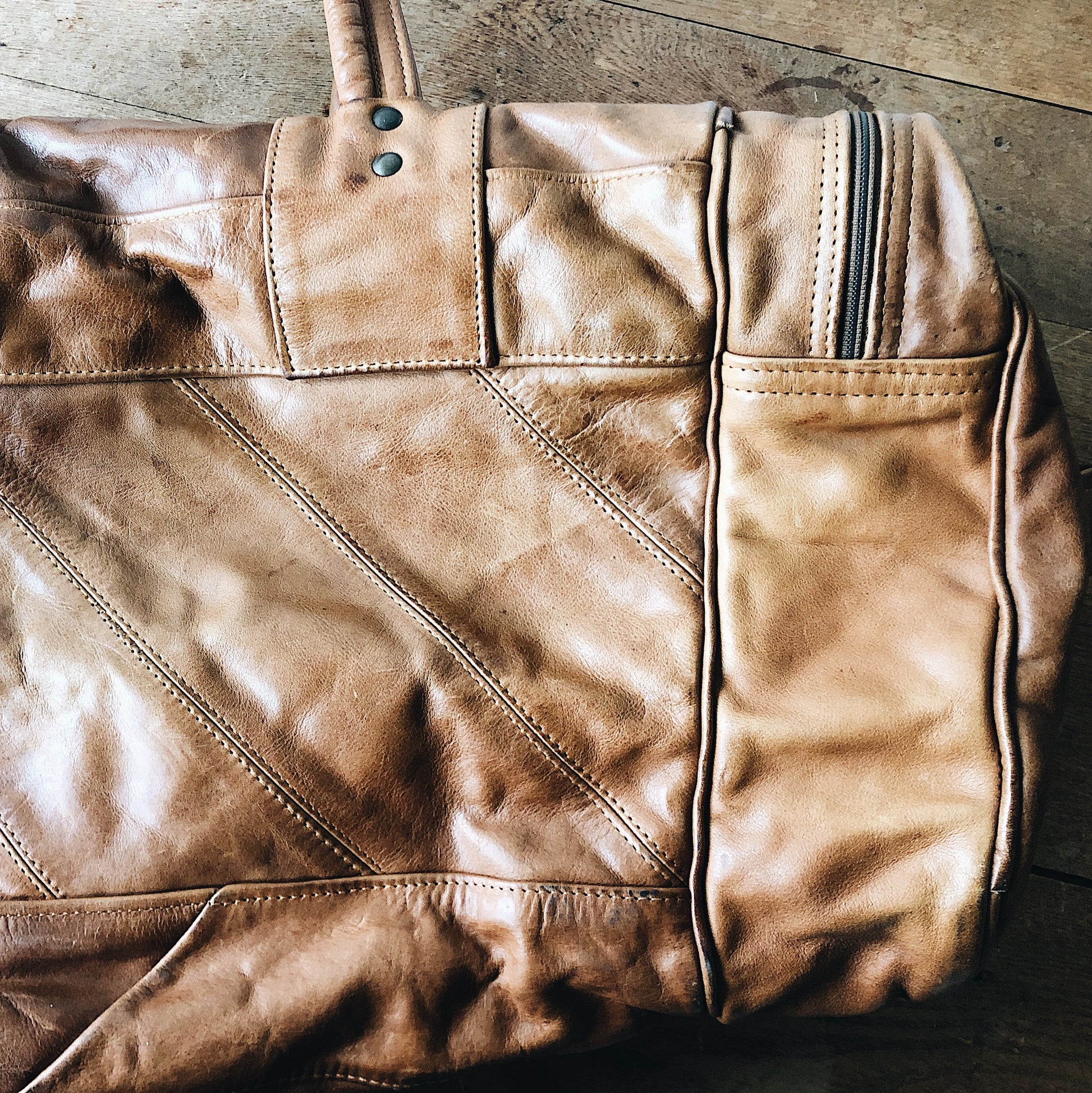 Fab vintage leather duffel bag with lots of carry room. Dual zipper top and end compartments. Bias patchwork design is our fave! Pocket on outside