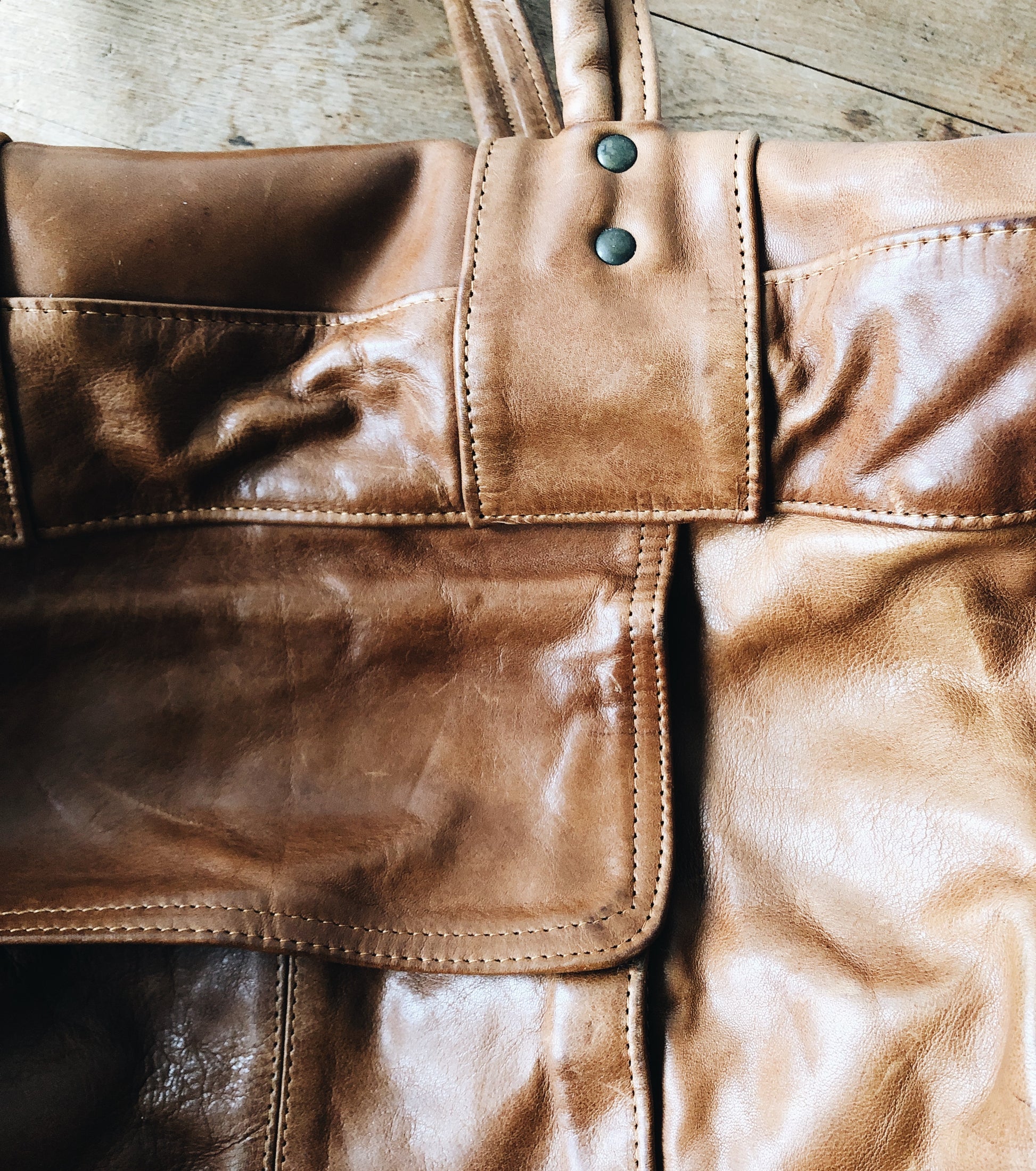 Condition: really nice with minimal wear. Some darkening to the leather at handle and underside. Nice tough leather!