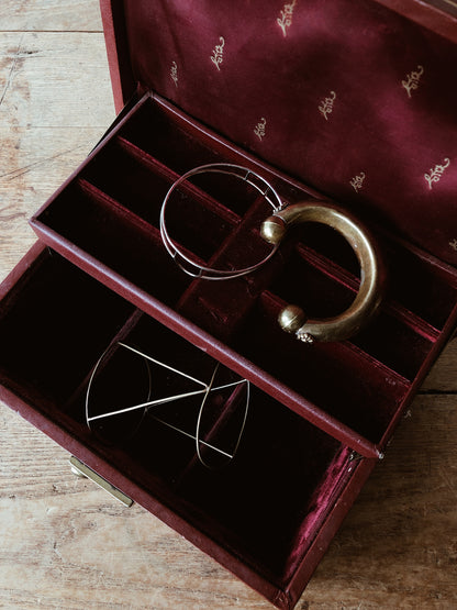 Wine red leather and gilt trim with nice brass hardware. Lined in wine red velvet with built in ring holders too.