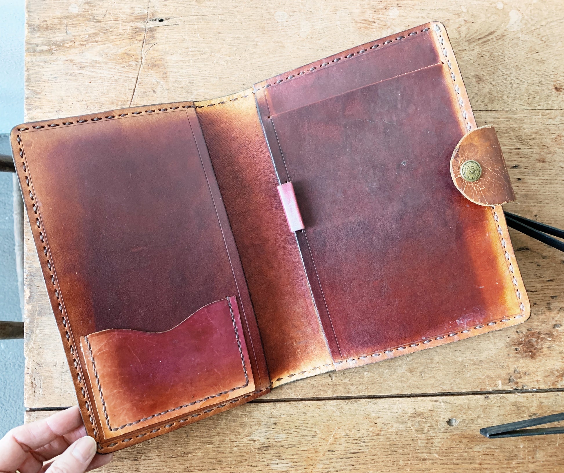 Vintage leather journal/ organizer cover with embossed rose. Thick high quality vintage leather with brass snap.