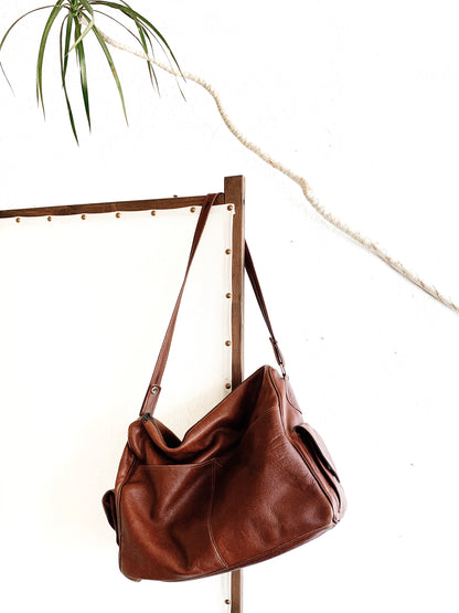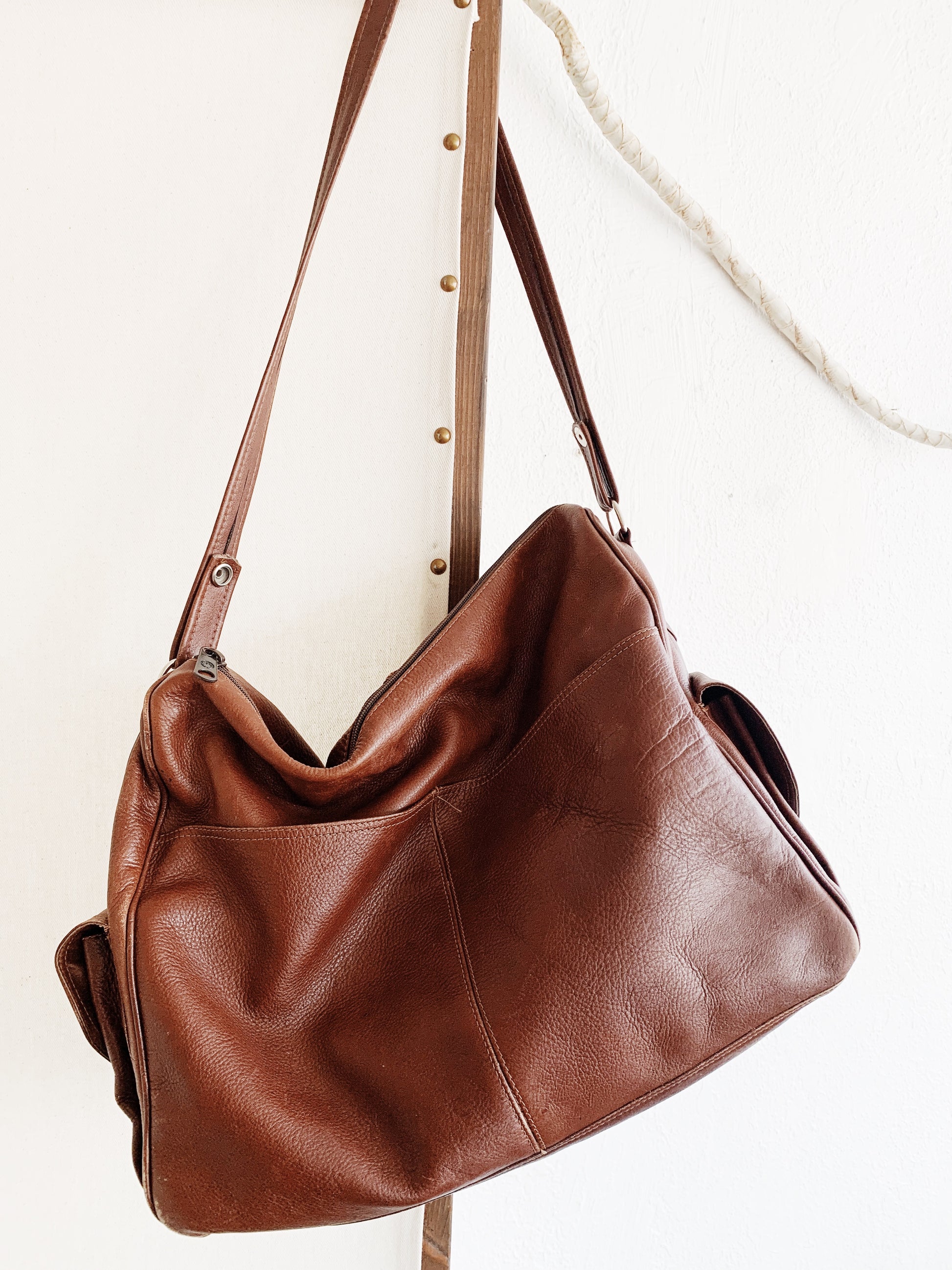 gorgeous larger sized leather satchel with plenty of pockets. Unlined and unmarked as far as maker. It’s nicely made! In great shape.