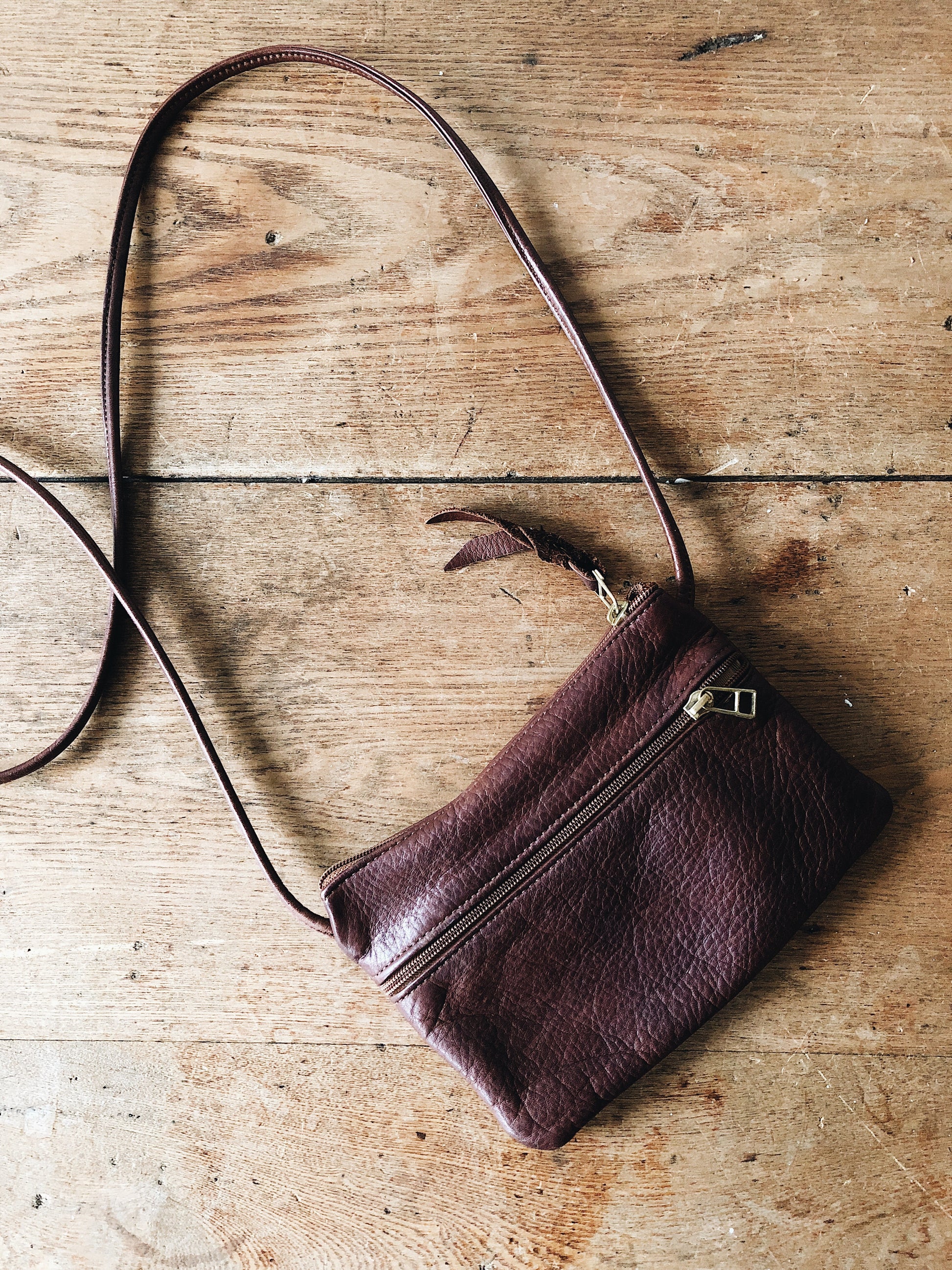 Vintage leather Sven bag with their trademark buttery leather and fine brass details. Perfect size for a phone, ids, and a lipstick