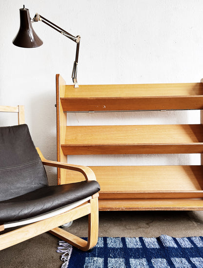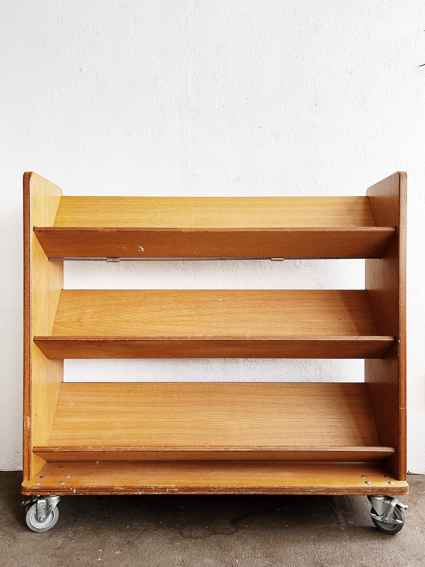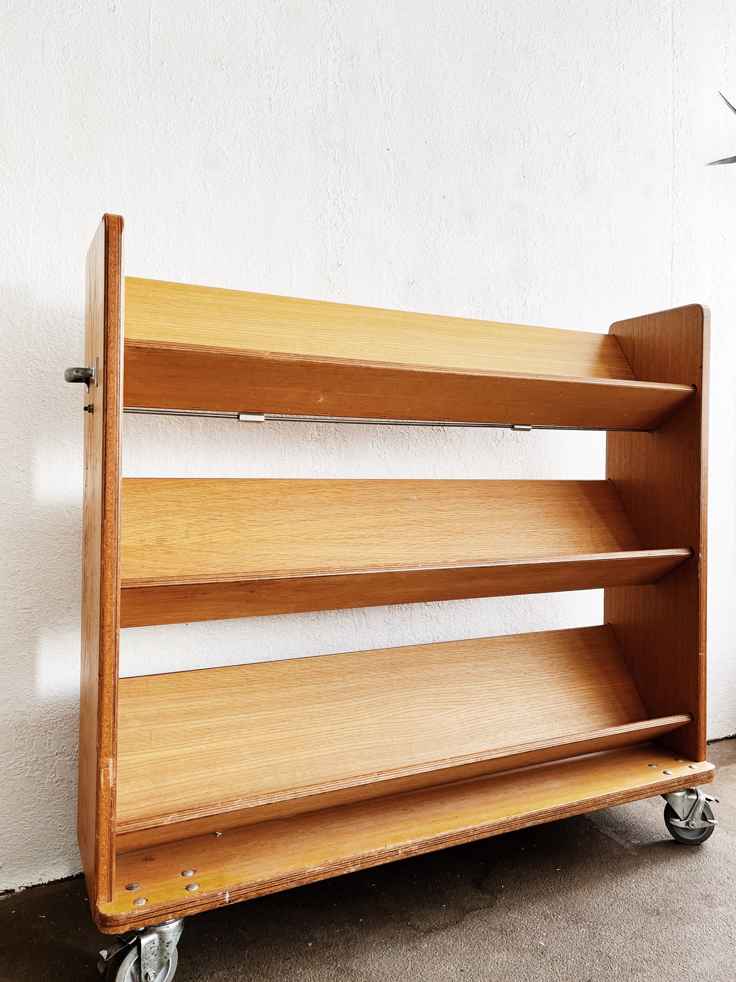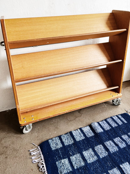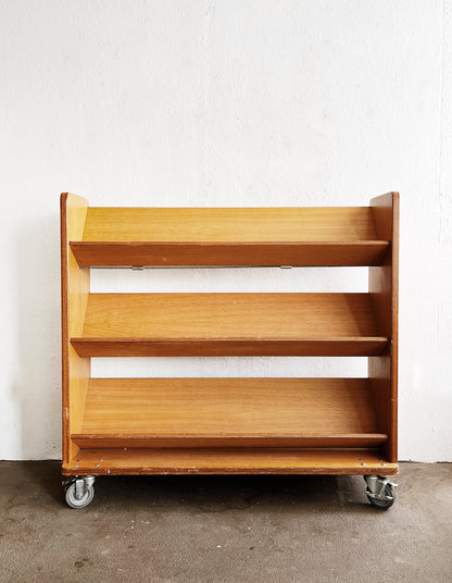 Nice big wood library shelf on casters. The wheels lock for stability. Handles on the sides and a top shelf support for weight. A great look for a reading nook. In great condition.