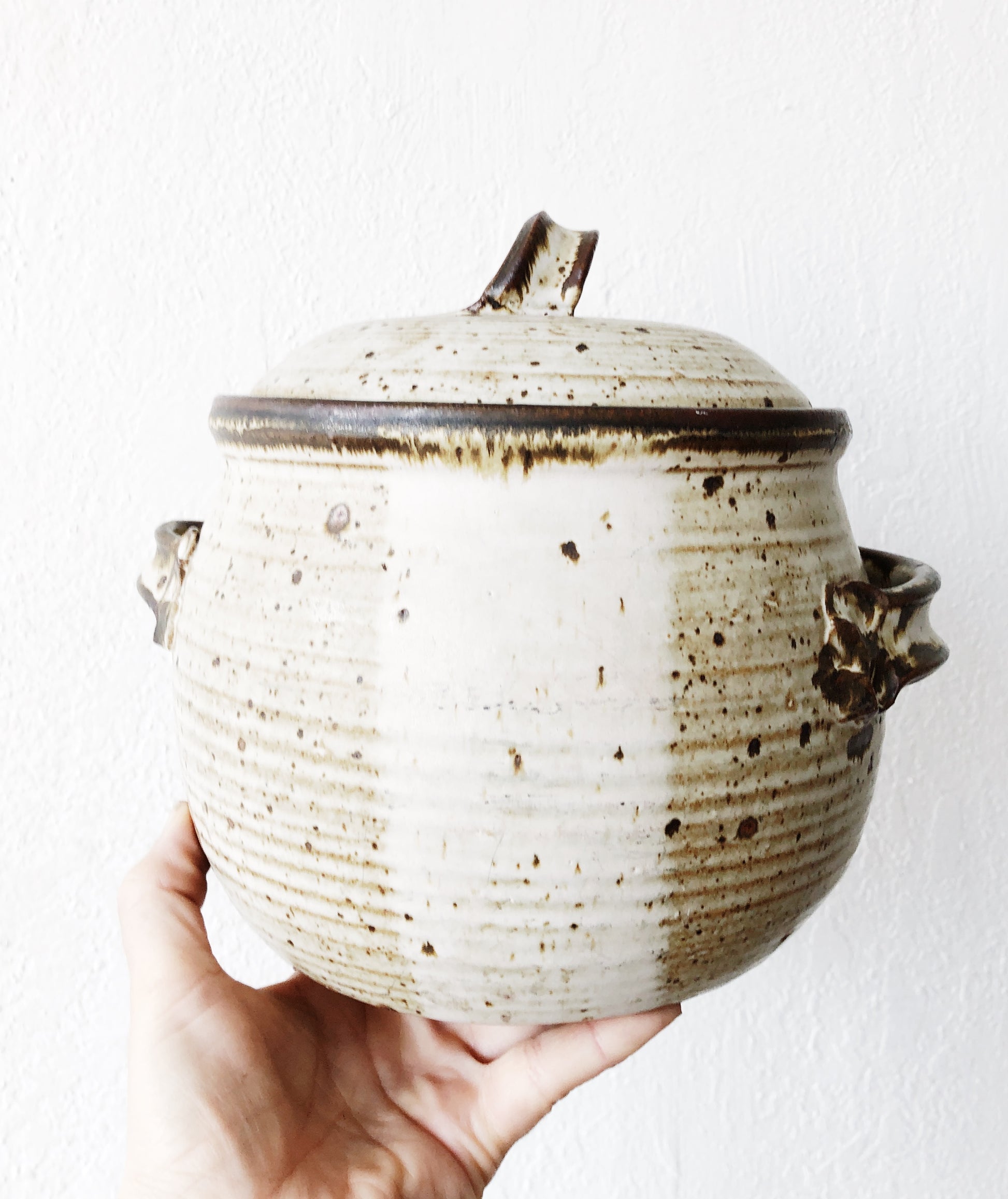 Beautifully glazed stoneware crock with lid. Handmade with matte and unglazed sections. Great handles. One of three we have listed