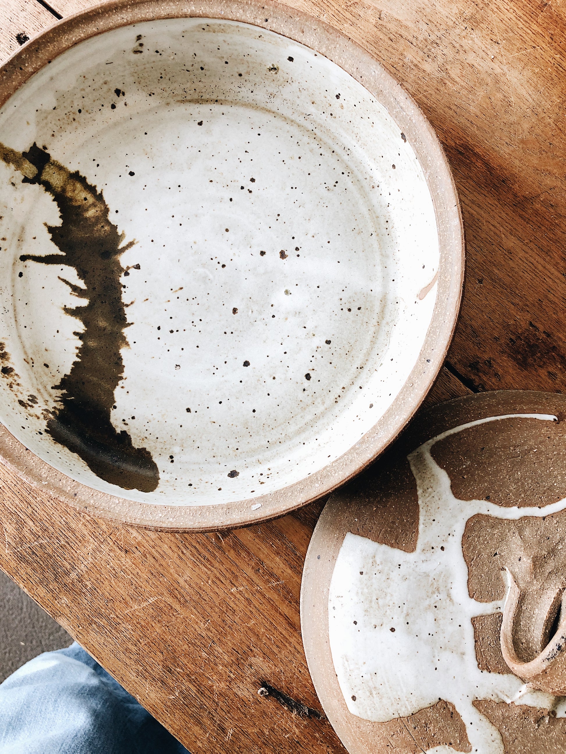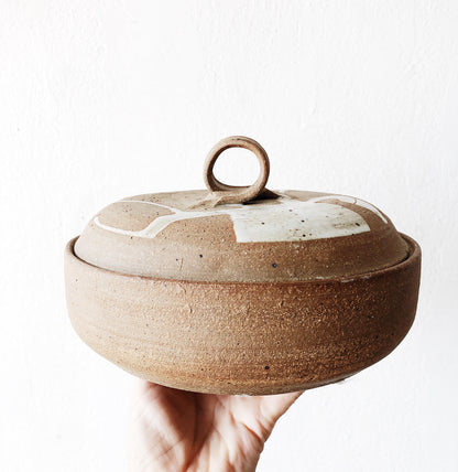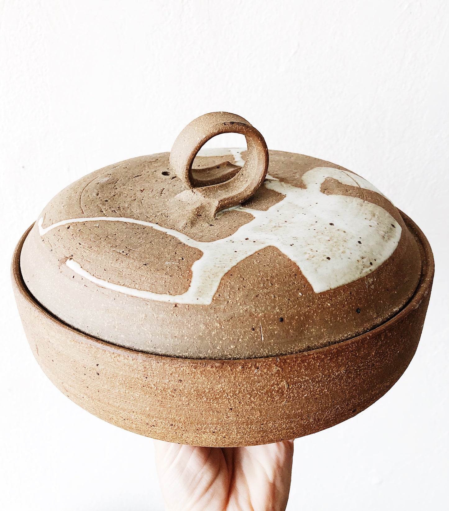 Beautifully glazed stoneware crock with lid. Handmade with mostly raw clay and matte drip sections. Great handles. One of three we have listed