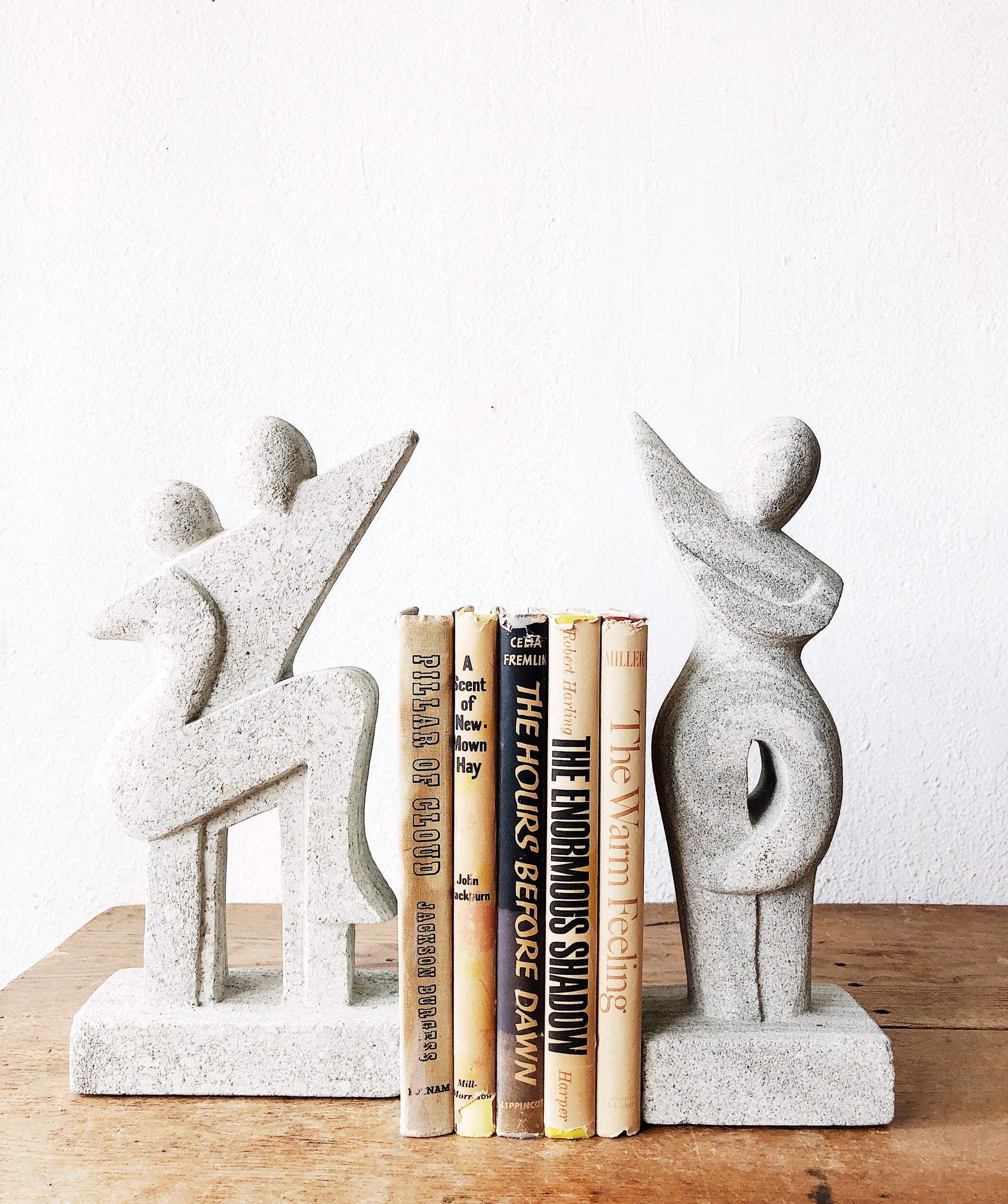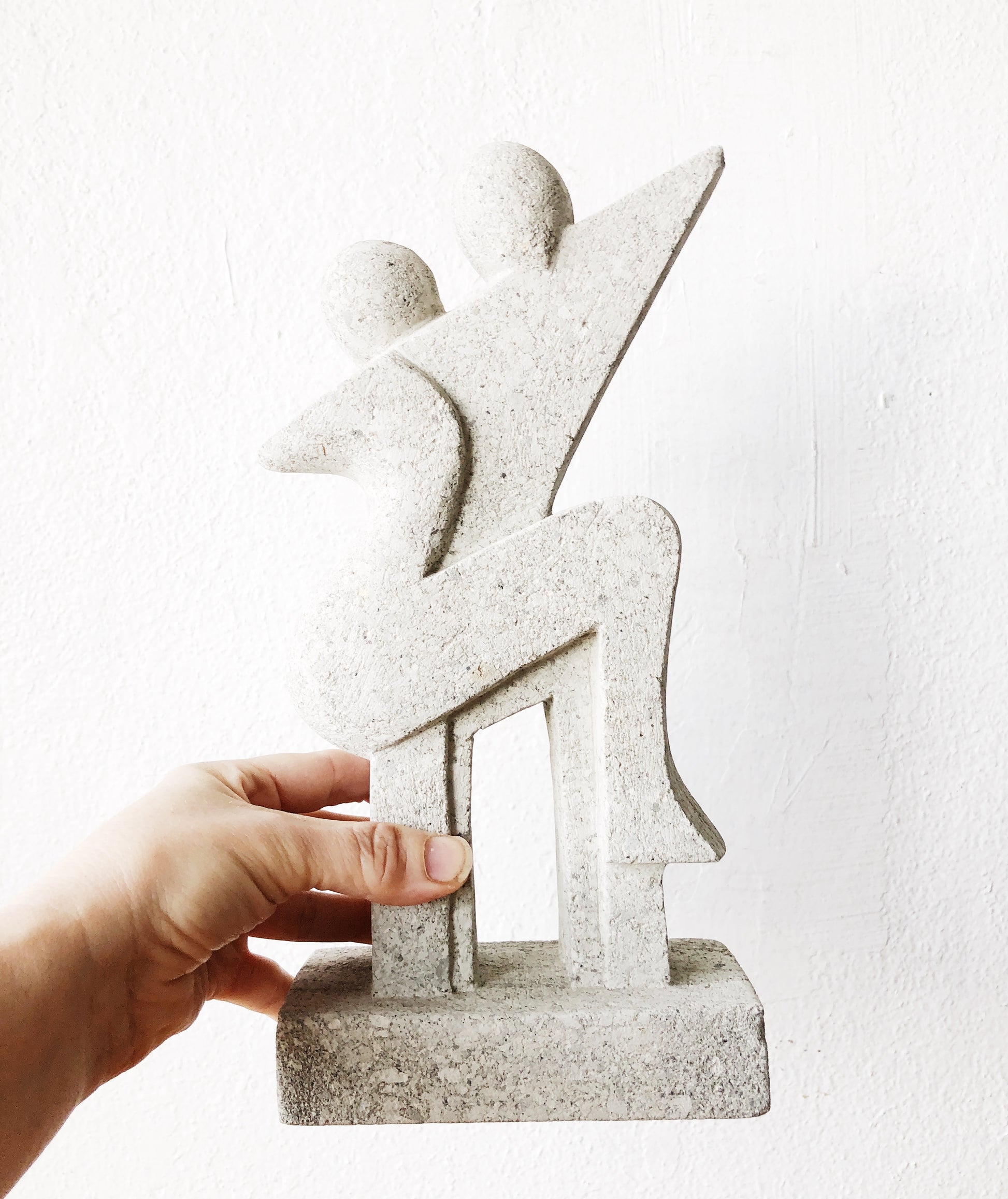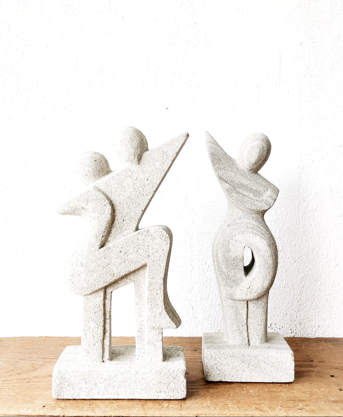Limestone stylized sculpture of the human form. Deco influenced. Medium weight and nice for bookends or displayed amongst greenery