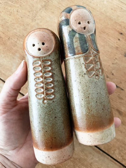 Mid century Lisa Larson pottery shakers or just display as the lovely figures they are. No stoppers but easy to get little corks at the craft store if you want to use them as shakers.
