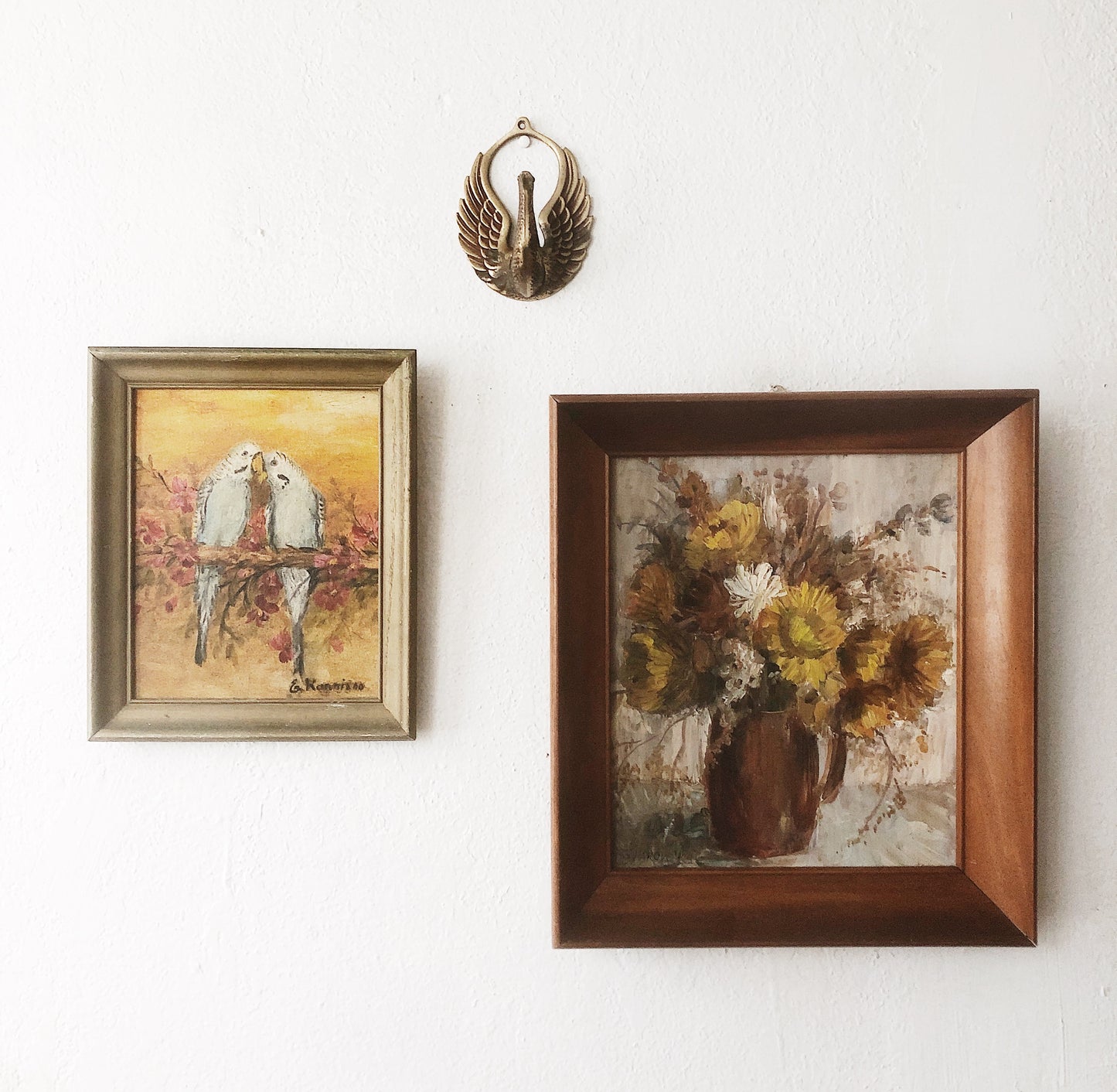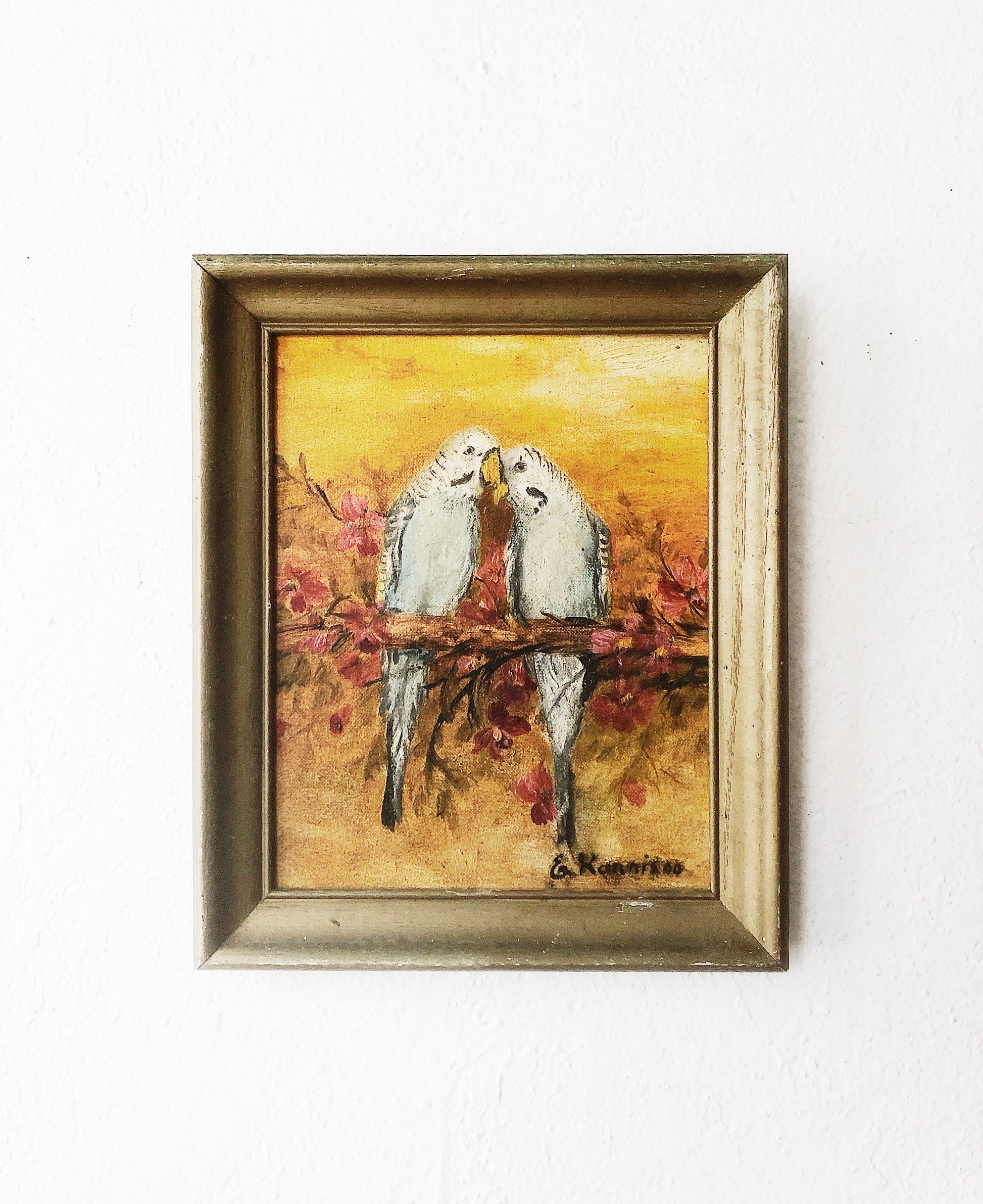 An old 70s oil painting on board of two parakeet lovers. We think this is just the sweetest. Signed and dated on back and framed in vintage wood