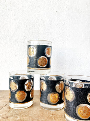 Vintage low ball cocktail glasses. Set of four, perfect for small holiday gatherings! Glamorous black and gold hand painted