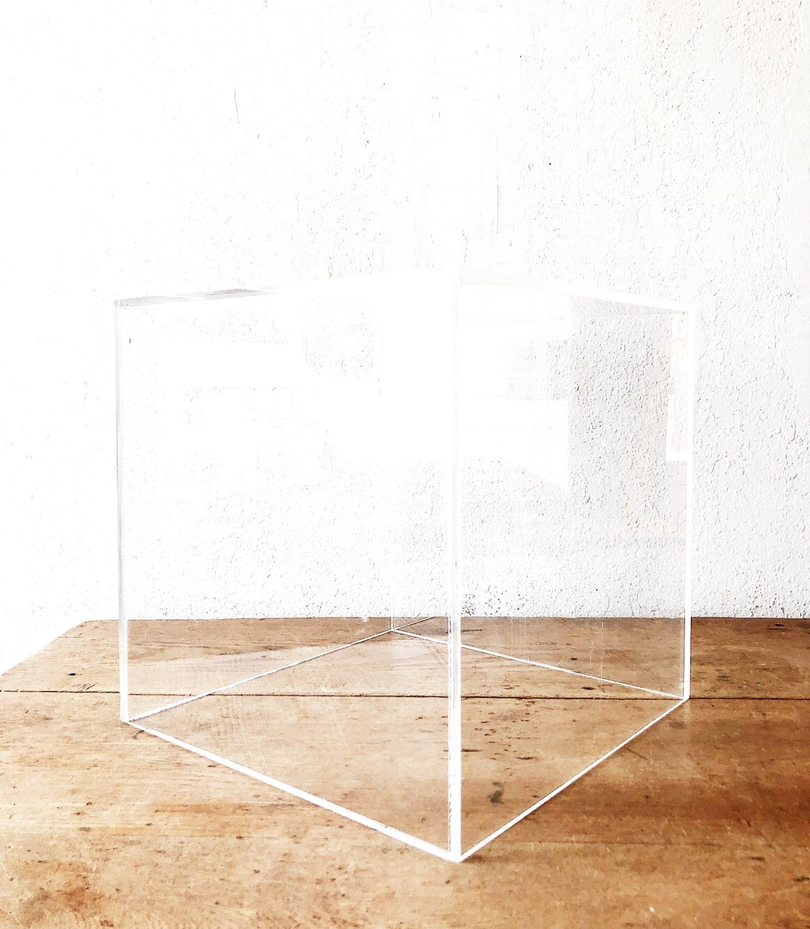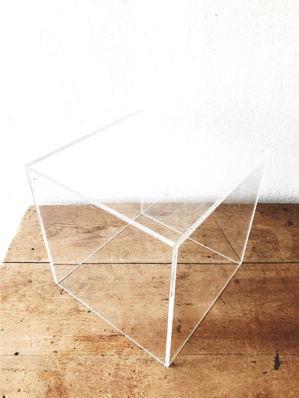 Nice side table or storage option. Clear heavy lucite has some superficial scratches on top mostly. May buff out with acrylic cleaner but mostly hidden with what you’d put on it